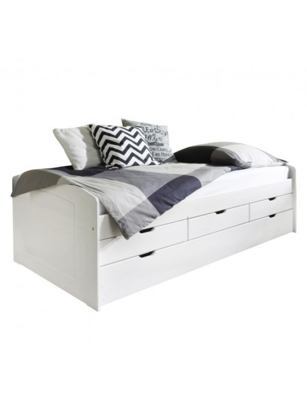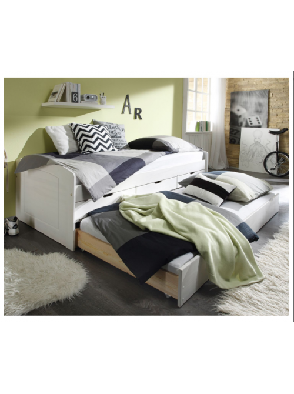 Модель состоит из двух независимых односпальных кроватей: верхний ярус - стационарная кровать с тремя выдвижными ящиками для белья, детских вещей или игрушек, и нижний ярус - выдвижная дополнительная кровать