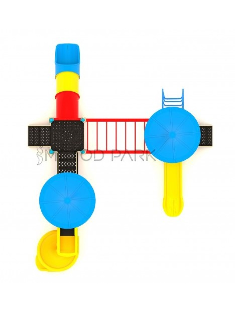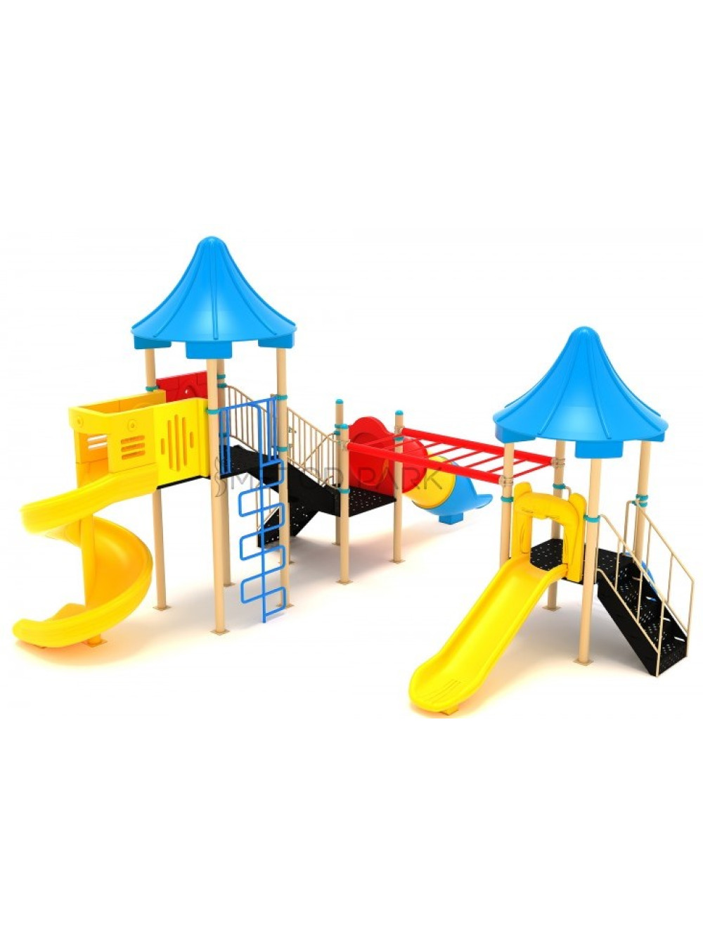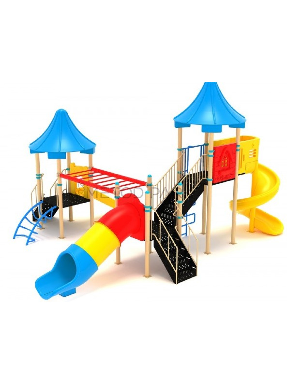 Игровой комплекс выполнен из металла. Электростатическая порошковая краска наносится на металлические детали путем пескоструйной обработки, оцинковки, полировки грунтовки или катафореза. Полиэтиленовые детали изготовлены из антистатического материала, безвредного для здоровья