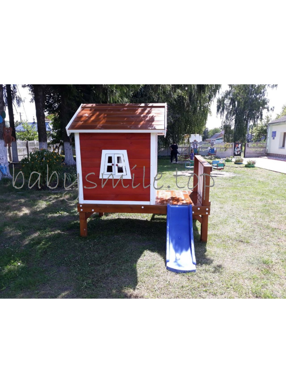 К тому же изделие в этом дизайне дополнено небольшой открытой верандой, которая может использоваться не только как мостик или переход, но и как дополнительное место для игр. Изюминкой этого домика являются двери в виде калитки, что особенно актуально жарким летним днём.