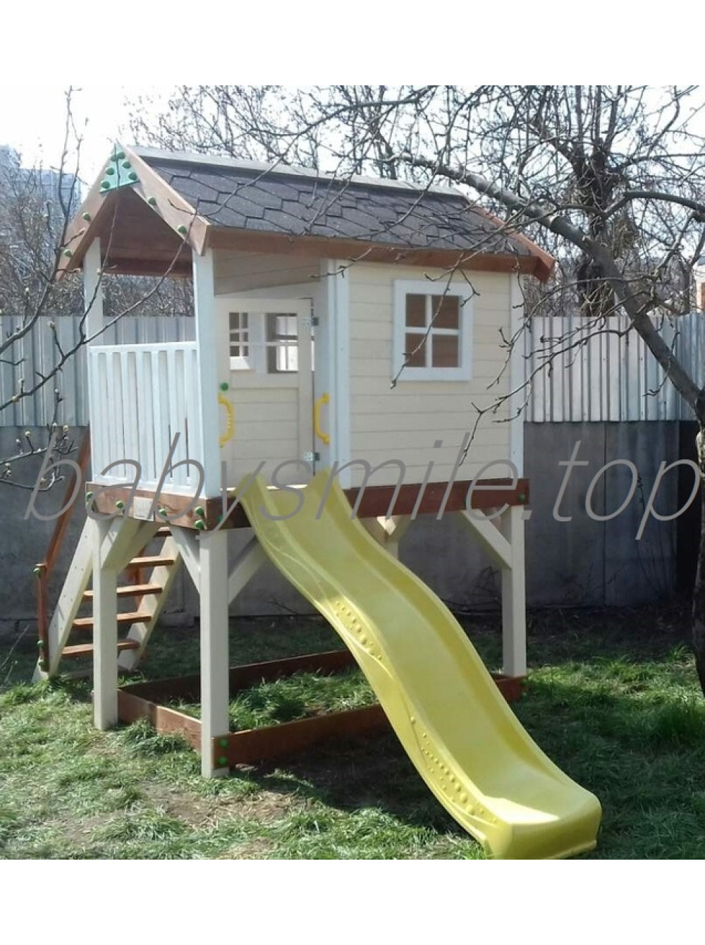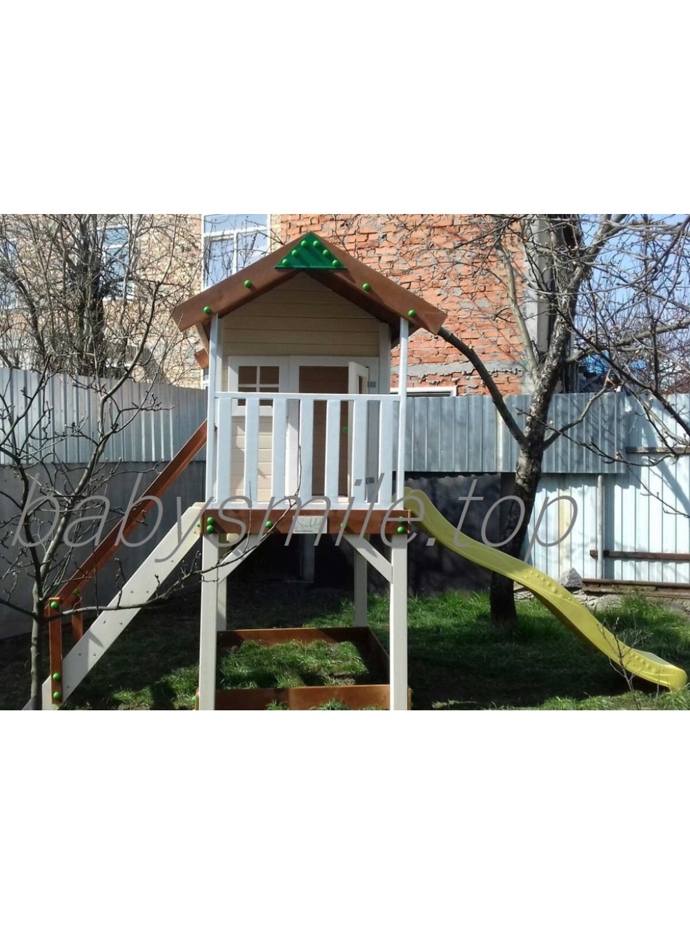 К тому же изделие в этом дизайне дополнено небольшой открытой верандой, которая может использоваться не только как мостик или переход, но и как дополнительное место для игр.