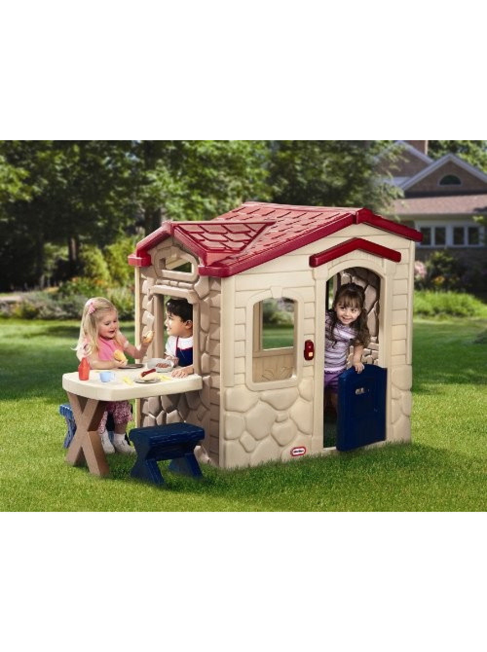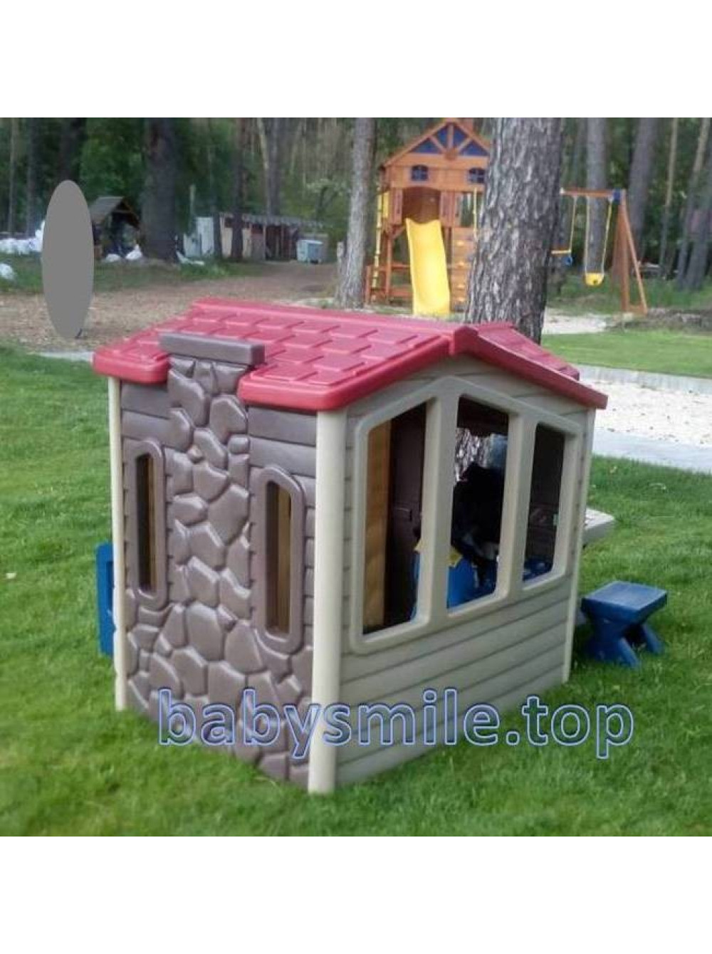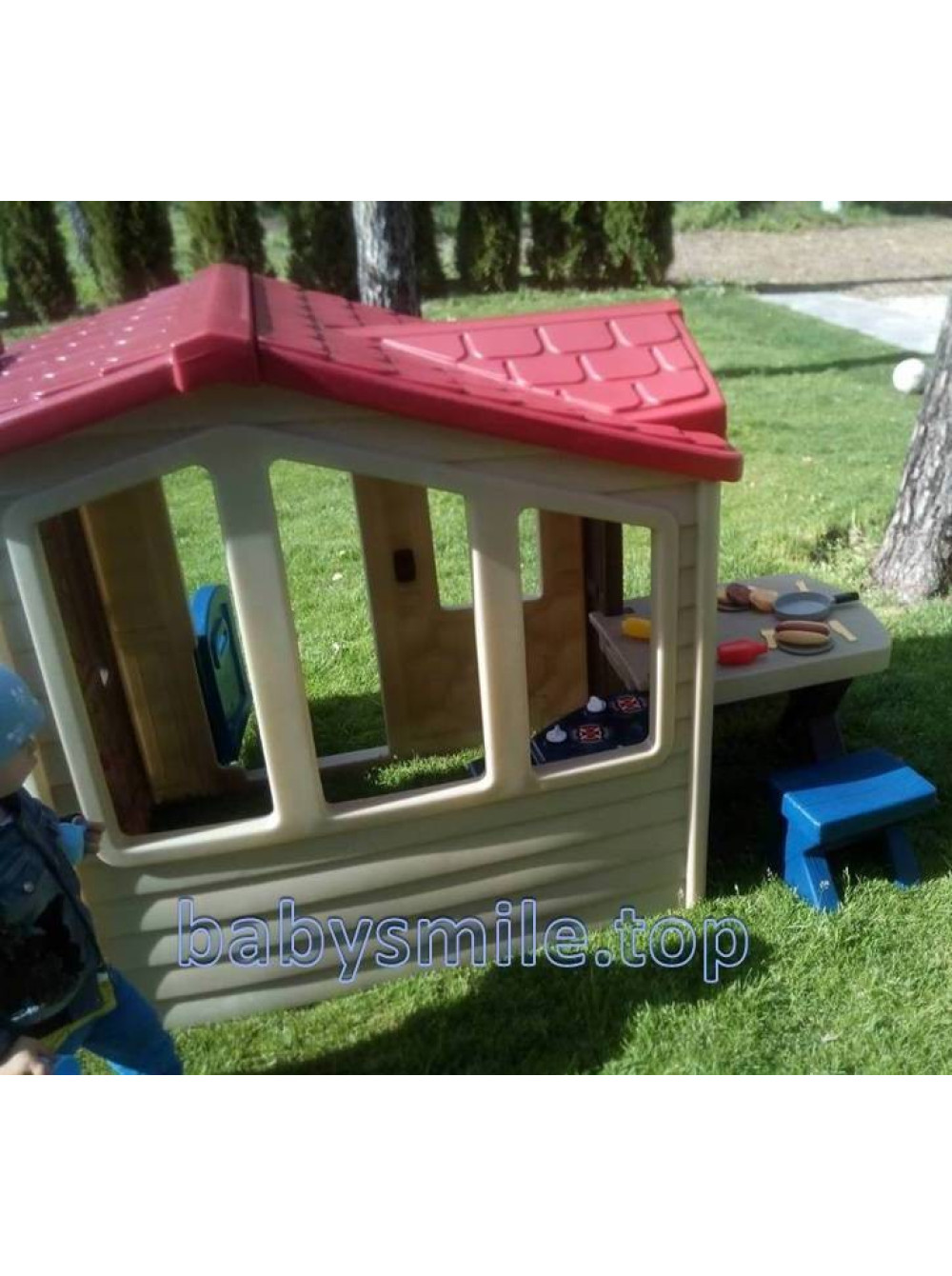 В комплект входит игровая утварь ( посуда) и игрушечный телефон и звонок с шестью мелодиями, который можно оживить с помощью батареек "ААА", их нужно 3 штуки ( в комплект не входят ). Строение выглядит очень современно и нарядно, стилизовано под каменную кладку в средиземноморском стиле. Встроенный выдвижной стол для пикника с лавками расширяет игровую зону возле домика. Достаточно лишь установить его и пикник может начинаться!