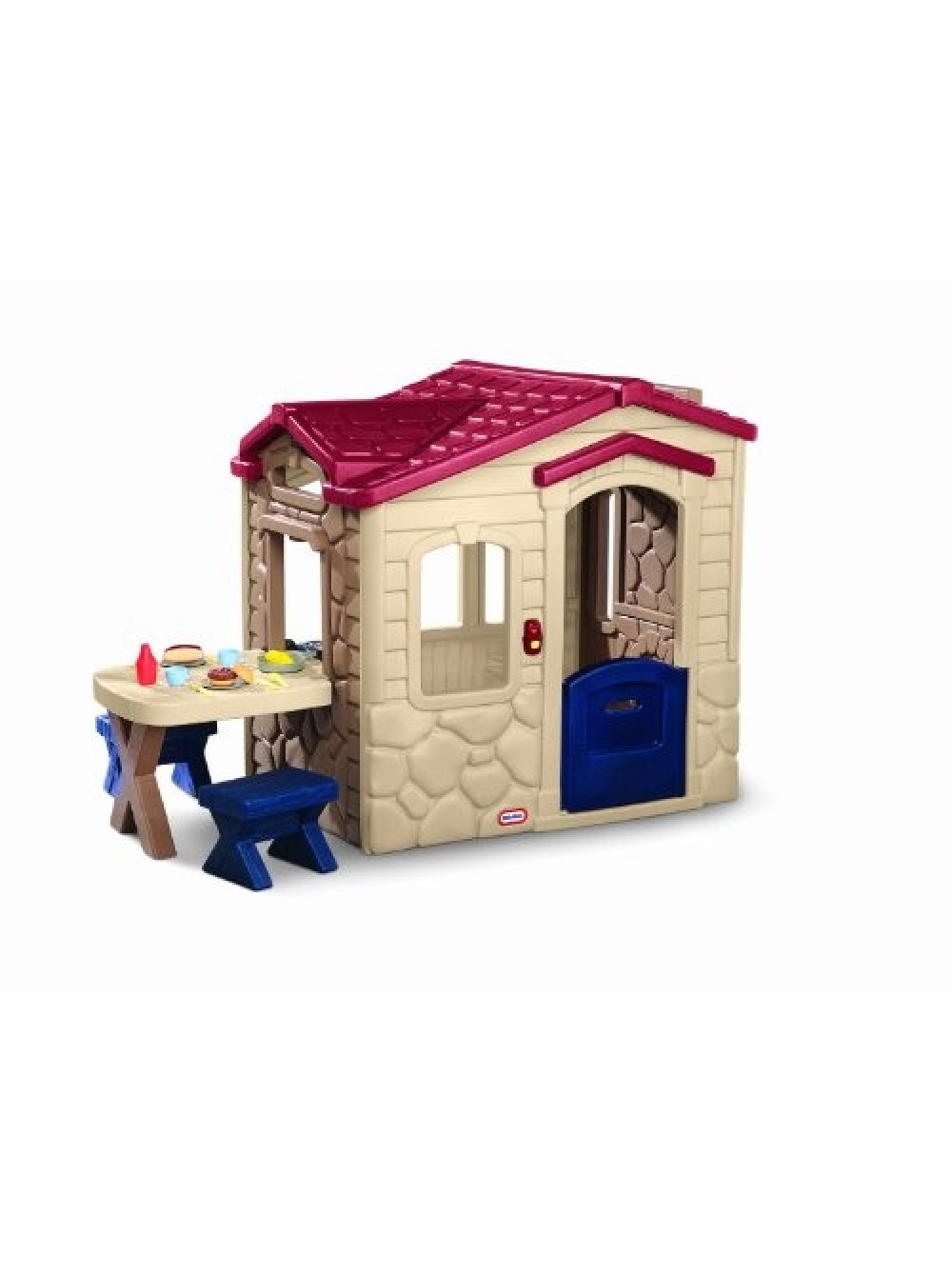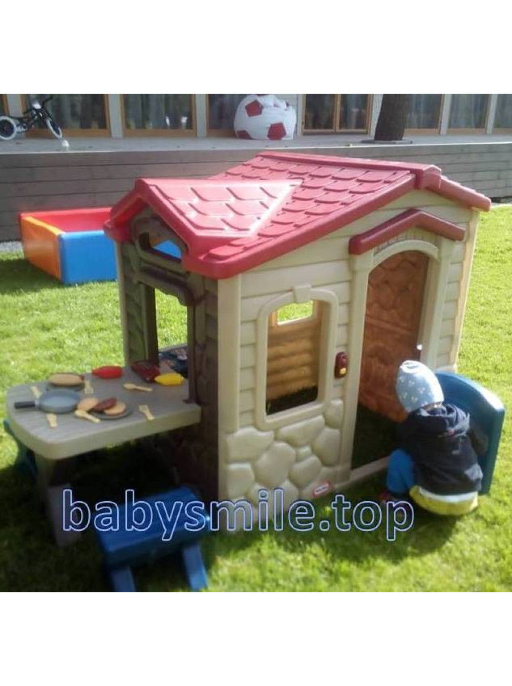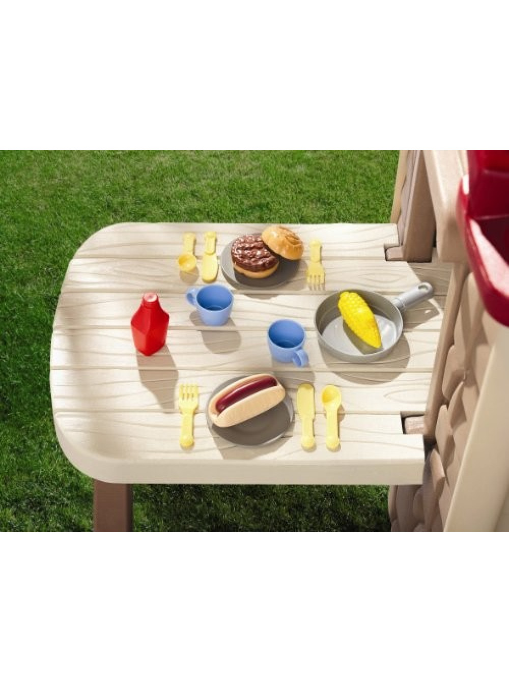 В комплект входит игровая утварь ( посуда) и игрушечный телефон и звонок с шестью мелодиями, который можно оживить с помощью батареек "ААА", их нужно 3 штуки ( в комплект не входят ). Строение выглядит очень современно и нарядно, стилизовано под каменную кладку в средиземноморском стиле. Встроенный выдвижной стол для пикника с лавками расширяет игровую зону возле домика. Достаточно лишь установить его и пикник может начинаться!