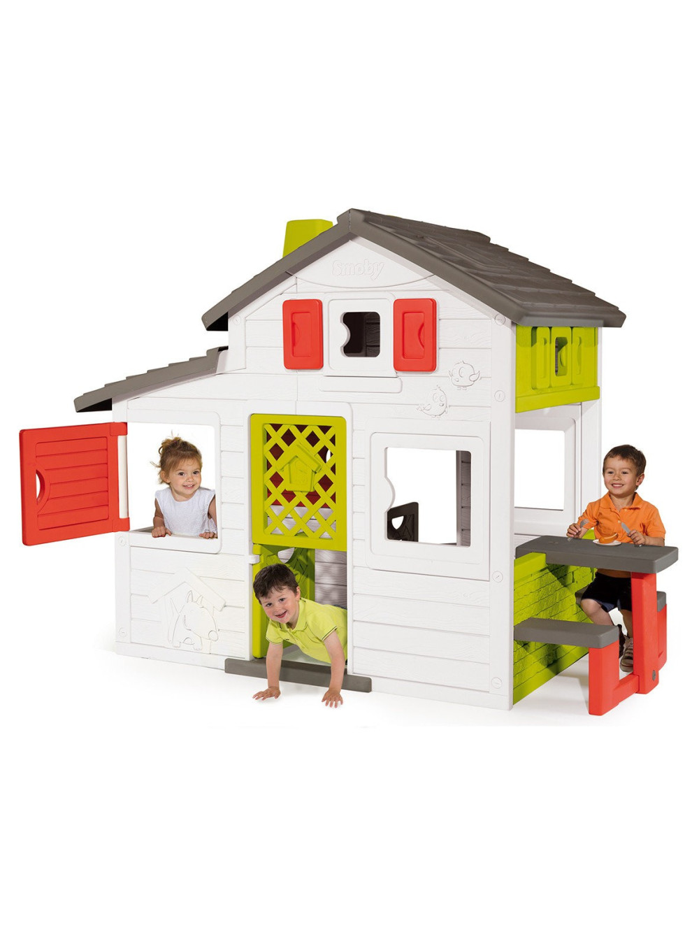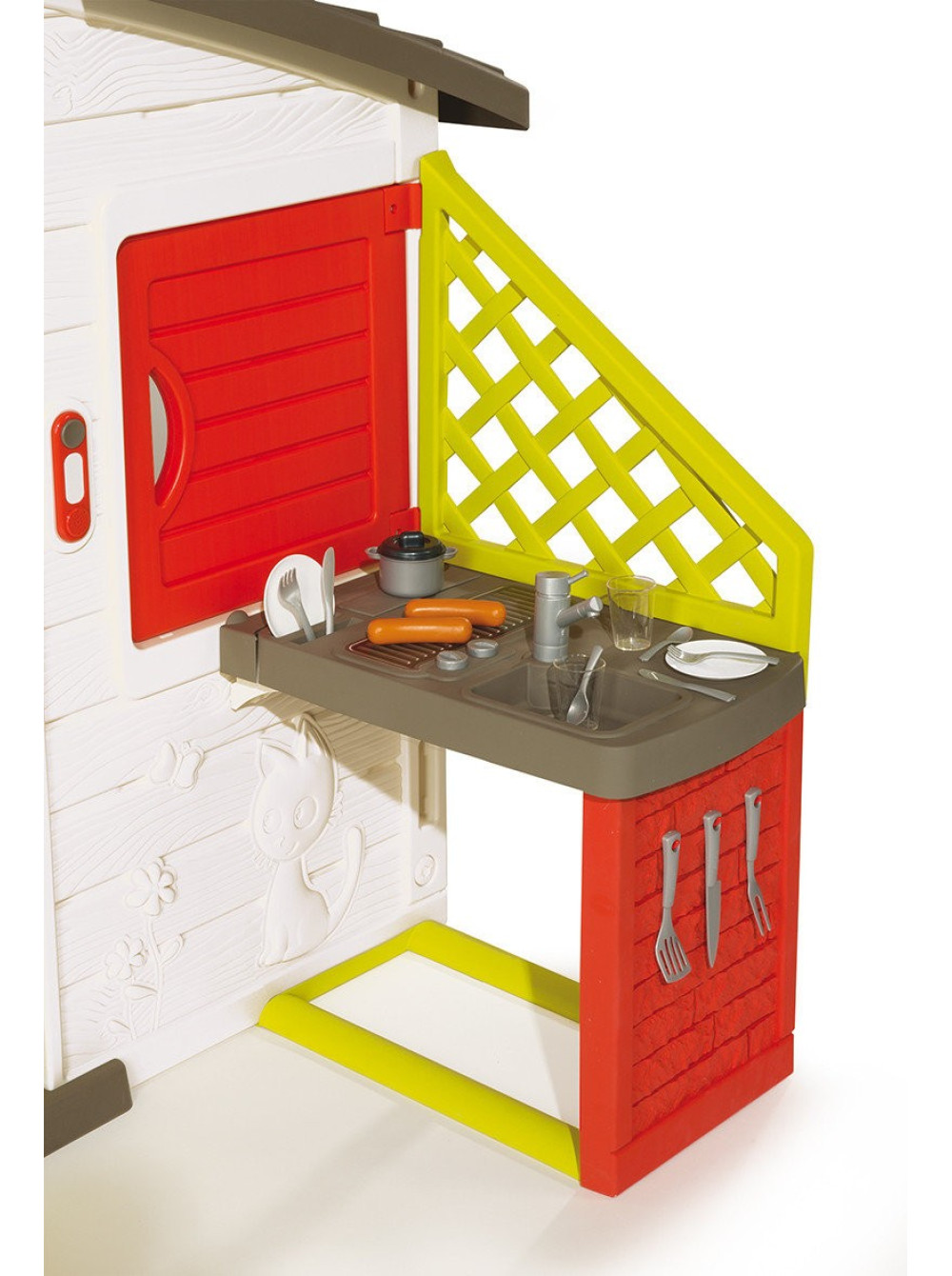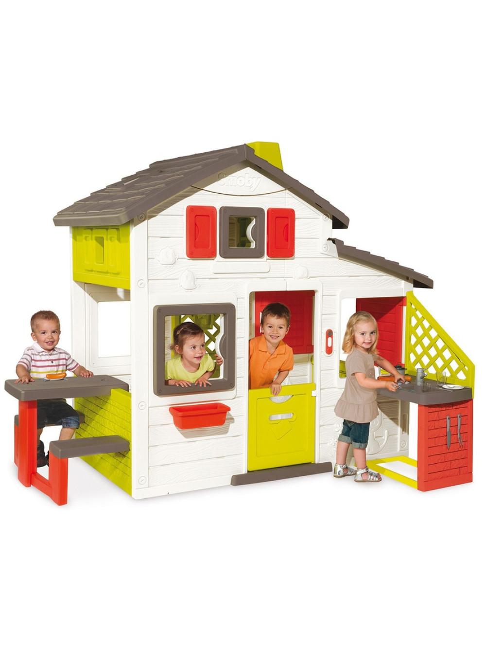 Игровой домик для детей с кухней Smoby - ещё один "хитовый" продукт от Французского бренда Смоби. Конструкция прочная и безопасная, оснащена кухонным уголком со столовыми приборами и столом с двумя лавками. Здесь малышня сможет и еду себе приготовить и насладиться пикником на открытом воздухе. В домике есть два больших окна и одно маленькое на чердаке, рабочий звонок для пришедших гостей.