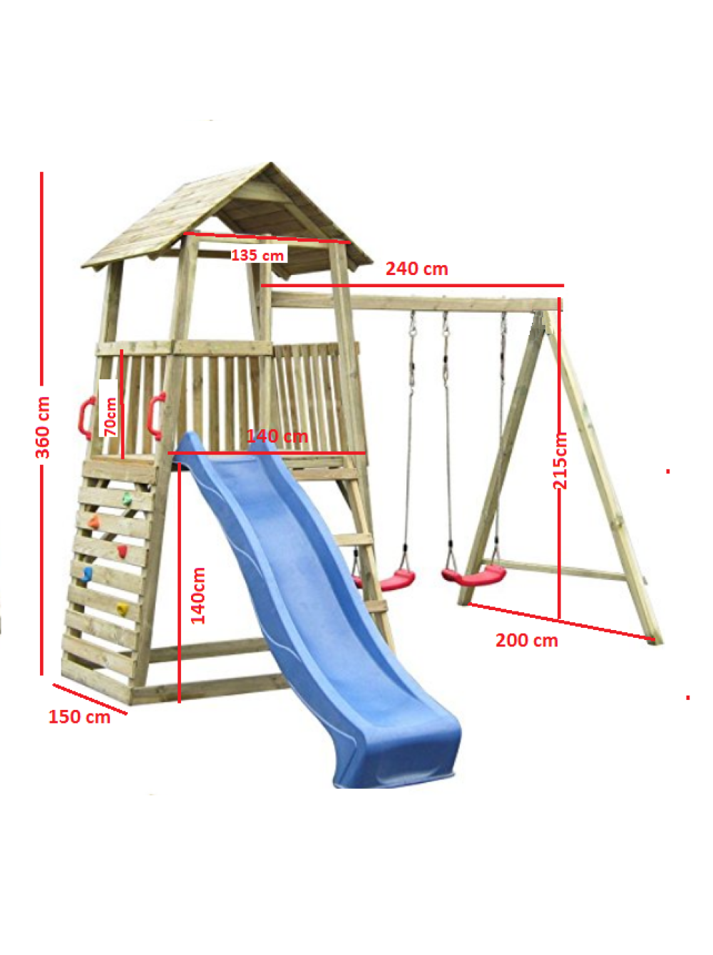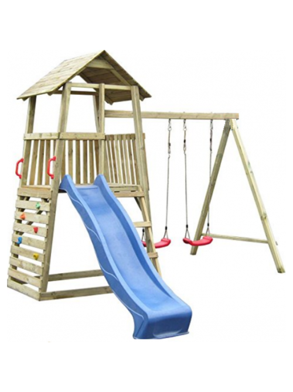 У этого детского комплекса очень хороший набор игровых элементов, их не много, но есть всё самое нужное. В комплектации две подвесные качели, поэтому маленькие гости будут для Вашего ребёнка только в радость,ему не нужно будет уступать свое место на качели, теперь он сможет качаться вместе с кем-нибудь из друзей. И конечно, как же без горки.Трехметровый пластиковый спуск выдерживает нагрузки до семидесяти килограммов, поэтому пользоваться им смогут двое детей одновременно. Также есть доска для скалолазания с двумя ручками для комфортного подъёма и при желании детвора сможет совместить игровой досуг с небольшими спортивными нагрузками. В нижней части площадки под домиком есть ниша, куда можно доставить песочницу.