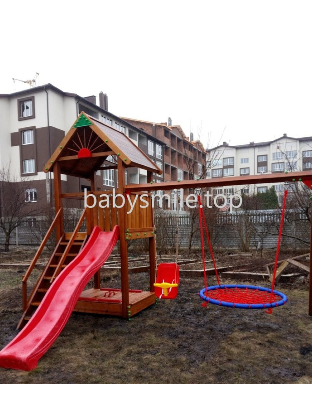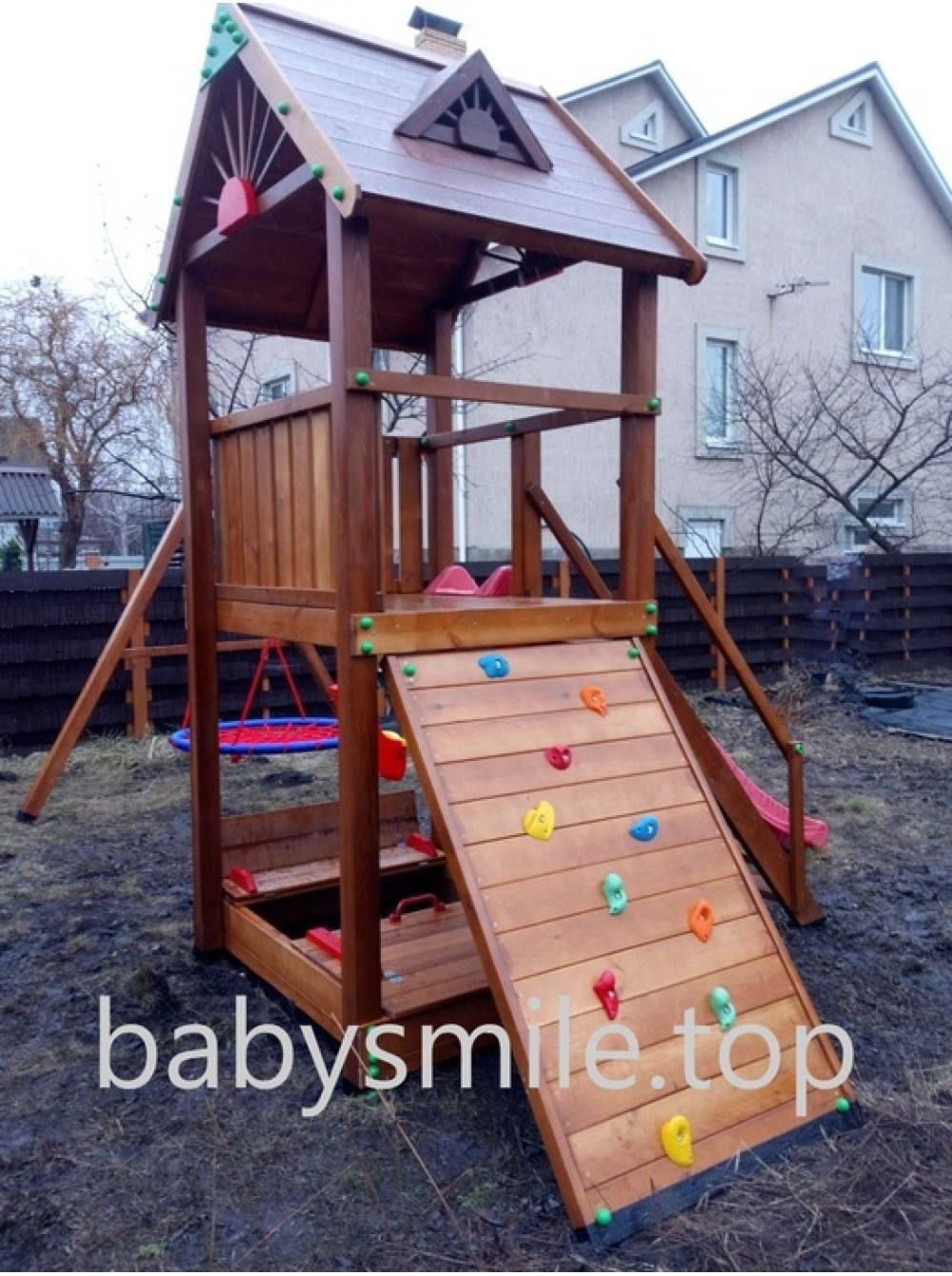 Компактный домик на сваях и под оригинальной крышей имеет практически все необходимые элементы для игры - скалолазная доска с зацепами, трехметровая горка, песочница с крышкой, которые при открытии трансформируются в лавки. И обязательно - две качели, модели которых, кстати, можно выбрать по желанию.