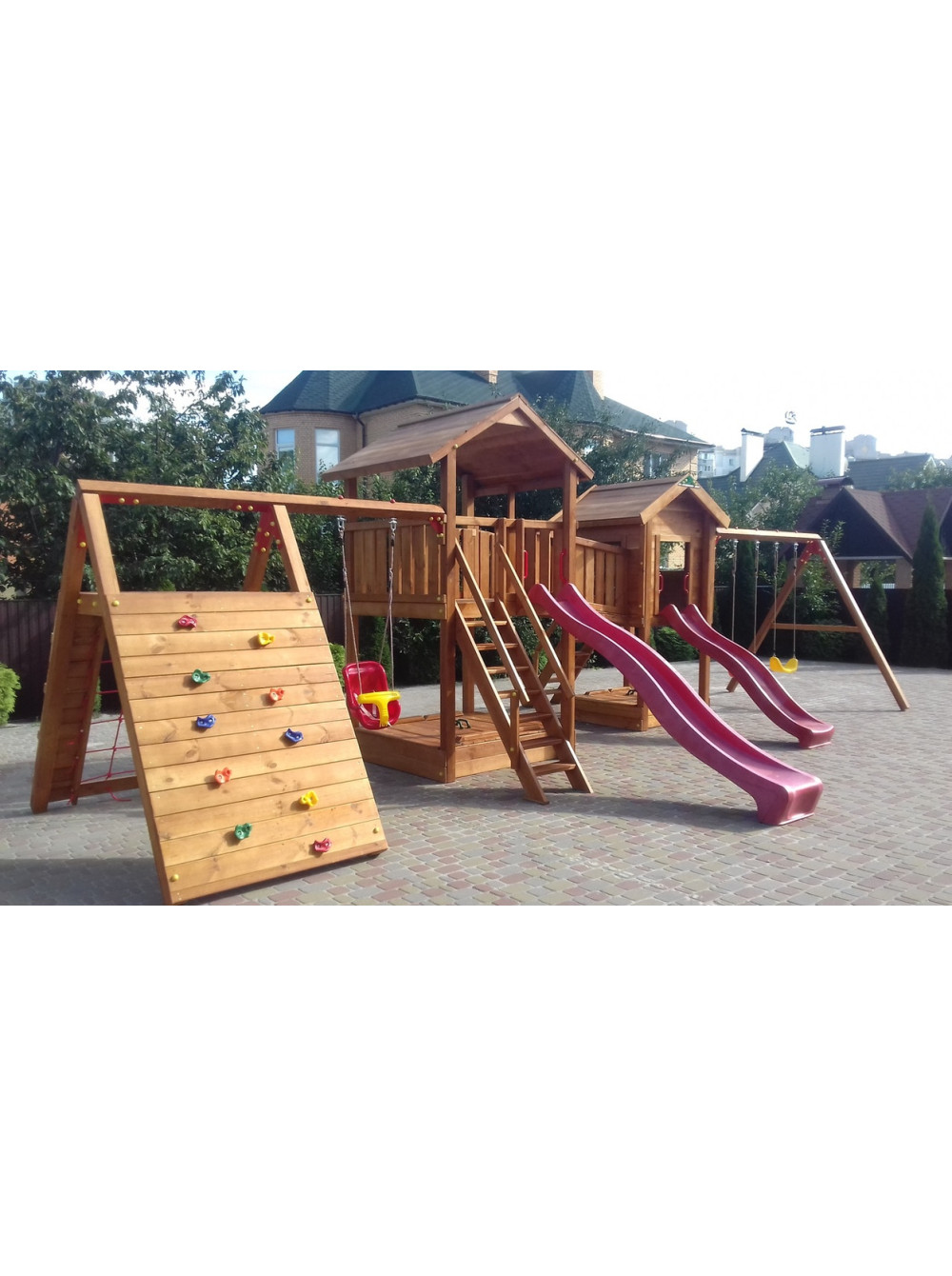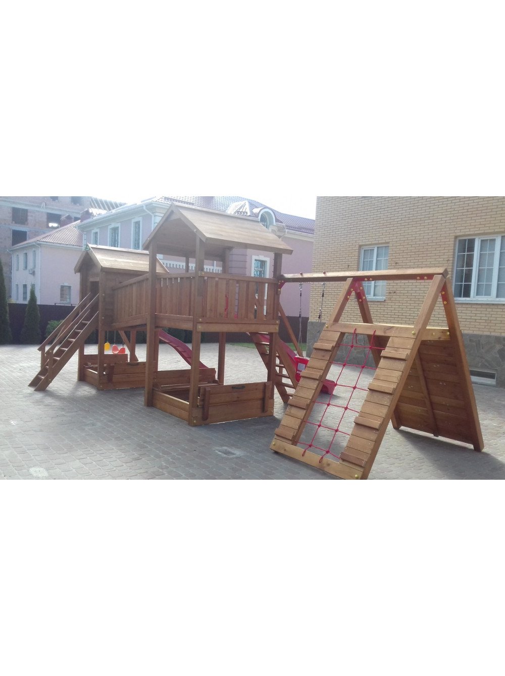 В комплекте две пластиковые горки, две песочницы с крышкой, которые при открытии трансформируется в две скамейки, широкий лаз с зацепами из камня и гладиаторской сеткой, три качели. Комплекс выдерживает нагрузки до 250 кг.