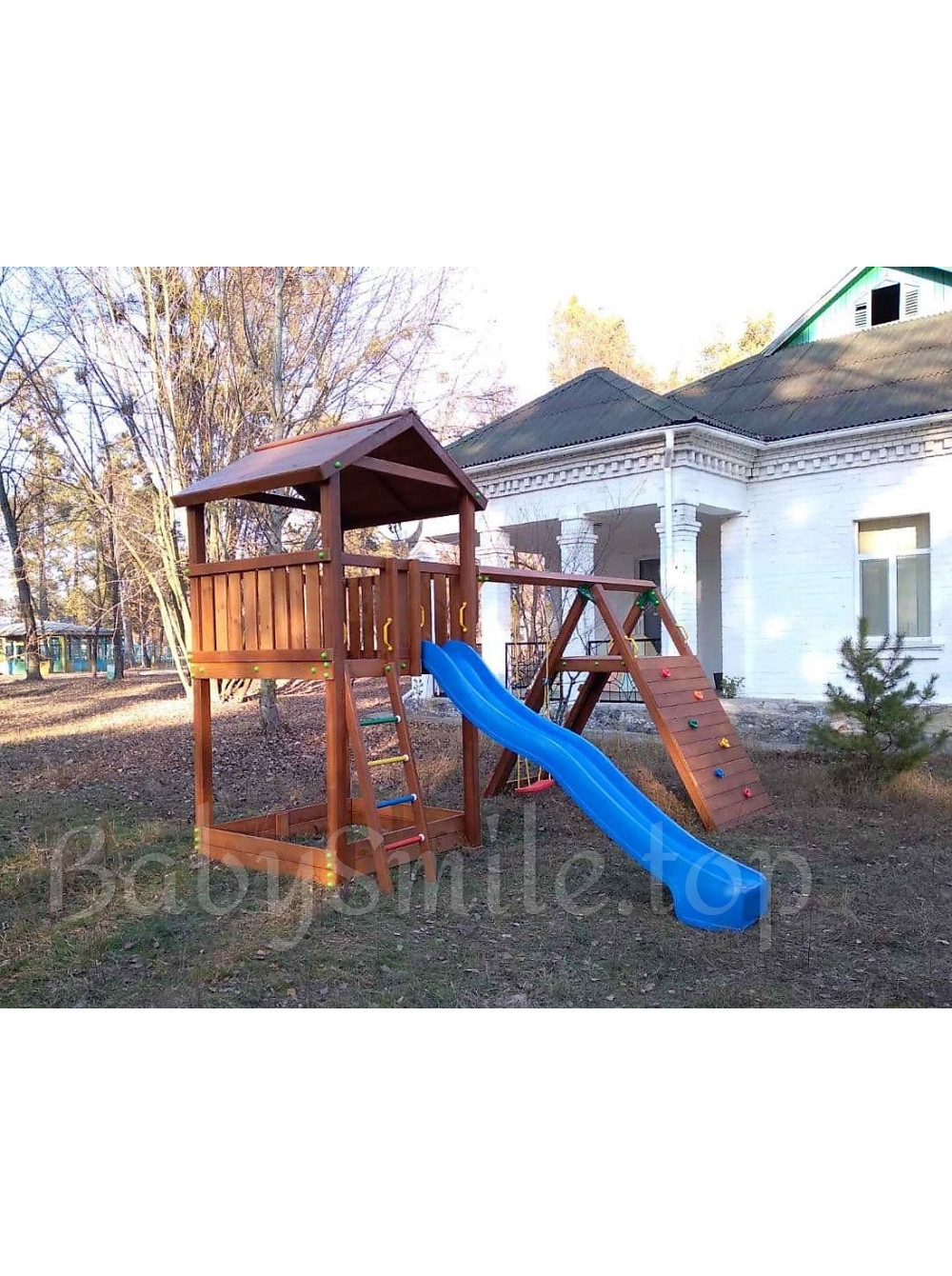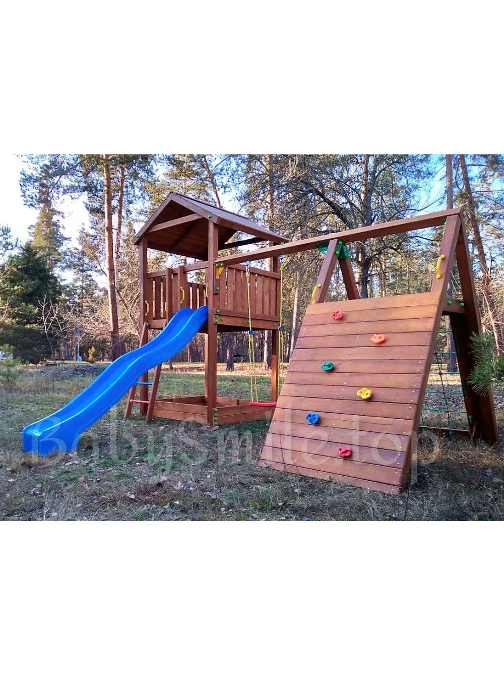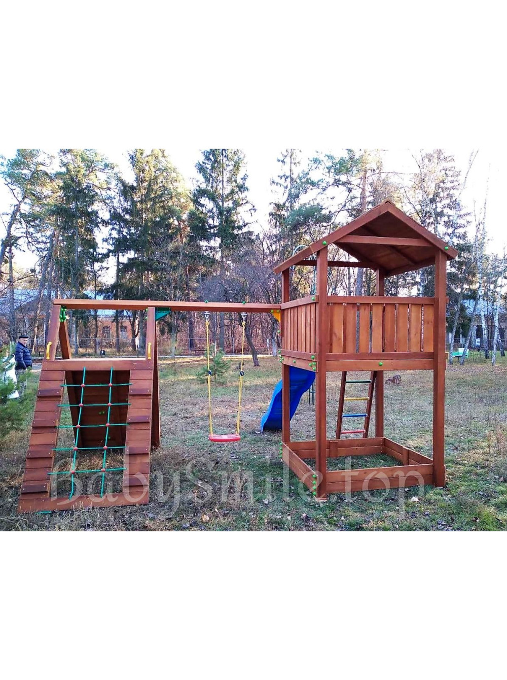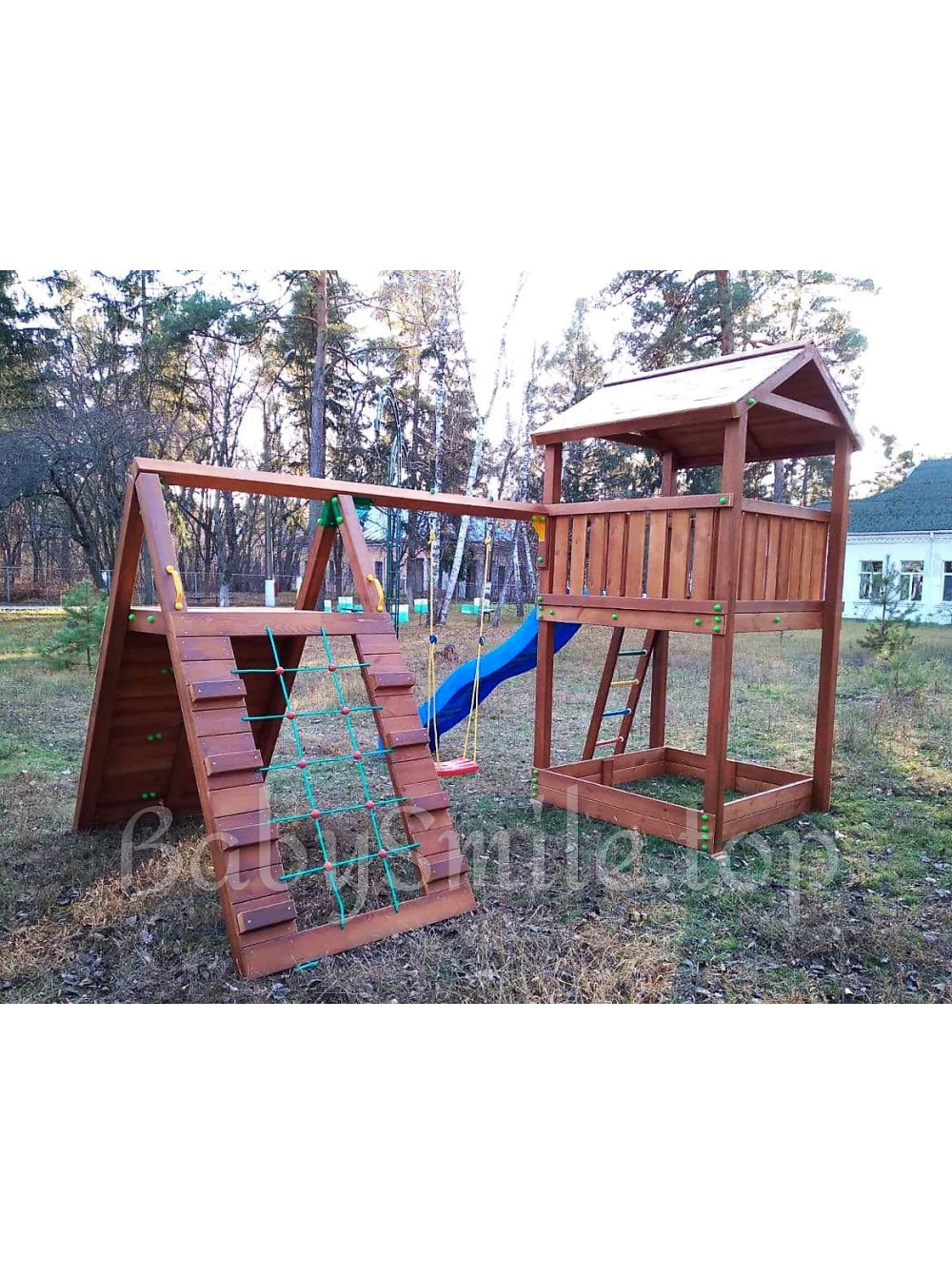 Детская игровая площадка из дерева Spielplatz-31 - замечательный игровой комплекс, изготовленный в соответствии с индивидуальными предпочтениями заказчика для пользования на общественной территории детского летнего лагеря отдыха в Киевской области. Традиционное цветовое решение, функциональное наполнение и дизайн. Нам нравится, что эта модель детской площадки укомплектована спортивно-игровыми элементами для более активного детского досуга.