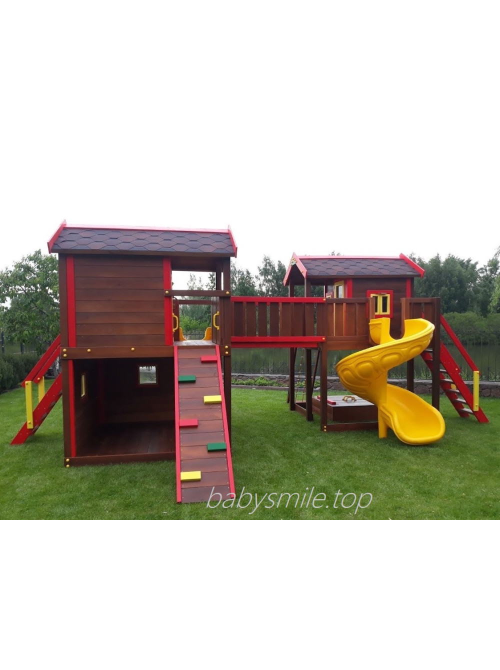 Здесь очень много игрового пространства. Два деревянных домика с балконами соединены между собой мостиком. Внизу каждого есть дополнительное место для игр - песочница с крышкой и лавками и открытая веранда, которую при желании можно укомплектовать какой либо мебелью. Под мостиком рекомендуем подвесить любые качели. Детские домики вполне реалистичны, в них открываются окна и двери. И еще актуальный спортивный акцент в дополнение - пиратская сетка и доска для скалолазания.