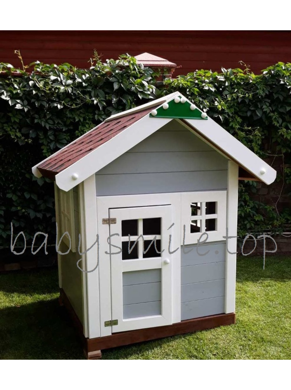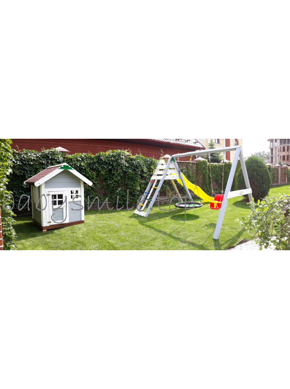 В данном случае, покупатель решил убрать башню из игрового комплекса и поставить её отдельно в игровую зону в виде детского деревянного домика. По мнению заказчика получилось очень даже не плохо. Поддерживаем, нам также понравилось.