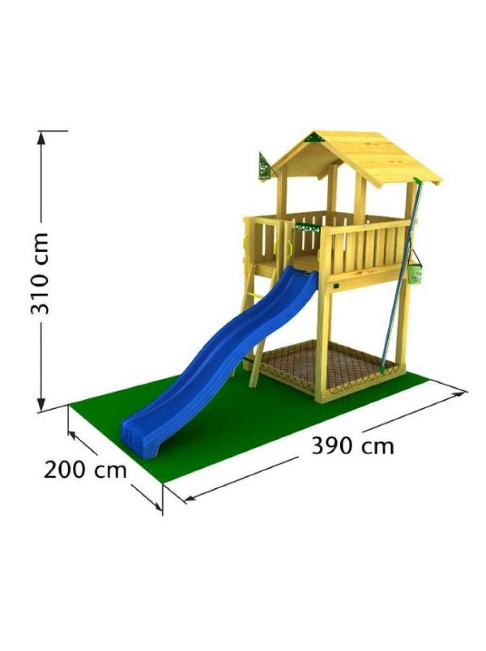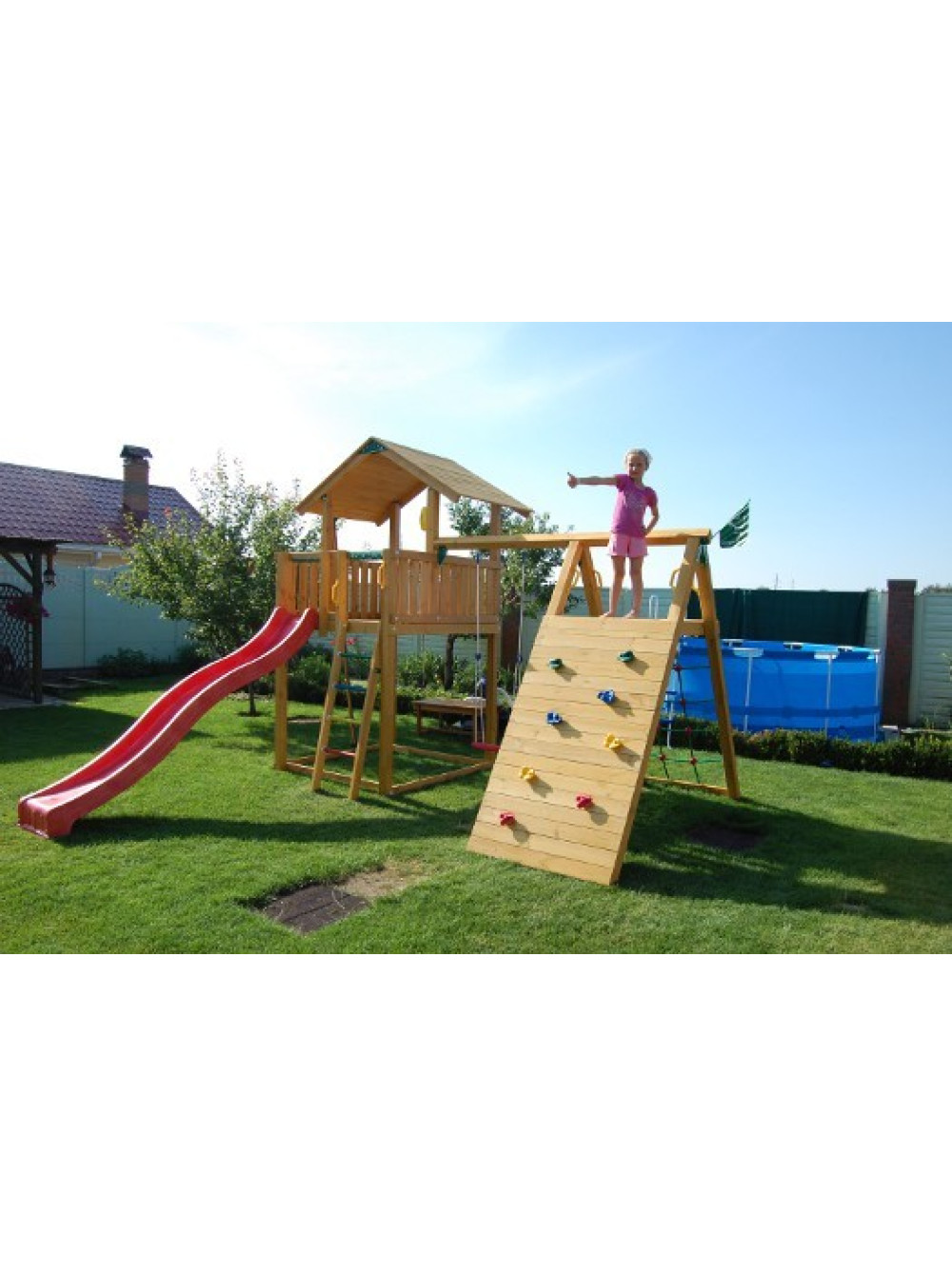 Эта игровая площадка оборудована широкой башней с большим верхним балконом и имеет всё нужное оснащение для беззаботного досуга детворы. Наличие горки, рулевого колеса, корзины для поднятия игрушек, телефона, в котором нажимаются кнопки и издаются звуки поможет Вашей ребятне придумать массу игр и мероприятий для организации активного и интересного досуга.