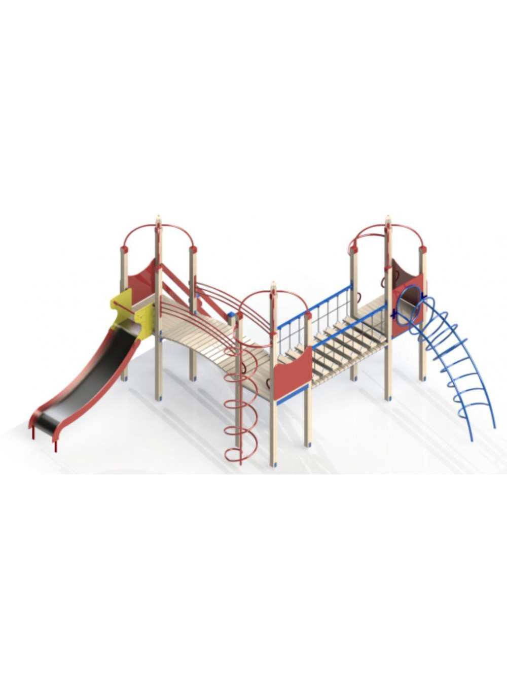 Интересный комплекс для игр на улице с мостиками, горкой и разными подъёмами.