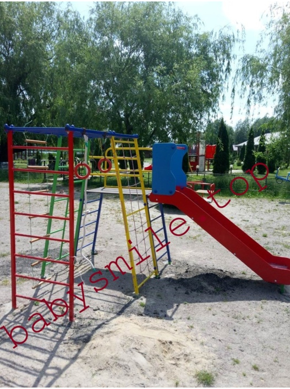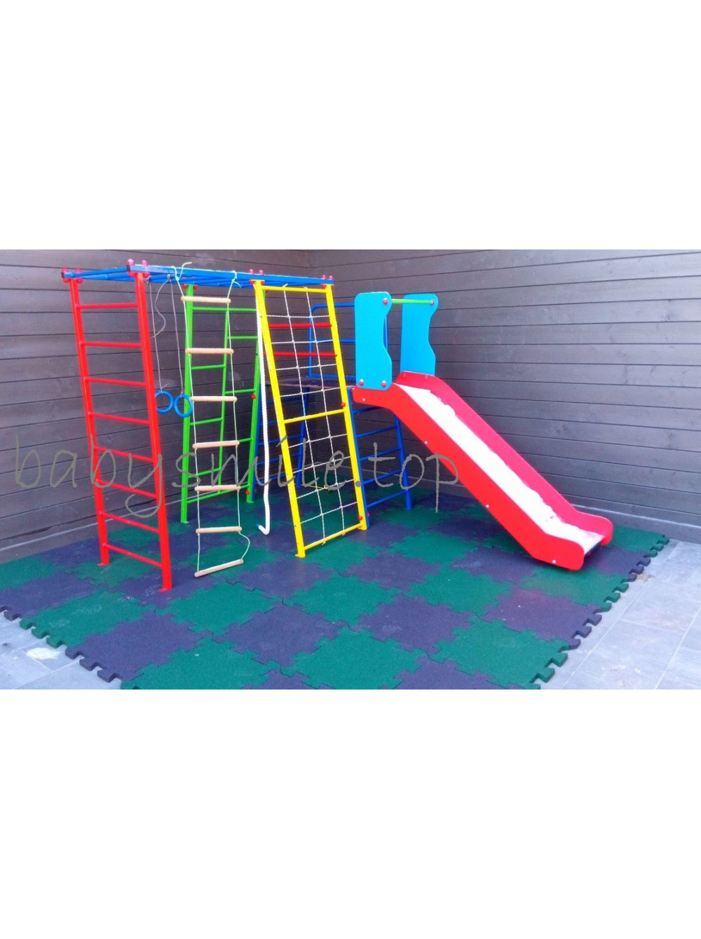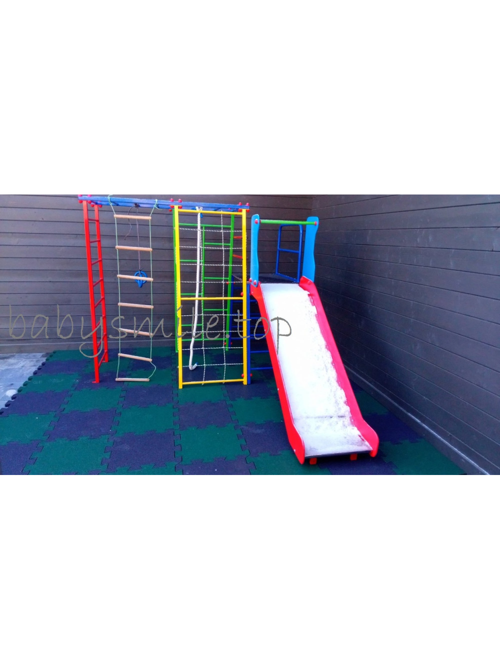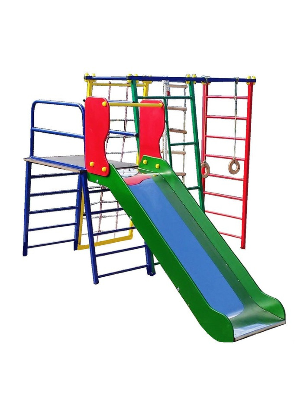 Кроме традиционного катания с горки здесь предусмотрены элементы для занятий спортом и физических нагрузок: канат, лесенка, гимнастические кольца и несколько стационарных лестниц. Изделие выполнено из металла с горкой из нержавеющей стали.
