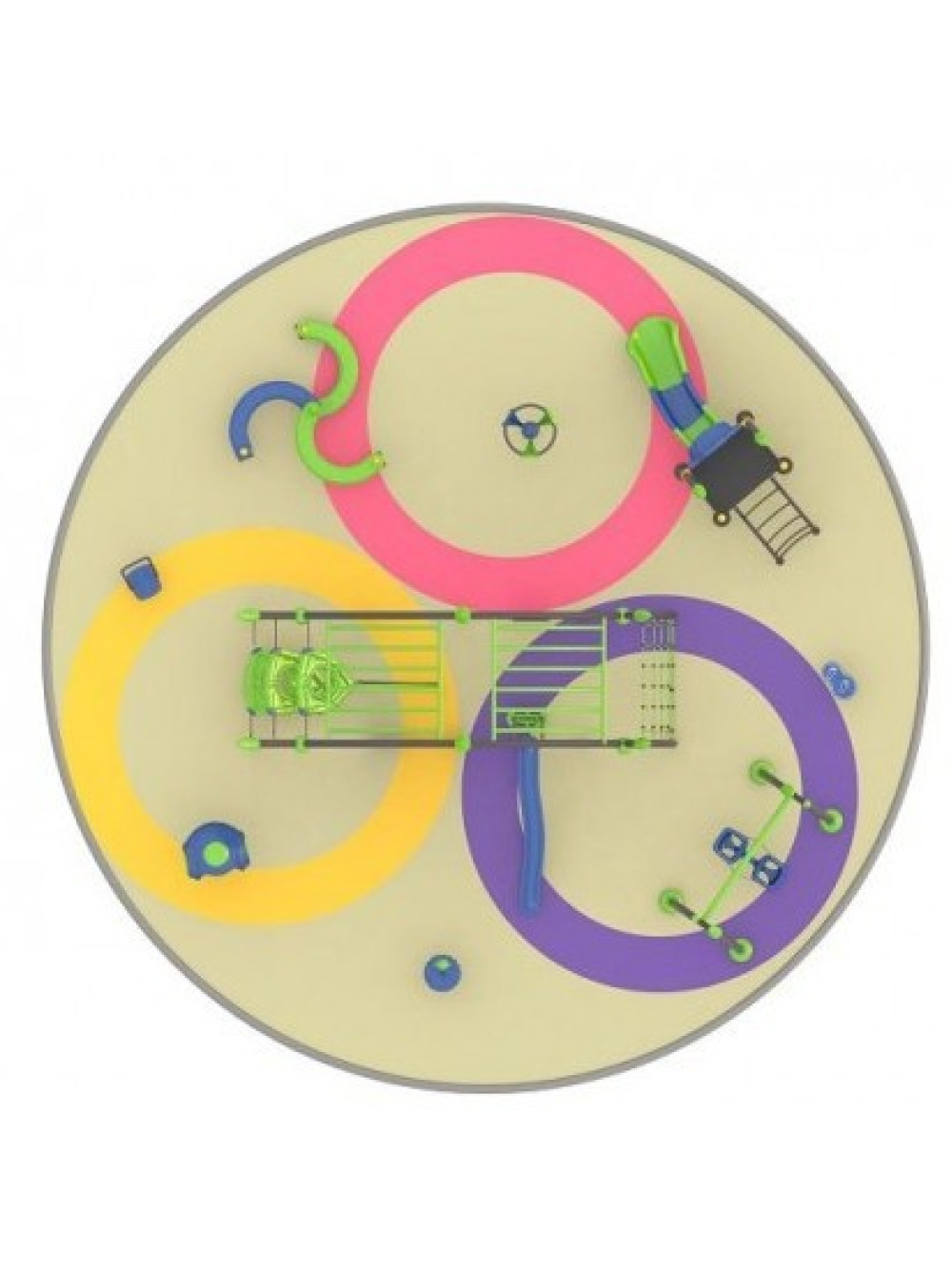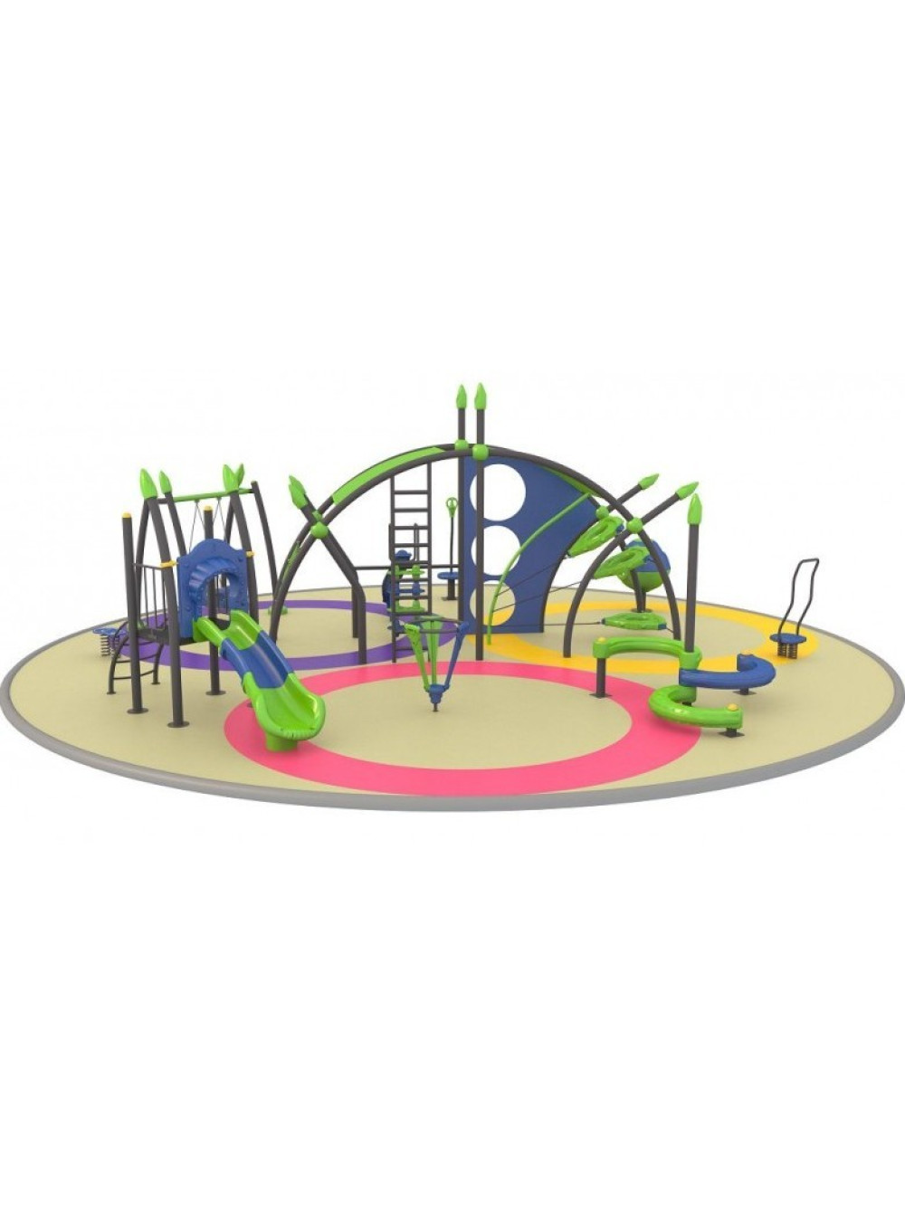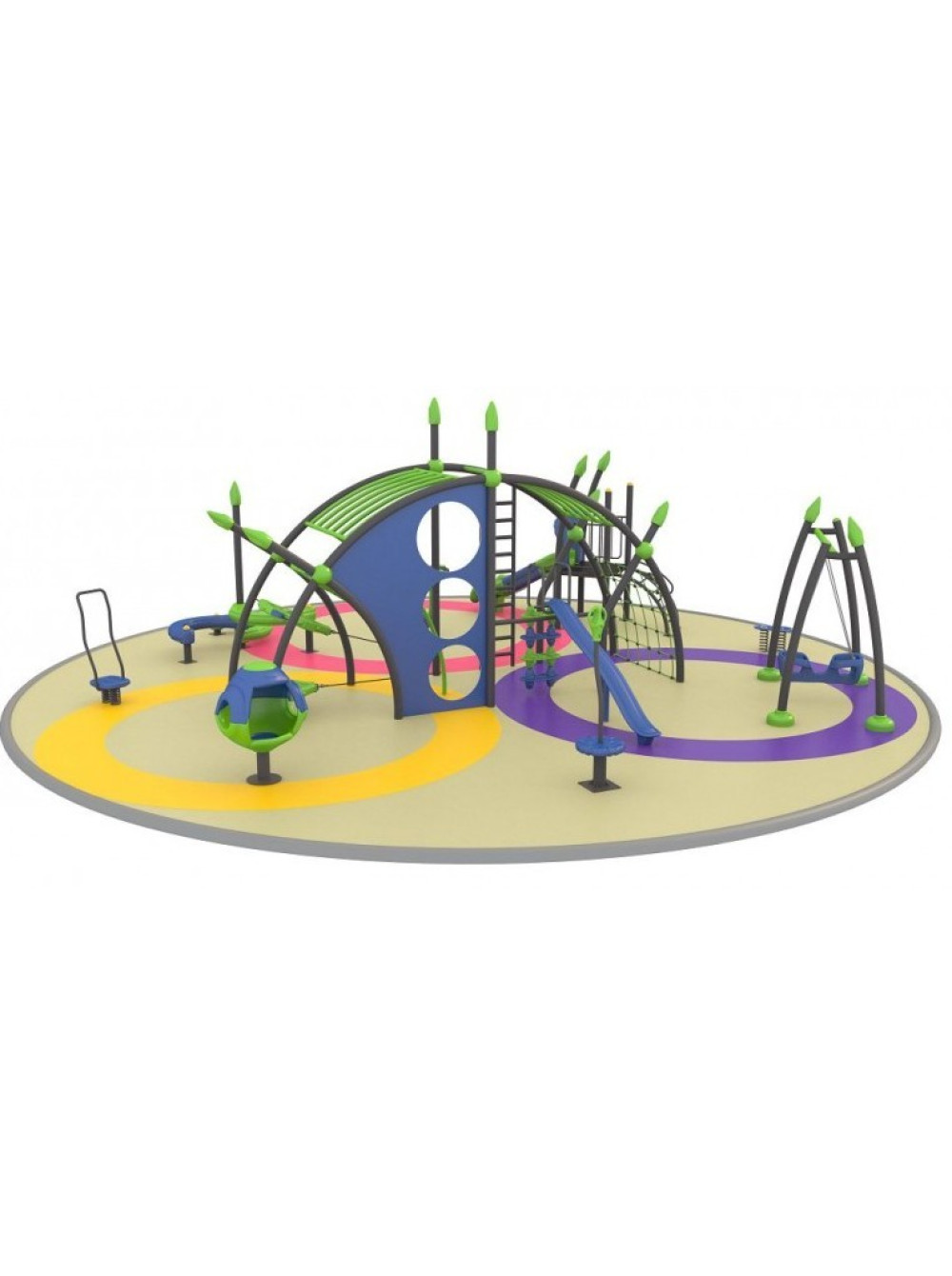В этом комплексе вместе собраны и объединены различные игровые элементы: качели-пружинка, канатная сетка, качели, доска для лазаний, степ платформы, горки, спортивно-игровые тренажёры. Здесь есть всё для весёлых, занимательных и безопасных иго детворы.