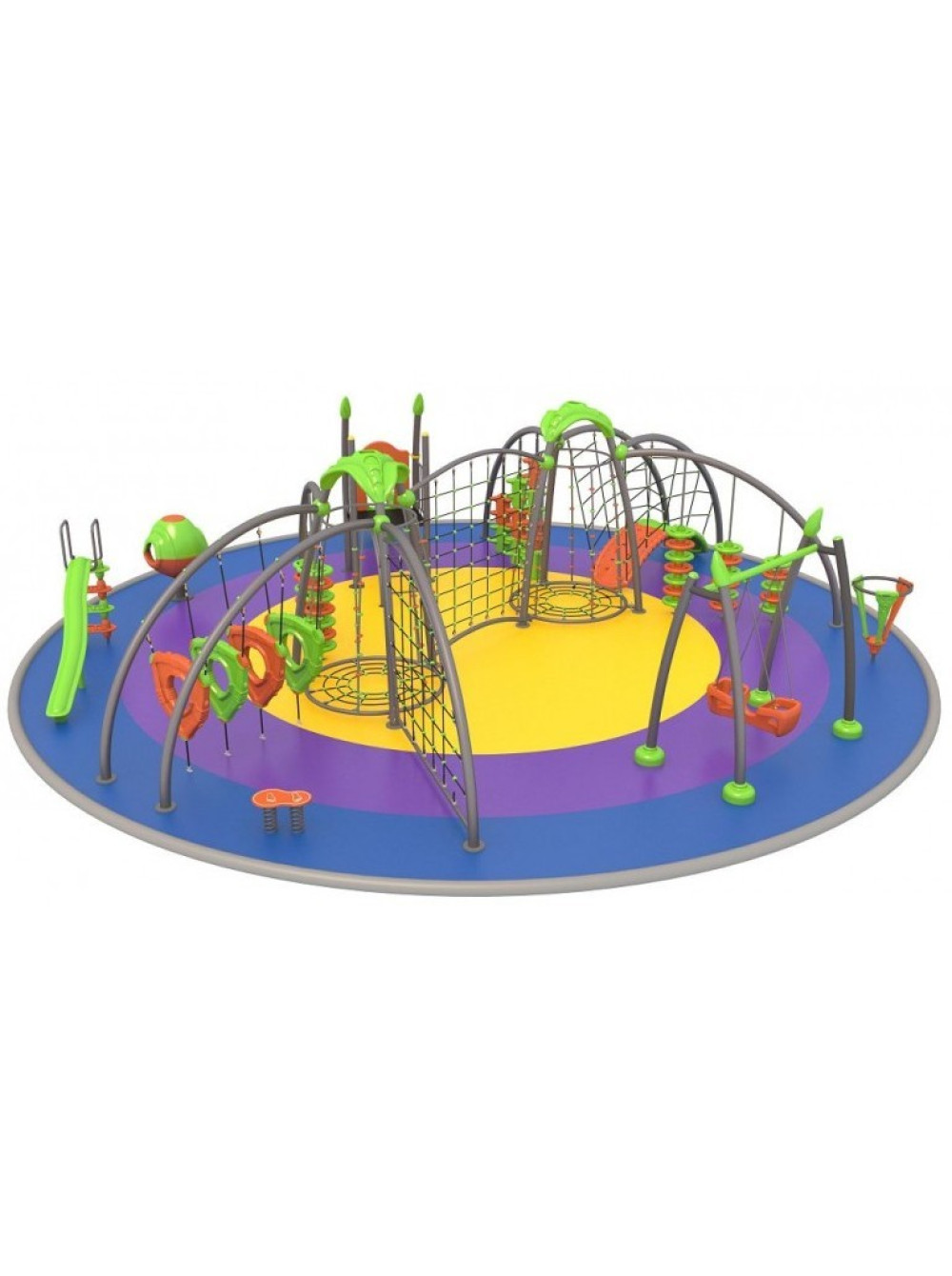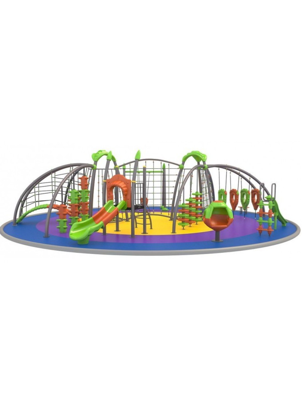 В этом комплексе вместе собраны и объединены различные игровые элементы: качели, канатные сетки, степ платформы, доска для скалолазаний, спортивно-игровые тренажёры, горка. Здесь есть всё для весёлых, занимательных и безопасных игр детворы.