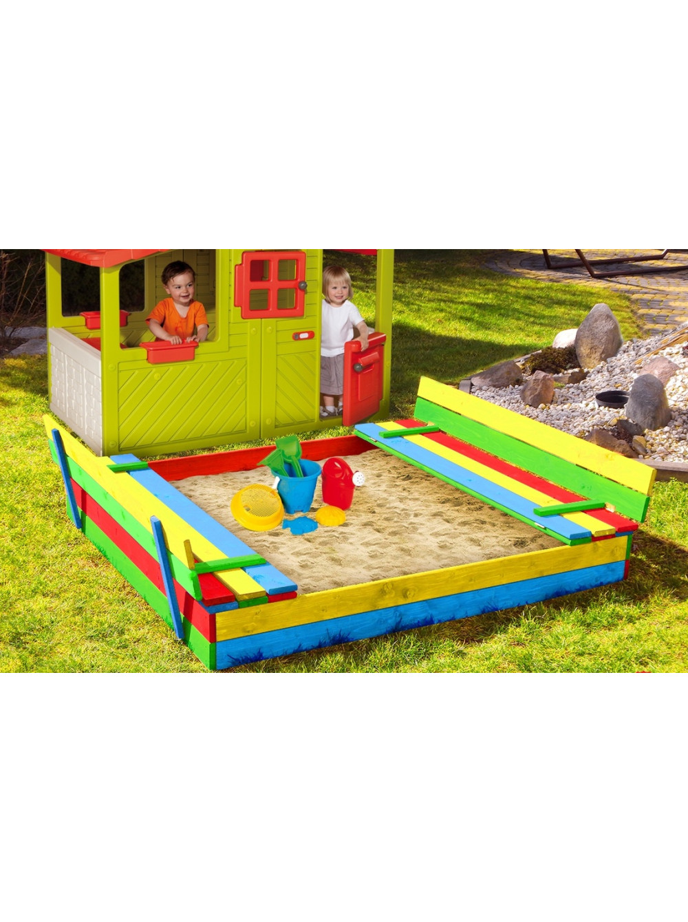 Песочница 150 см для детей с лавками это настоящая находка для семьи, где есть дети. Выполнена из деревянного бруса хвойных деревьев, окрашена в радужные тона и дополнена крышкой, что бы Ваш песочек всегда был чистеньким и сухим.