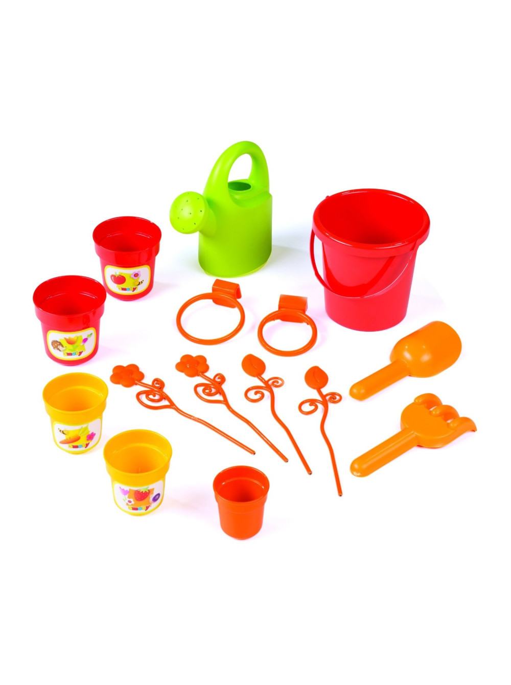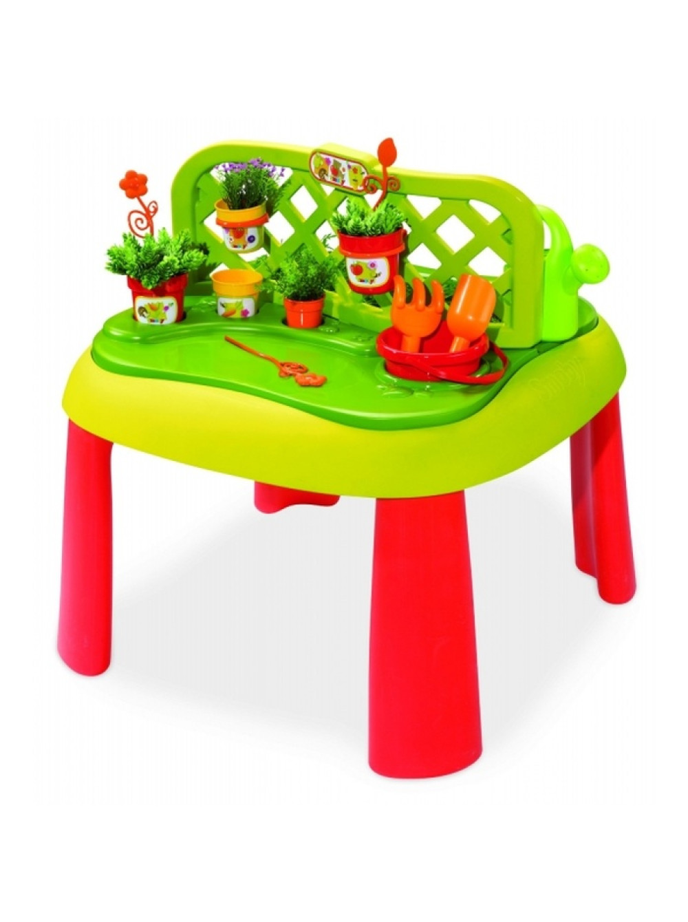 Поверхность стола разделена на две части ажурной перегородкой, одна с лотком предназначена для игр с песком и водой, который снимается для удобной чистки и ухода за ним. Другая - это место для садового инвентаря и горшечных растений: лопата, грабли, ведро, лейка, горшки для растений и несколько цветов. К тому же при желании в эти горшочки можно посадить и живые цветы и ребёнок сможет всё лето за ними ухаживать, набираясь опыта садовода и приятно проводя время.