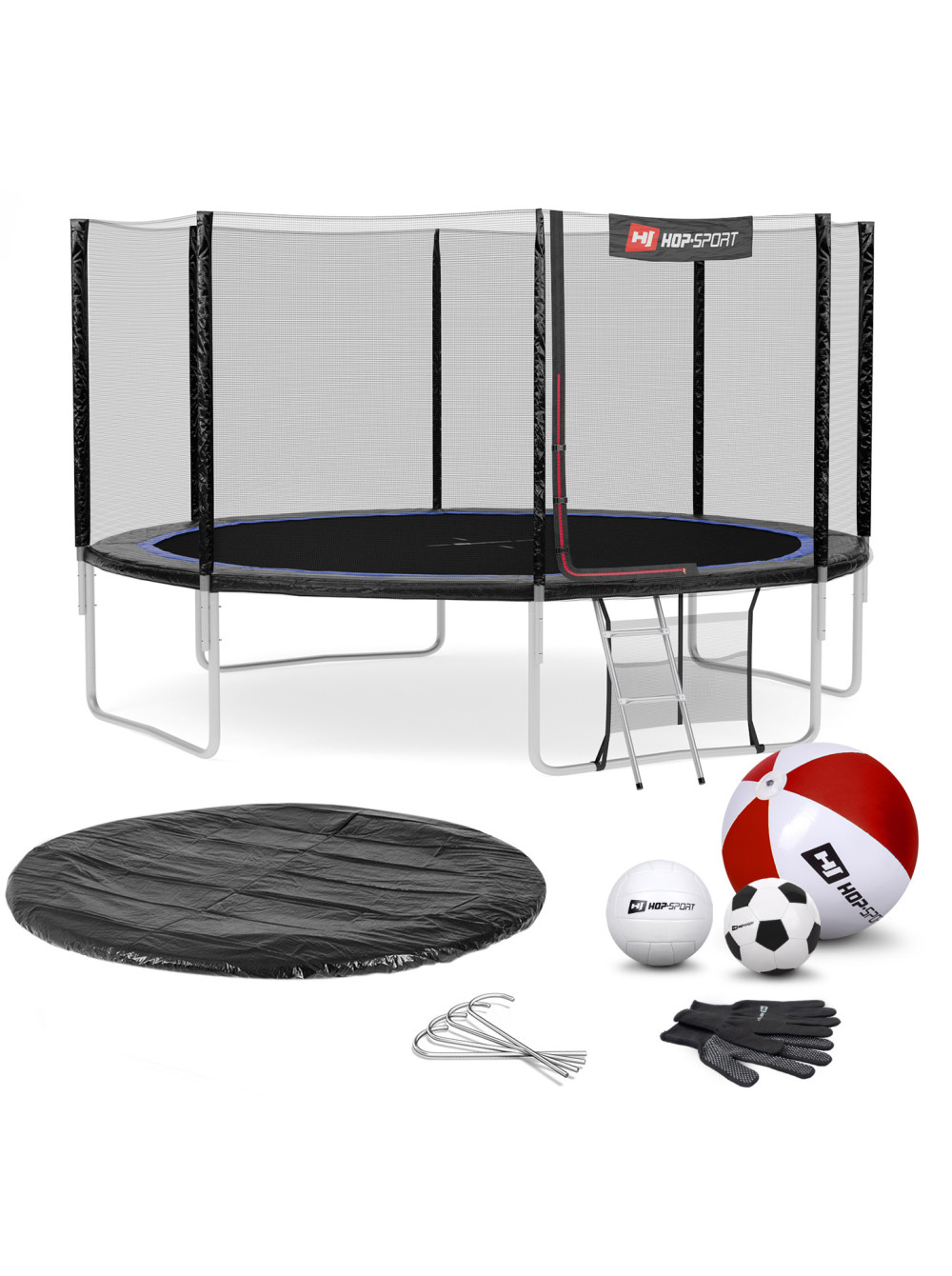 - Состав комплекта: батут с защитной сеткой, набор для монтажа, анкера для крепления в землю, чехол для хранения батута, два мяча (пляжный и волейбольный), лестница.