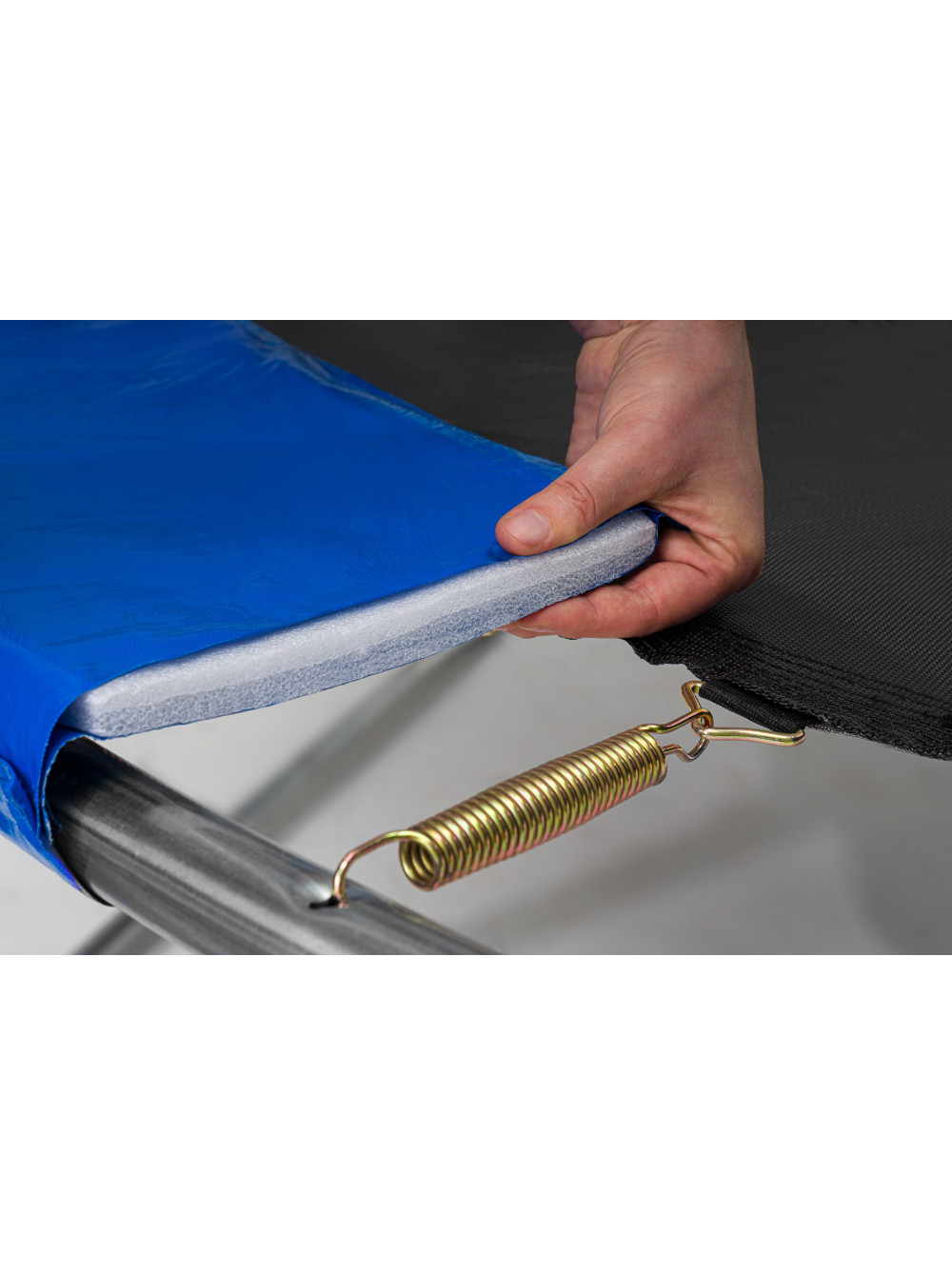 - Защитный край из водостойкой ткани снаружи и вспененного материала внутри минимизирует вероятность контакта с металлическими составляющими батута.