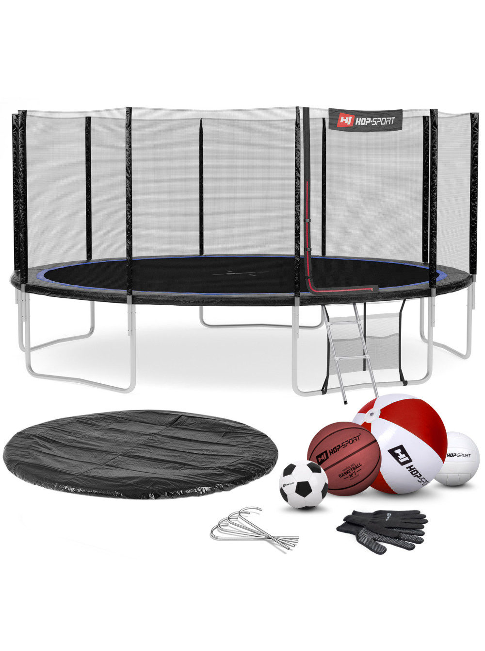 - Состав комплекта: батут с защитной сеткой, набор для монтажа, анкера для крепления в землю, чехол для хранения батута, два мяча (пляжный и волейбольный), лестница.