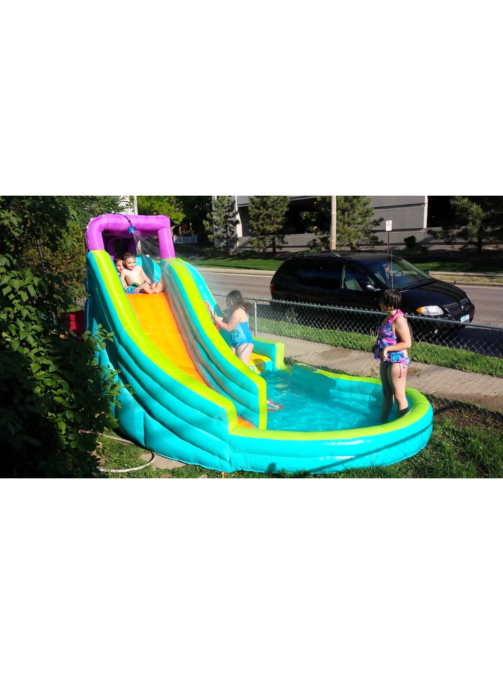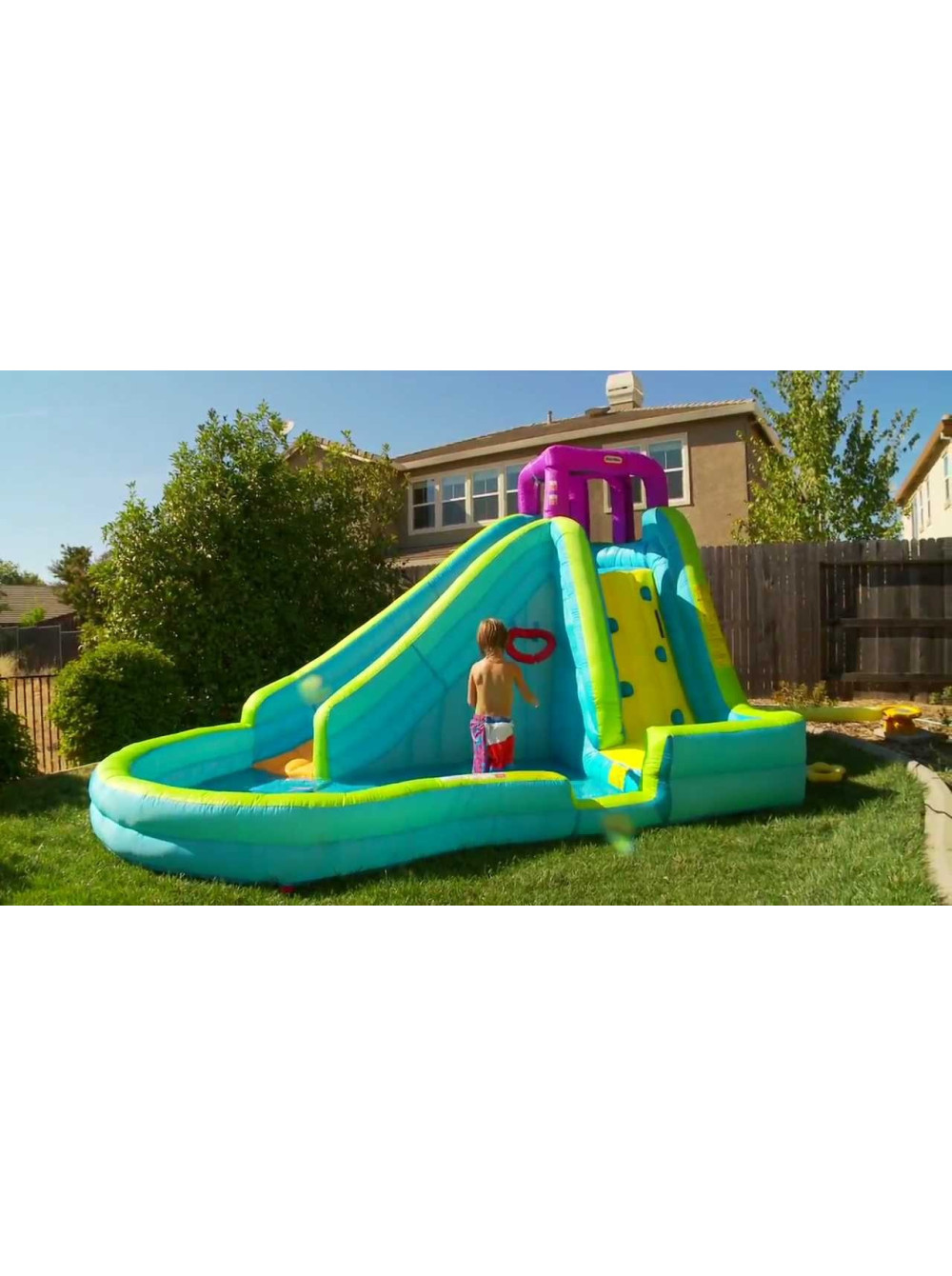 В комплекте к спуску есть масса дополнительных развлечений. В просторном бассейне есть баскетбольное кольцо и мячик, а на горку нужно взбираться по стенке со специальными отверстиями для рук и ног. Если Вы установите этот комплекс на своей территории, то детской радости не будет предела, ведь так забавно спускаться с горки в прохладную водичку в бассейне, особенно когда жарко.