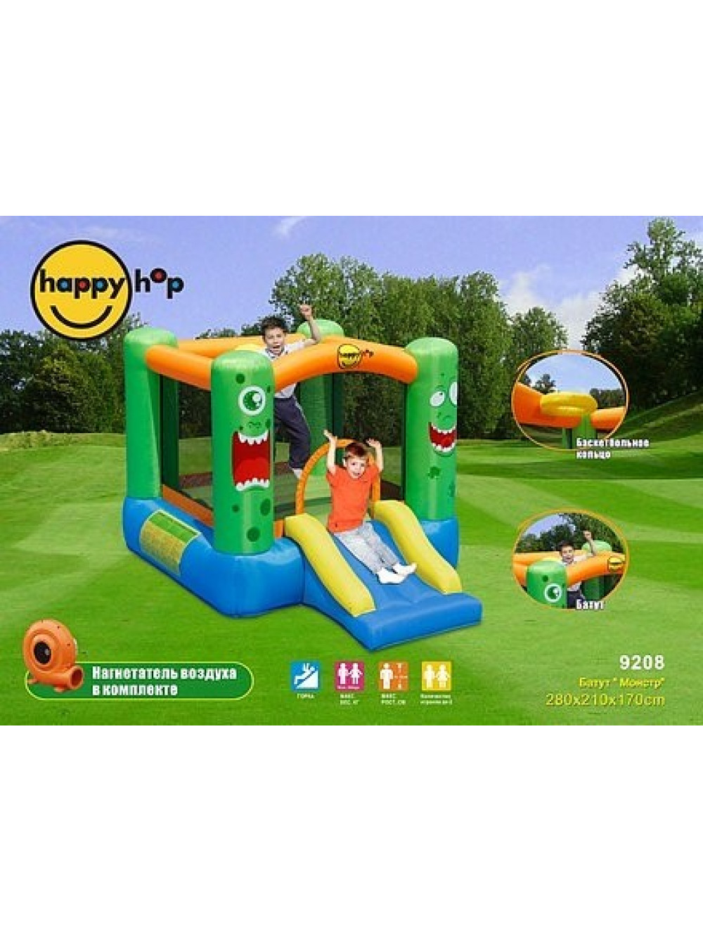 В комплекте компрессор, который поможет Вам сформировать надувной замок за несколько минут. Вы можете перенести игровой центр в любое удобное или нужное для Вас место, благодаря сумке для переноски и хранения.