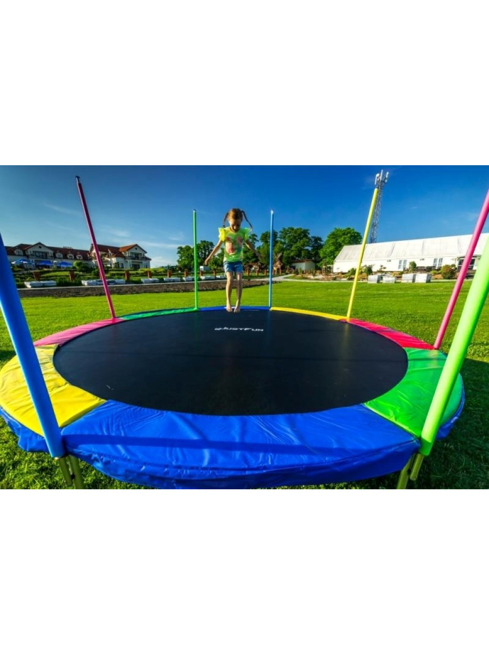 Он имеет размеры чуть выше среднего, усиленную комплектацию, может выдерживать активные динамические нагрузки до 180 кг. Изготовлен из качественных материалов. Поверхность для прыжков закрыта внешней защитным ограждением (сеткой), поэтому у прыгуна нет шансов выпасть во время занятий/