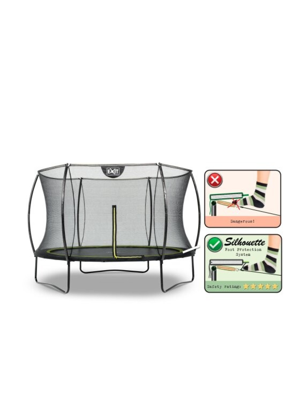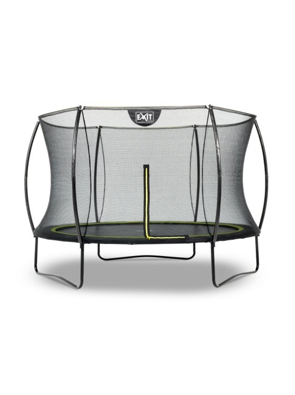 Батут EXIT Silhouette 305 см чёрный - красивый, безопасный, долговечный, современный и прекрасно разработанный, без сомнений, будет великолепно смотреться в любом саду или дворе дома. Конструкция достаточно устойчива и поставляется в комплекте с защитной сеткой, которая удобно открывается с помощью флуоресцентной молнии. Батут имеет контрастный чёрный матовый цвет с включениями ярко-зелёных акцентов, что делает его элегантным и привлекательным.