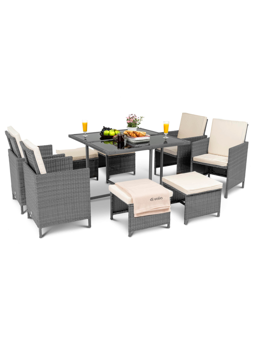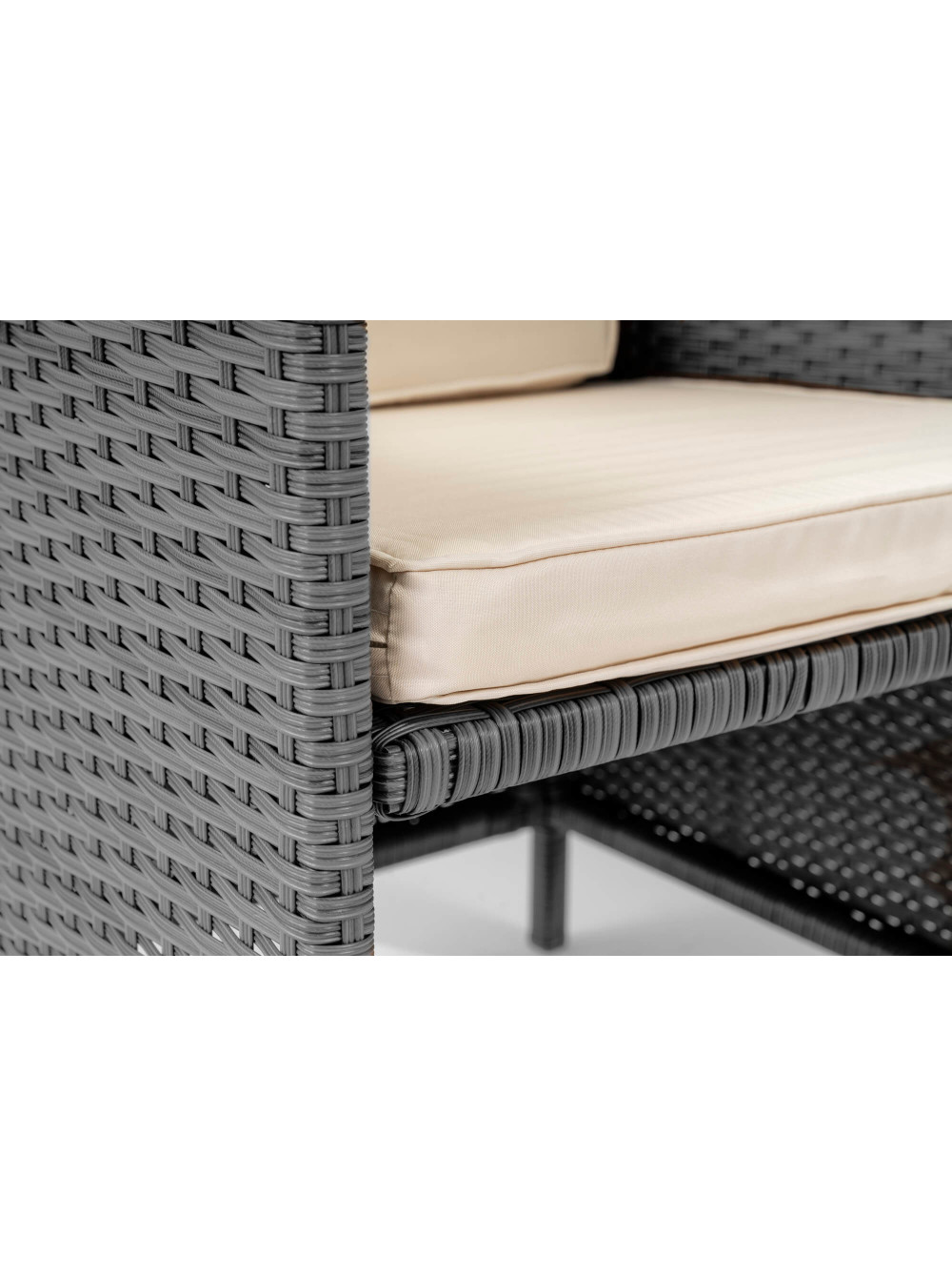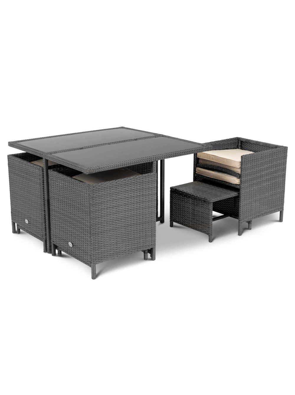 Набор мебели для сада PARMA 8+1 серый - Отдохните на свежем воздухе с комфортом, уютно расположившись в удобном кресле из комплекта садовой мебели из ротанга. Гарнитур состоит из 9 предметов: квадратного стола со столешницей из закалённого стекла, четырёх кресел с удобными мягкими сидениями и четырёх пуфов.