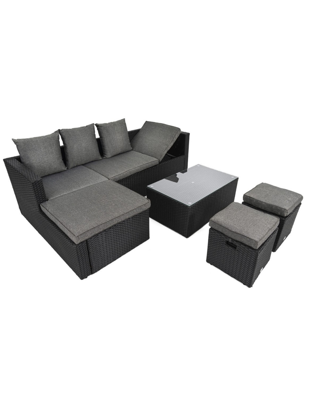 Садовый диван в комплекте Bologna чёрный/серый - замечательный набор садовой мебели с угловым диваном, который можно установить разными способами в соответствии с вашими предпочтениями. Диван очень удобен, одна из его крайних подушек поднимается и легко регулируется под нужным углом.