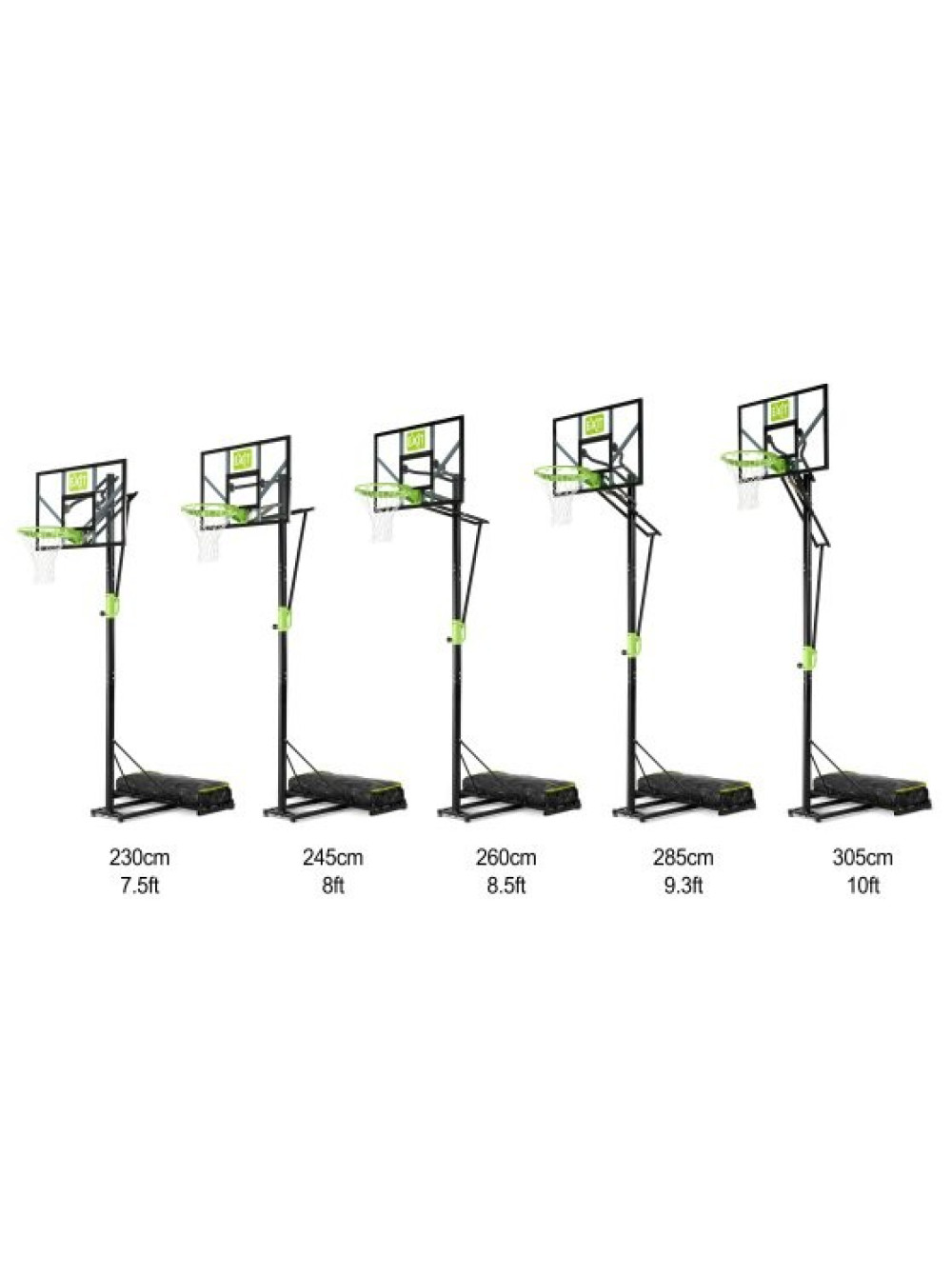 Баскетбольный щит может быть отрегулирован на пять различных высот: 230 -245 - 260 - 285 - 305 см, поэтому использовать его смогут как дети, так и взрослые.