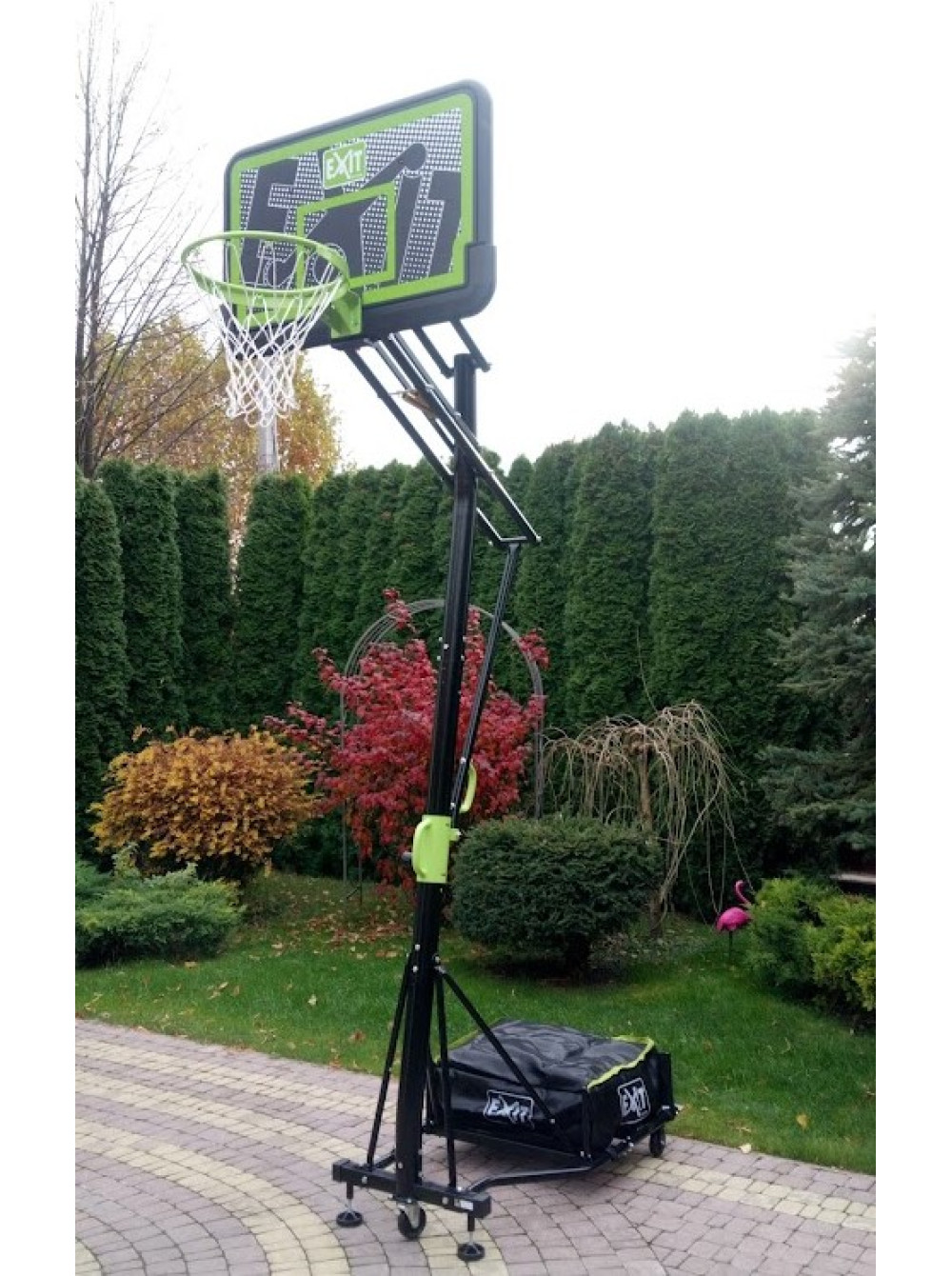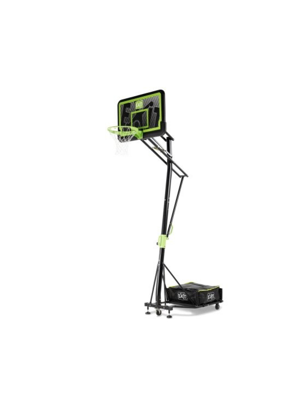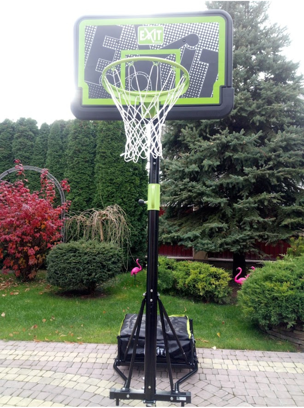 Переносной баскетбольный щит EXIT Galaxy black на колёсиках с зелёным кольцом гарантирует часы баскетбольного веселья.