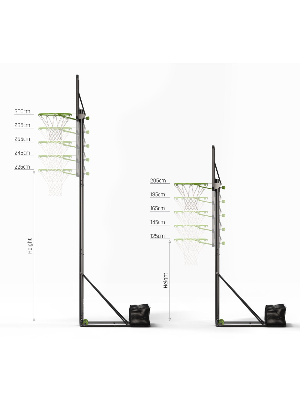- Регулируемая высота – выбирайте из 10 уровней, от детских (125 см) до профессиональных (305 см).