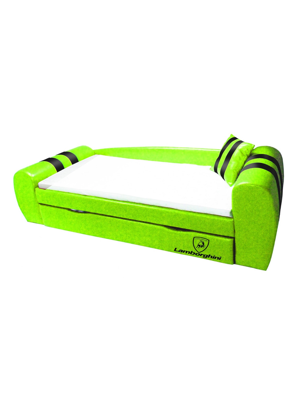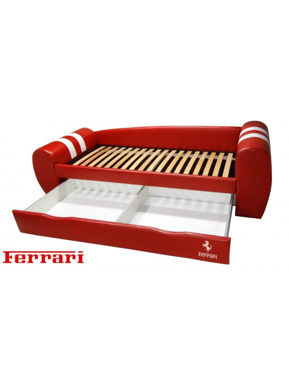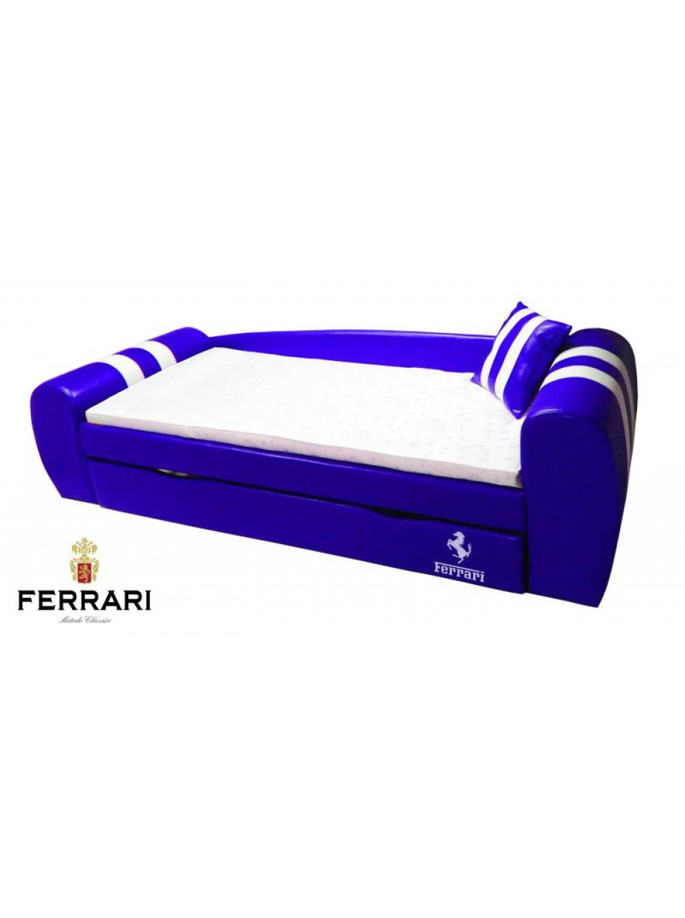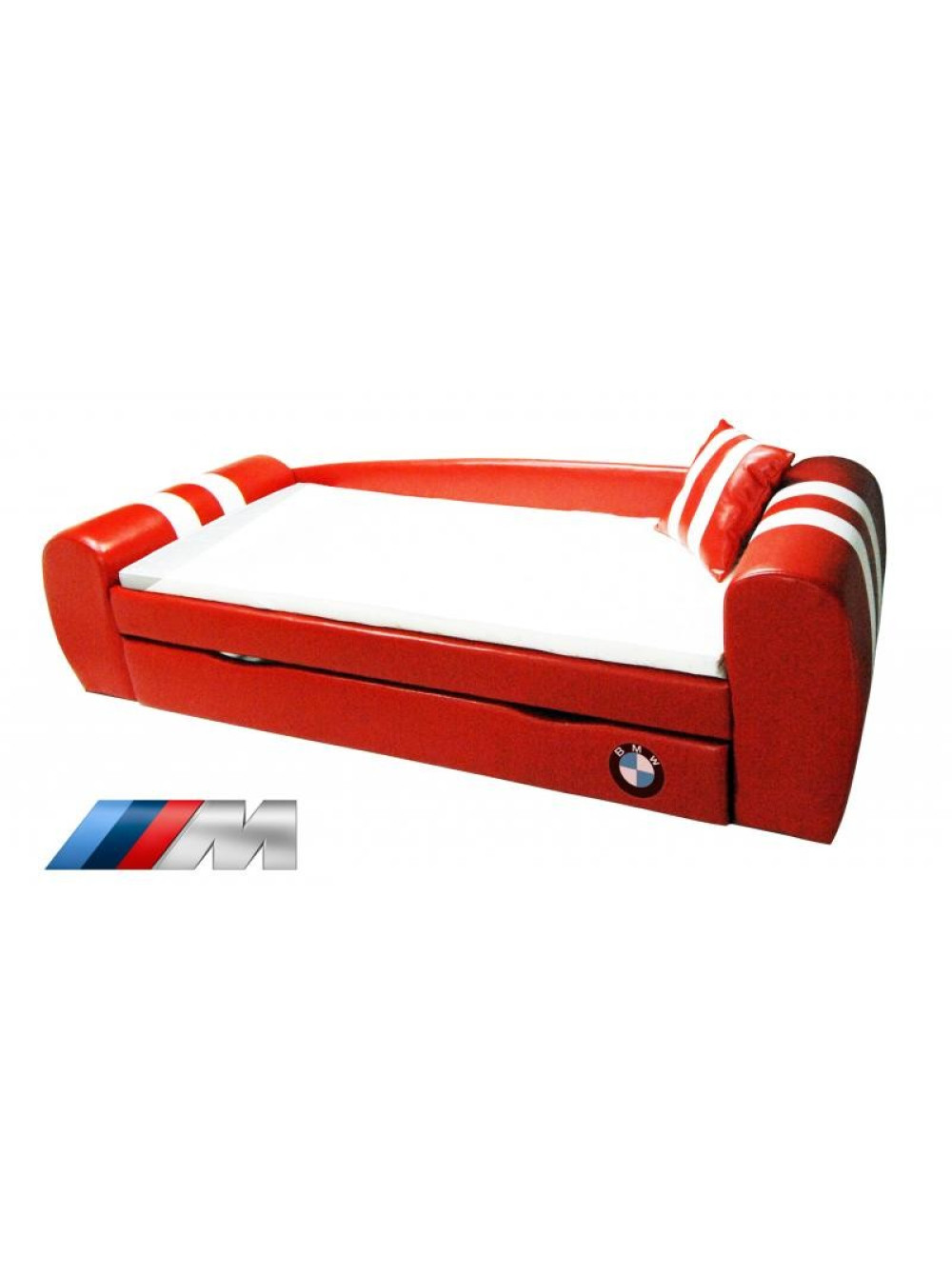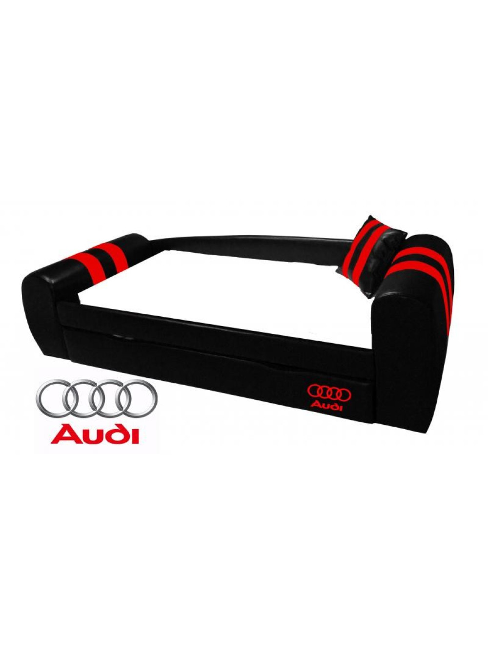 Диван-ліжко King - ультрасучасна модель ліжка, вдале поєднання м'якого куточка і спального місця для дитини. Дизайн цих диванів досить незвичайний, вони виконані в різній колірній гаммі з обов'язковим нанесенням логотипів найвідоміших автомобільних брендів: Audi, Lamborghini, Ferrari, MINI, BMW. Ці такі необхідні в будь-якій кімнаті меблі не тільки зовні привабливі, мають чудовий зовнішній вигляд, але і досить функціональні. Виріб обладнано висувними ящиками для зберігання. Тому, коли до вашого чада нагрянуть однолітки, то постіль без проблем прибирається в ці ящики. І повноцінний міні-м'який куточок для прийому гостей готовий. Тепер подивитися телевізор, поспілкуватися і пограти дітвора зможе на комфортних м'яких меблях.