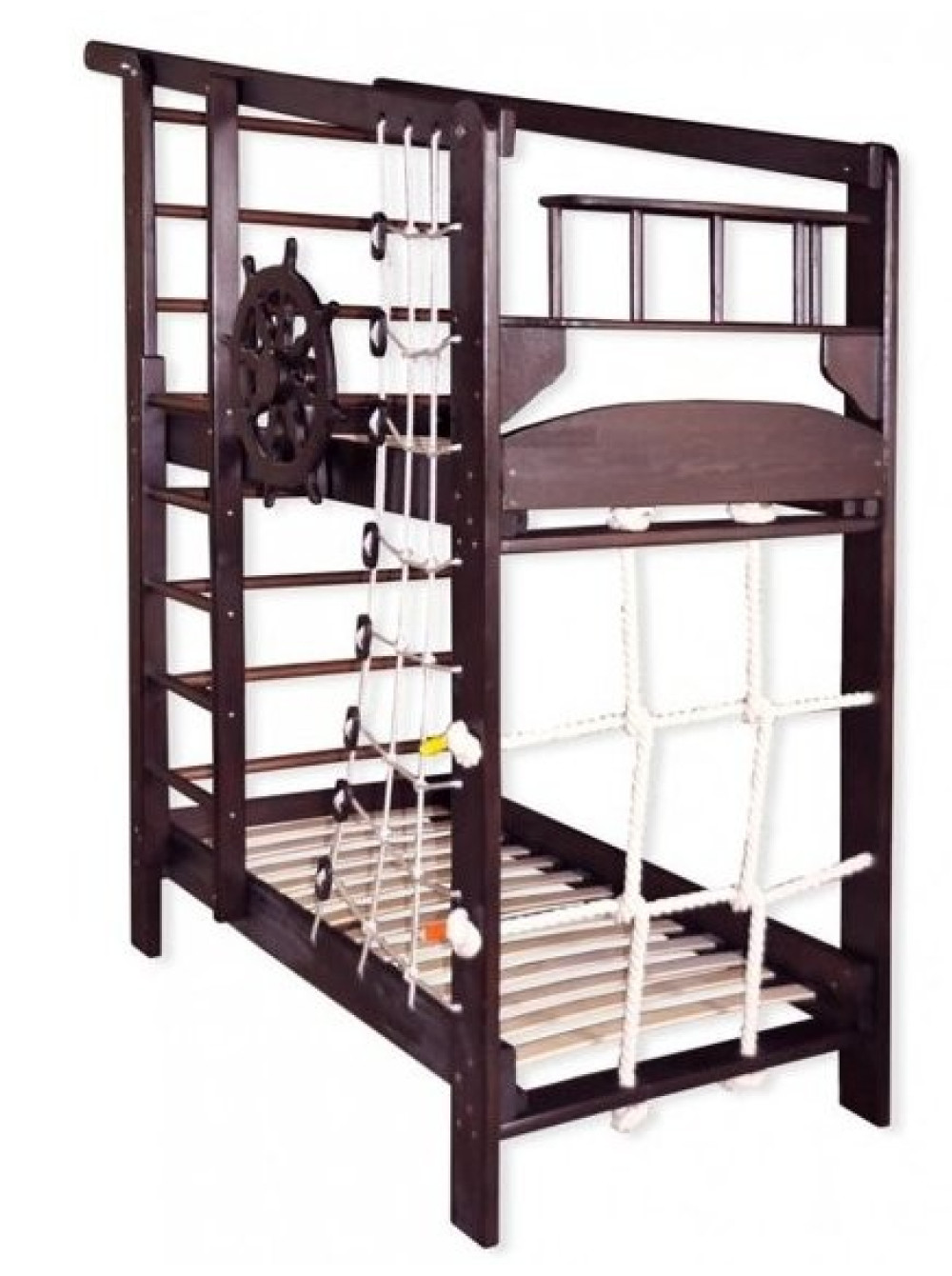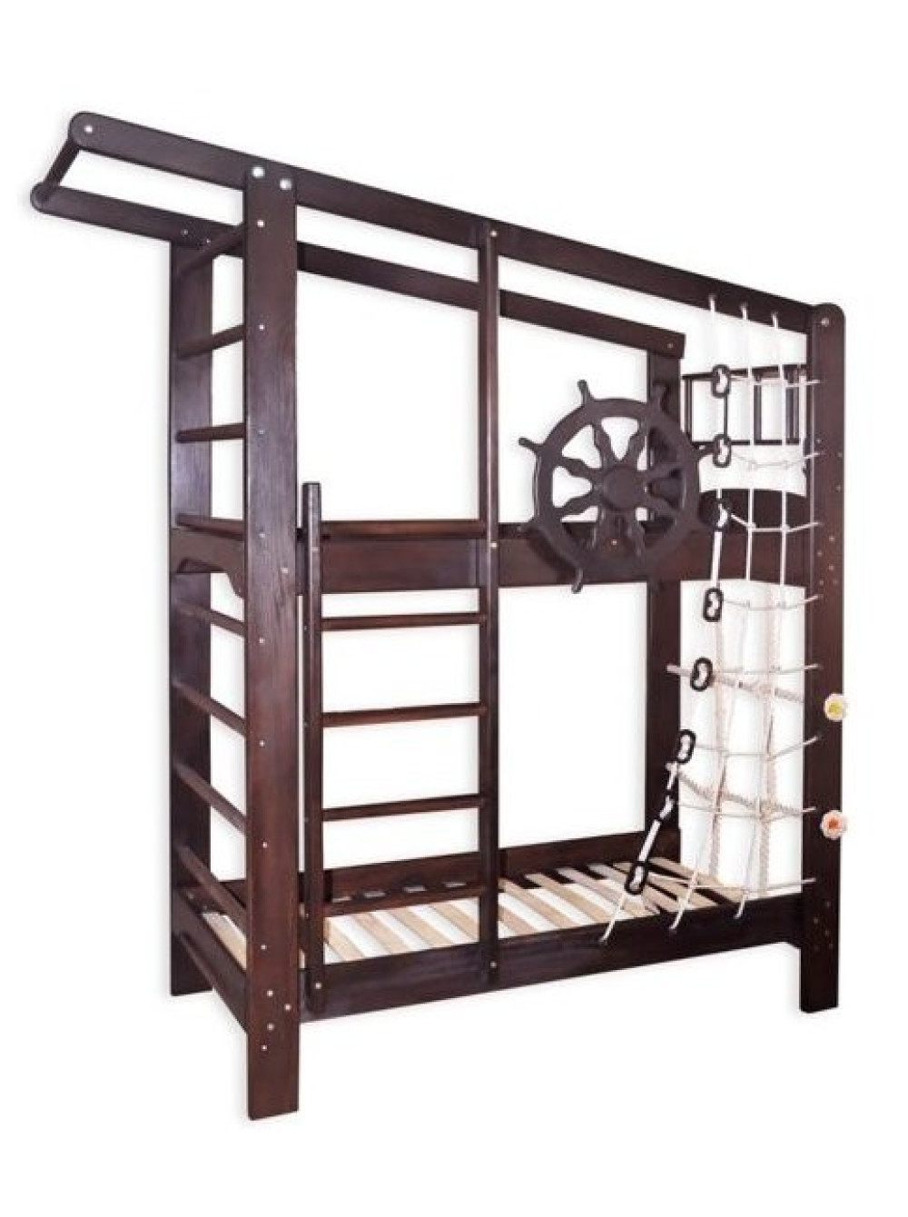 Двох'ярусне спортивне ліжко Юнга в тонуванні - ідеальне і забавне рішення, що дозволяє максимально ефективно використати простір в дитячій кімнаті. Цей варіант ліжка доповнений шведською стінкою з турніком, штурвалом капітана і спортивними сітками для лазінь, що робить її не лише корисною, але і максимально привабливою для дітей.