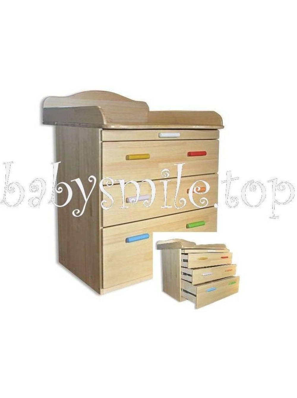 У комплекті: тумба з розсувними ящиками для зберігання дитячих речей та інших матеріалів по догляду за малюками, вгорі пеленальний столик з висувною дошкою для додаткового зручності.
