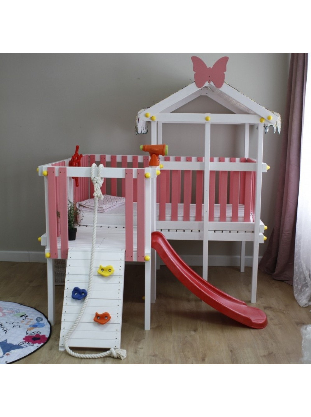 Така річ здатна сподобатися будь-якому малюкові, як дівчаткам, так і хлопчикам. Тут вони зможуть не лише відпочивати вночі, але і потішно проводити час вдень. Ігровий комплекс виконаний з натуральної деревини сосни і розрахований на діток у віці від трьох років.