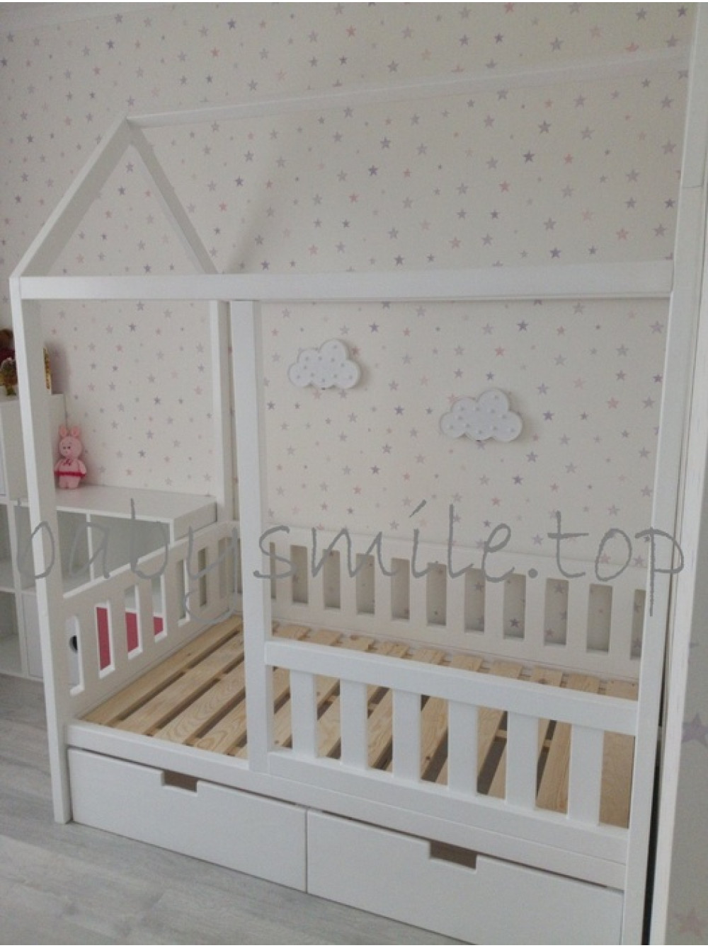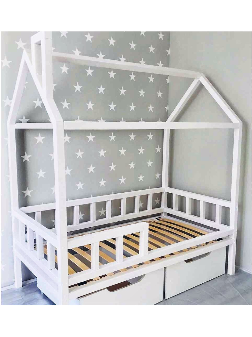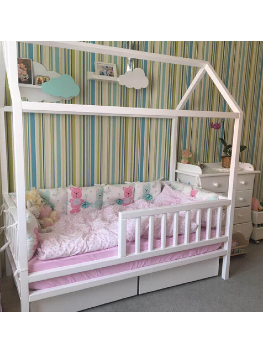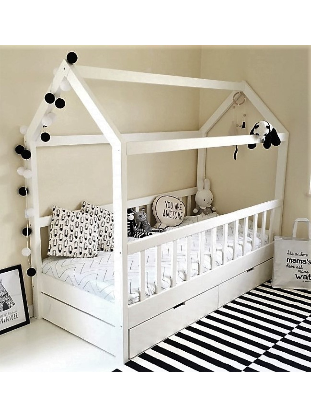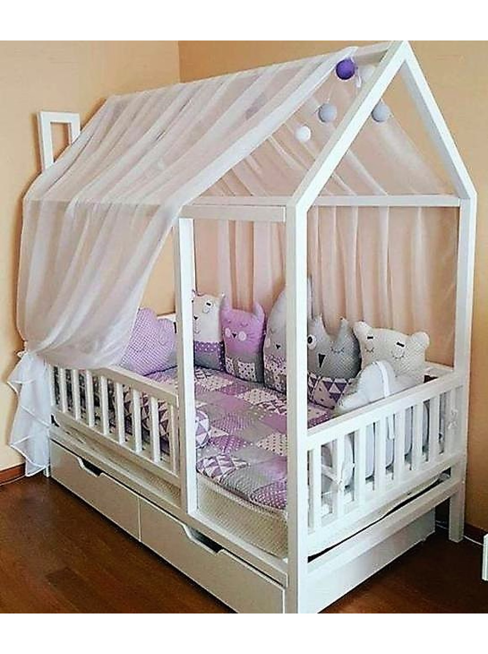 Чисті і строгі лінії ліжечка разом з виразною формою будинку, перетворюють це ліжко на центральну частину дитячої. Це не лише спальне місце, це і ігрова зона, тим паче, що її завжди можна декорувати фіранками або прикрасити гірляндами, і взагалі дизайн можна міняти щосезону або періодично від свята до свята.