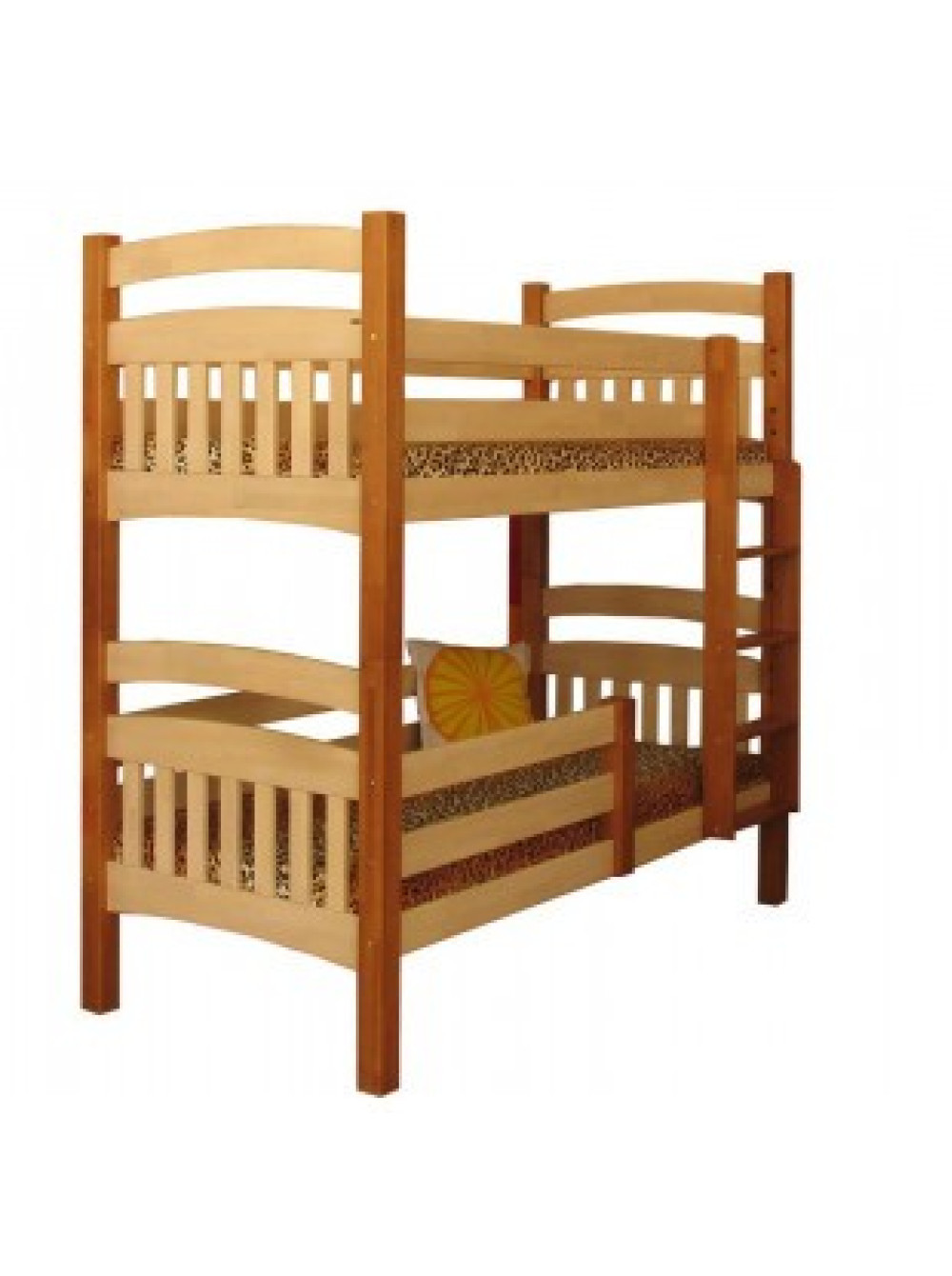 Виріб виконаний у класичному стилі з натуральної деревини, з використанням тонування по дереву на водній основі без зайвих деталей, Із захисними бортиками зверху і внизу, зручною драбинкою з плоскими сходами для підйому на другий поверх.