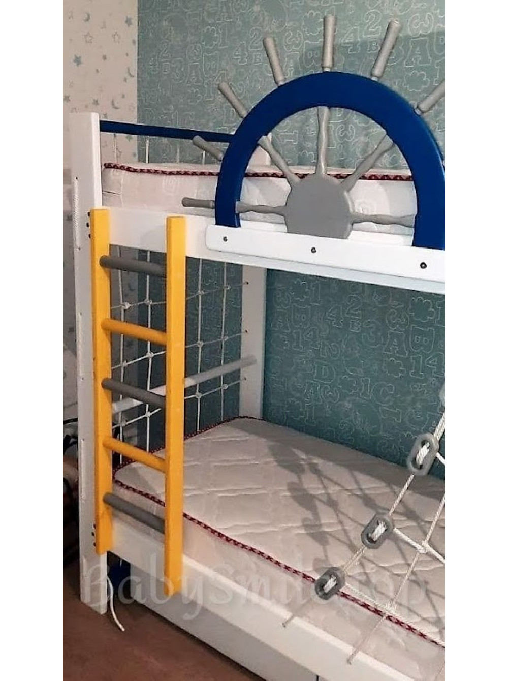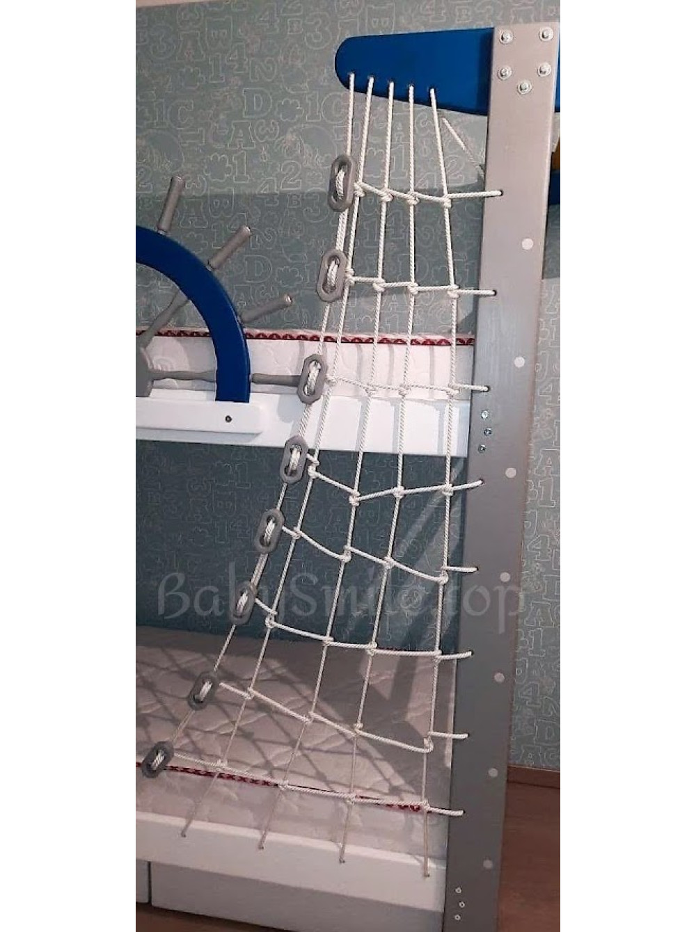 Двох'ярусне ліжко із спортивним куточком - ідеальне і забавне рішення, що дозволяє максимально ефективно використати простір в дитячій кімнаті. Цей варіант ліжка доповнений шведською стінкою з турніком, капітановим штурвалом і спортивними сітками для лазінь, що робить її не лише корисною, але і максимально привабливою для дітей.