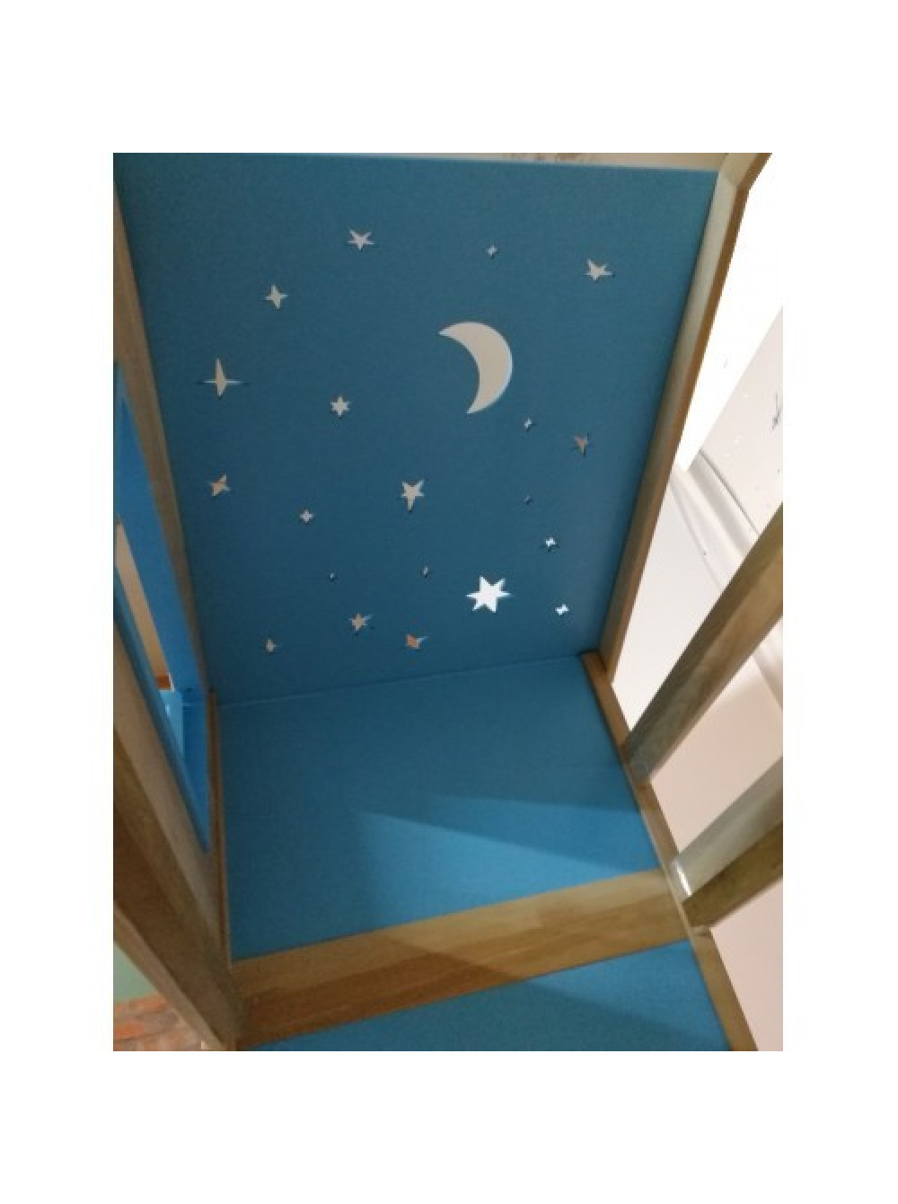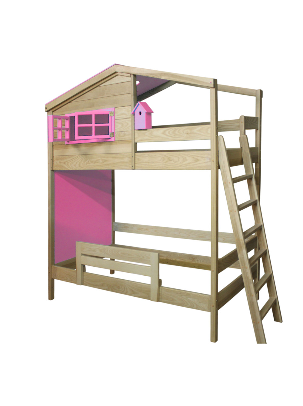 Ліжко двоярусне будиночок Зоряне небо це захоплювальний світ дитячих мрій і уяв. Зручний казковий будиночок для сну і відпочинку, ігор. Матеріал - натуральне дерево. Прикрашене ліжко мальовничими елементами зоряного неба, віконцем з віконницями і шпаківнею