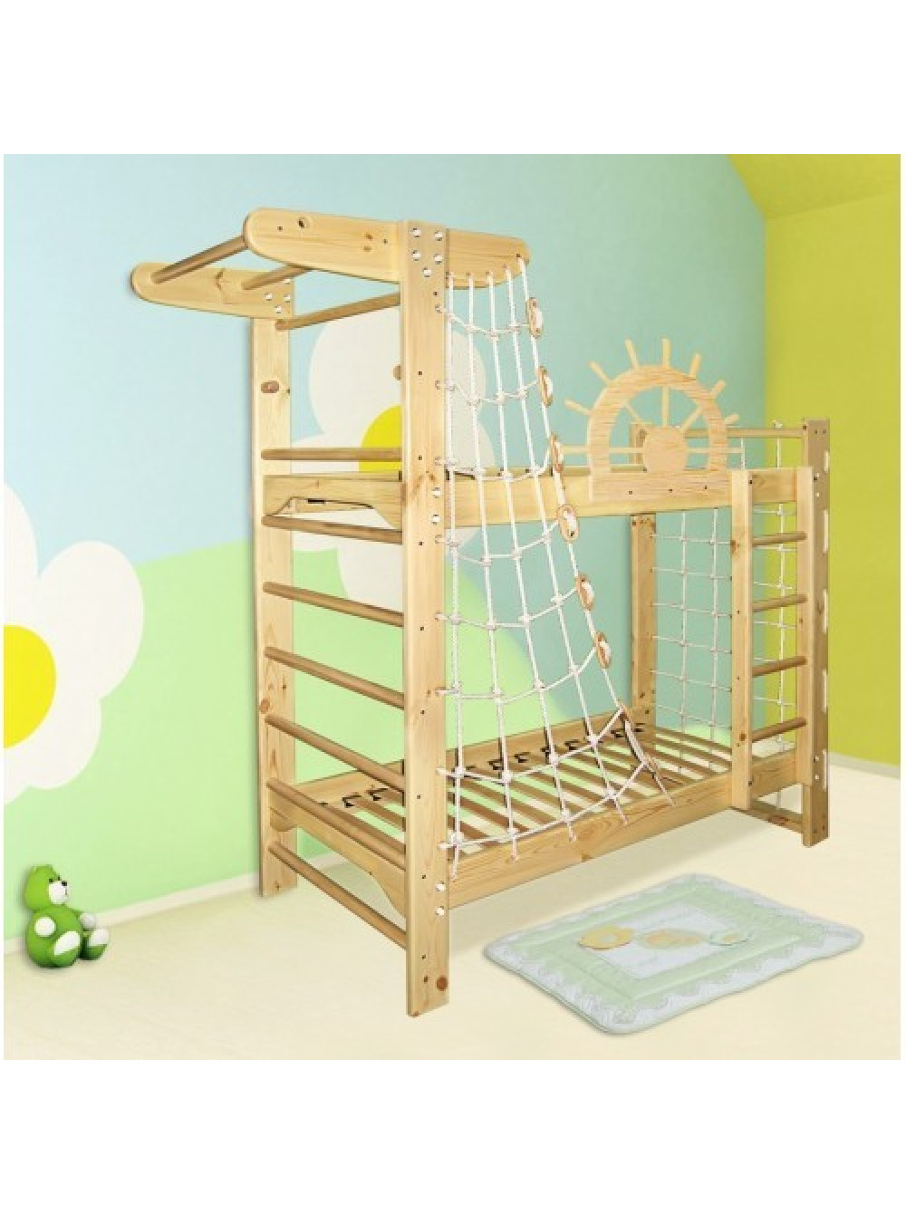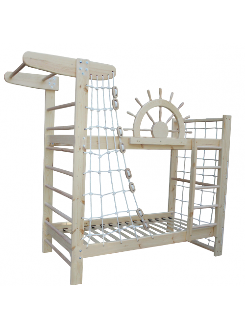 Ліжко спортивний куточок двох'ярусне "Пірат" виконане з масиву сосни. Може бути представлене в двох розмірах спального місця - 160х70 см і 190х80 см.