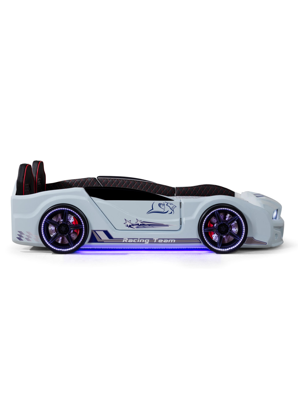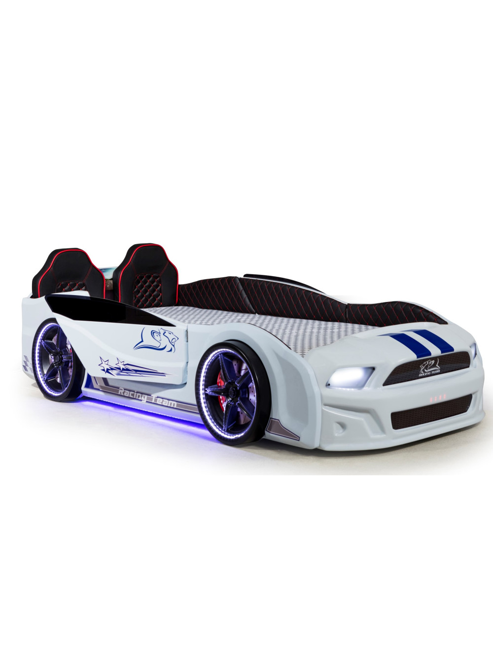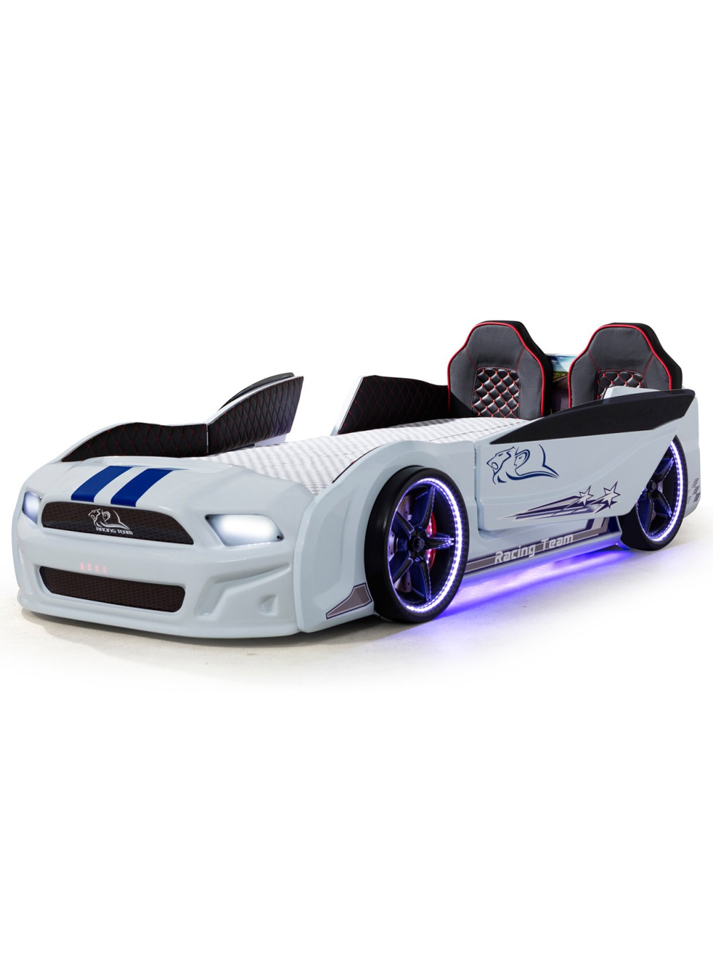 Ліжко гоночна машина Мустанг біла з дверима, що відкриваються, і шкіряними сидіннями - швидка, яскрава, барвиста і дуже крута з множиною анімаційних функцій. У цій моделі світяться фари, колеса і дно автомобіля. У комплекті пульт управління звуками і світлом.