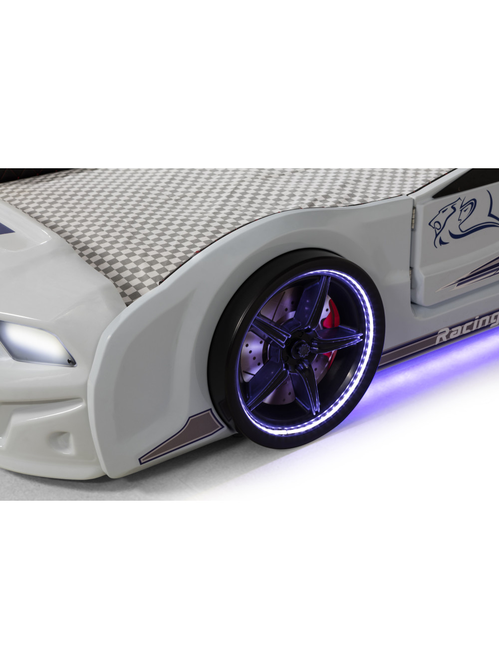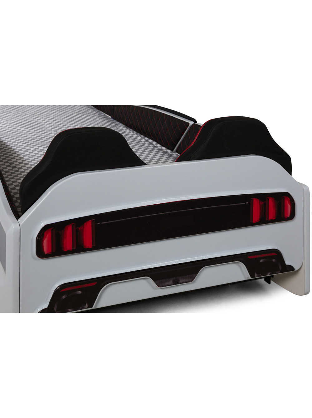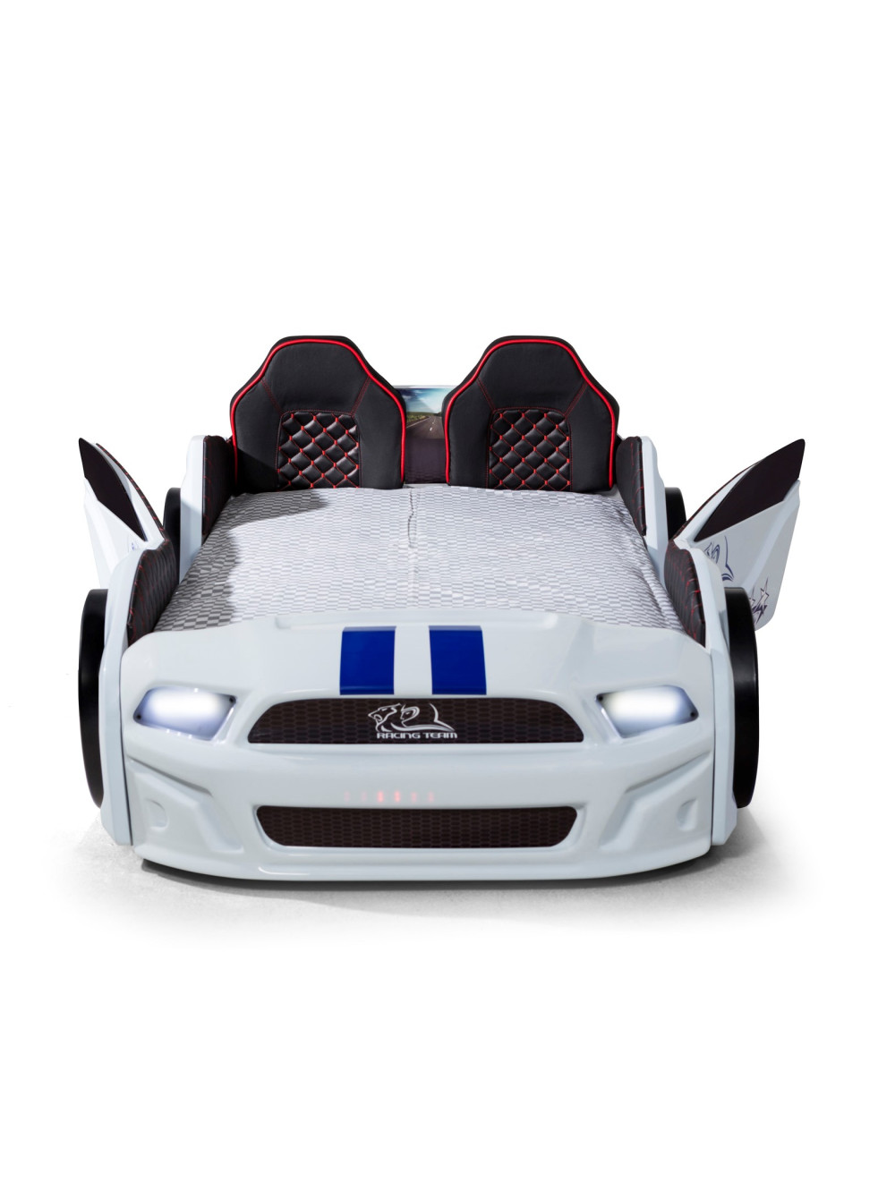 Ліжко гоночна машина Мустанг біла з дверима, що відкриваються, і шкіряними сидіннями - швидка, яскрава, барвиста і дуже крута з множиною анімаційних функцій. У цій моделі світяться фари, колеса і дно автомобіля. У комплекті пульт управління звуками і світлом.