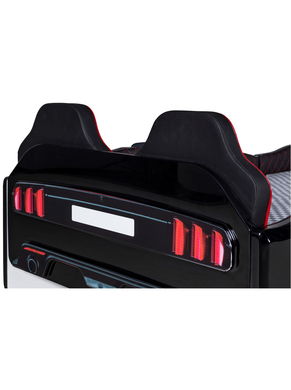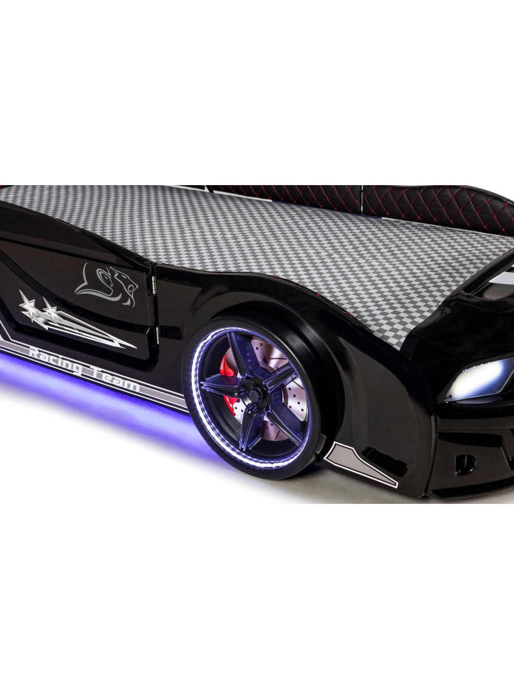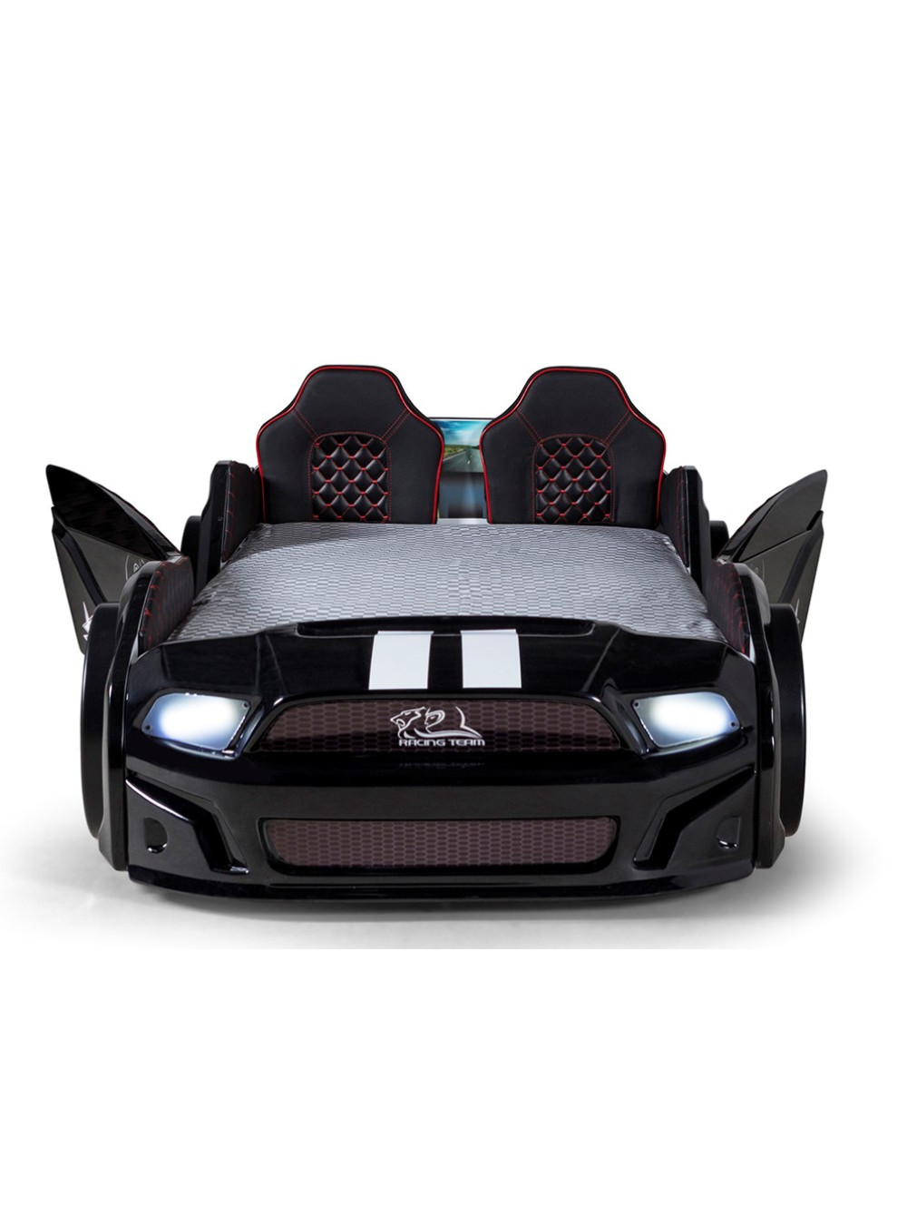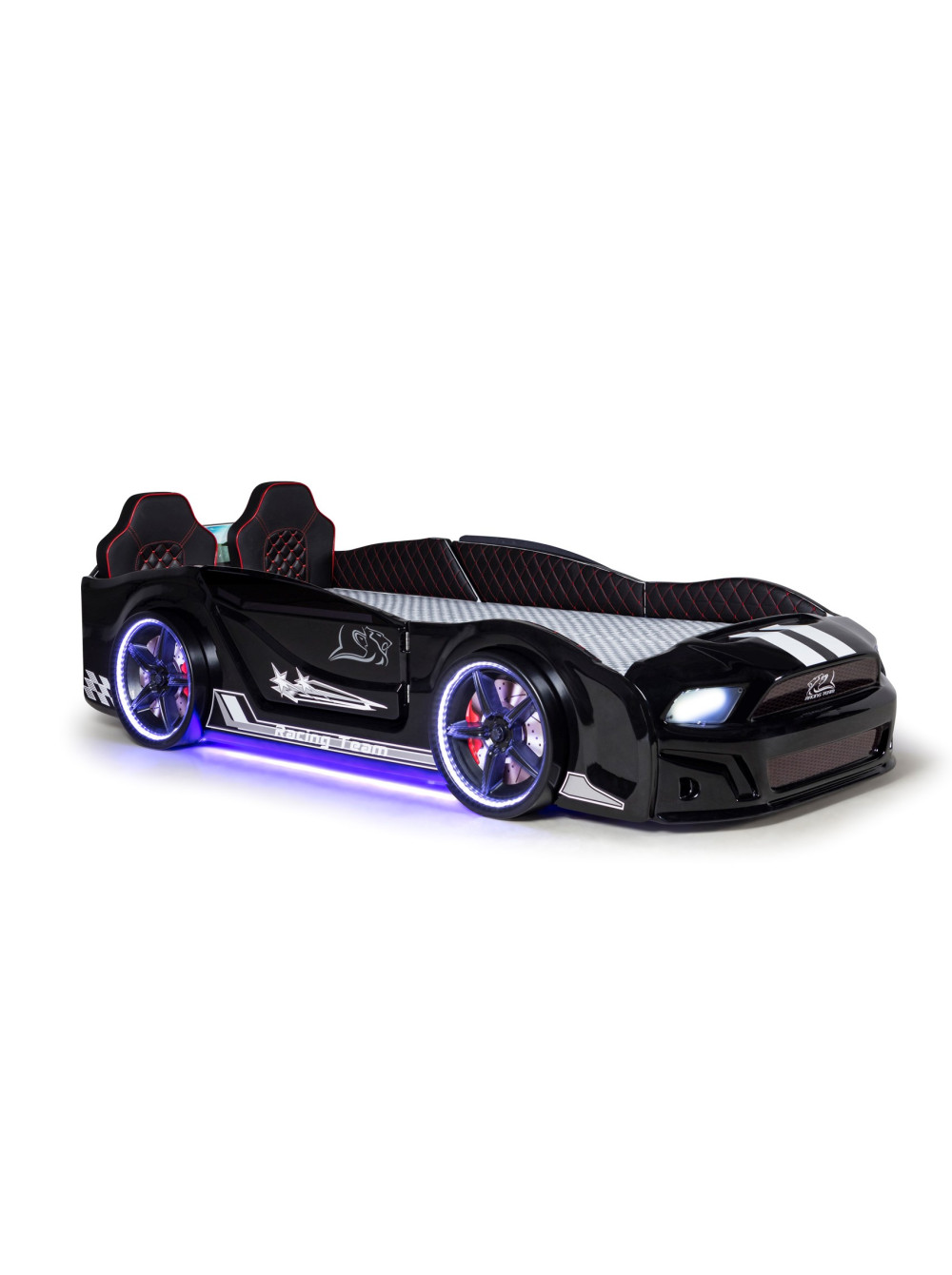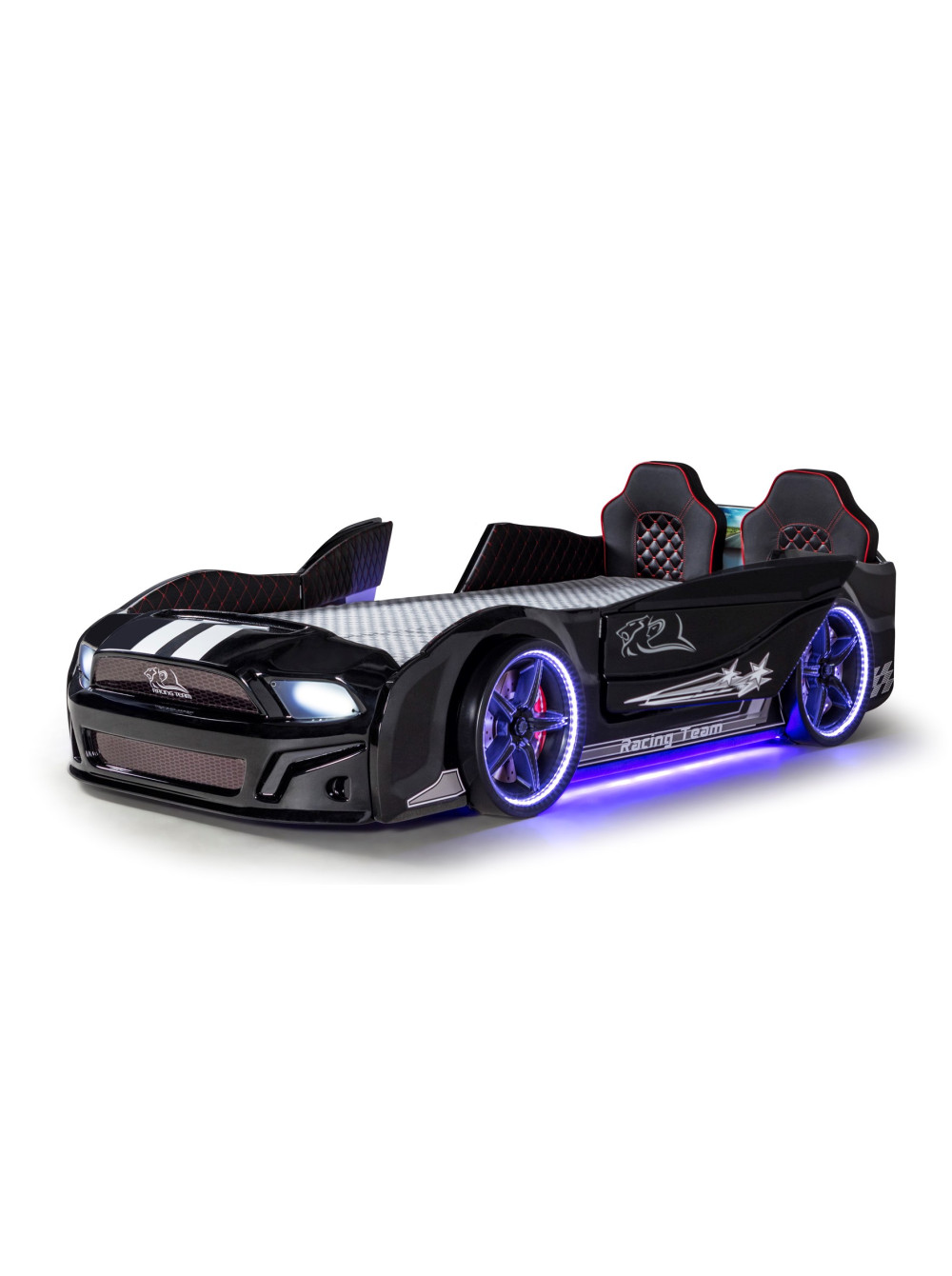 Ліжко гоночна машина Мустанг чорна з дверима, що відкриваються, і шкіряними сидіннями - швидка, яскрава, барвиста і дуже крута з множиною анімаційних функцій. У цій моделі світяться фари, колеса і дно автомобіля. У комплекті пульт управління звуками і світлом.