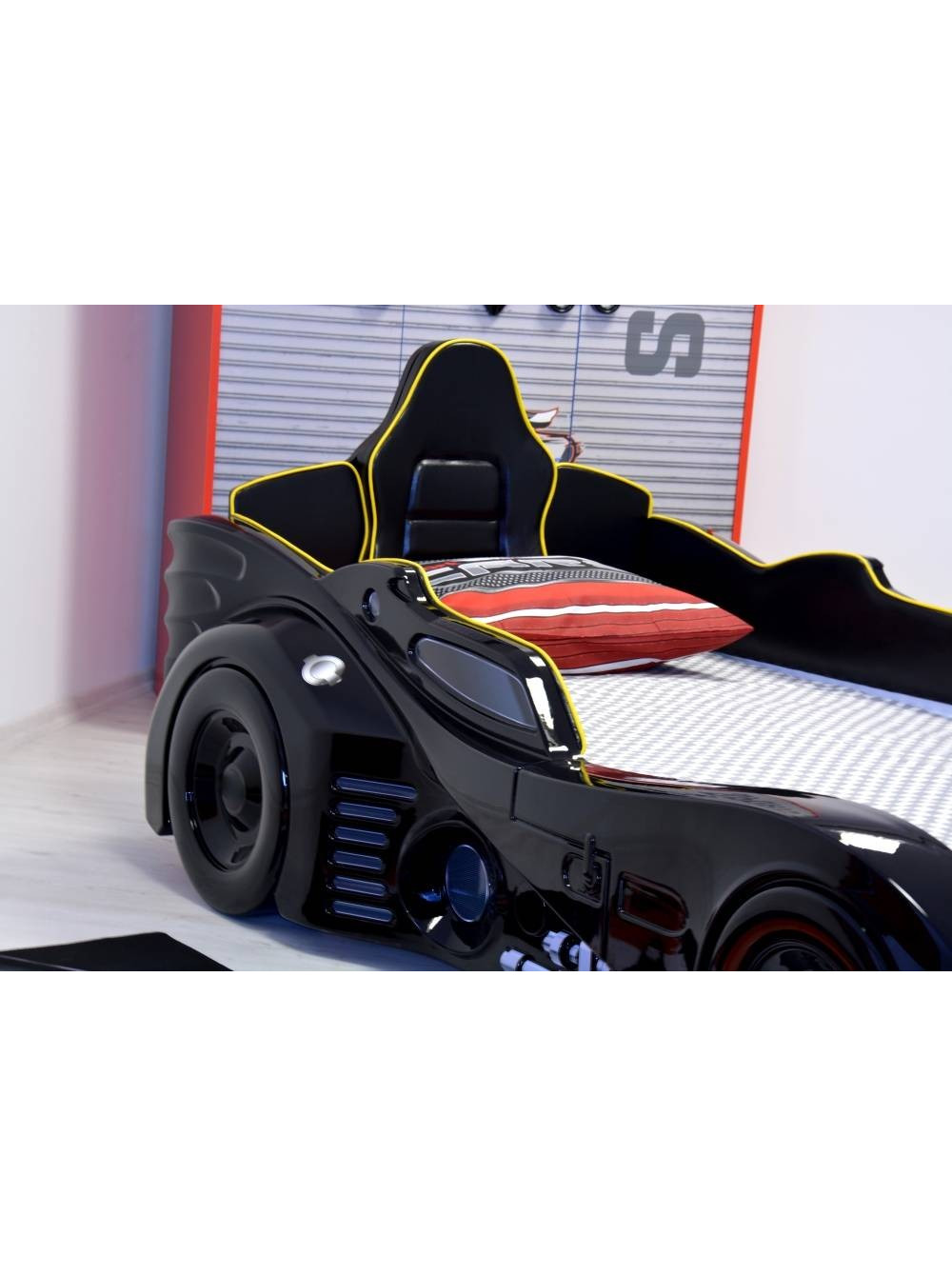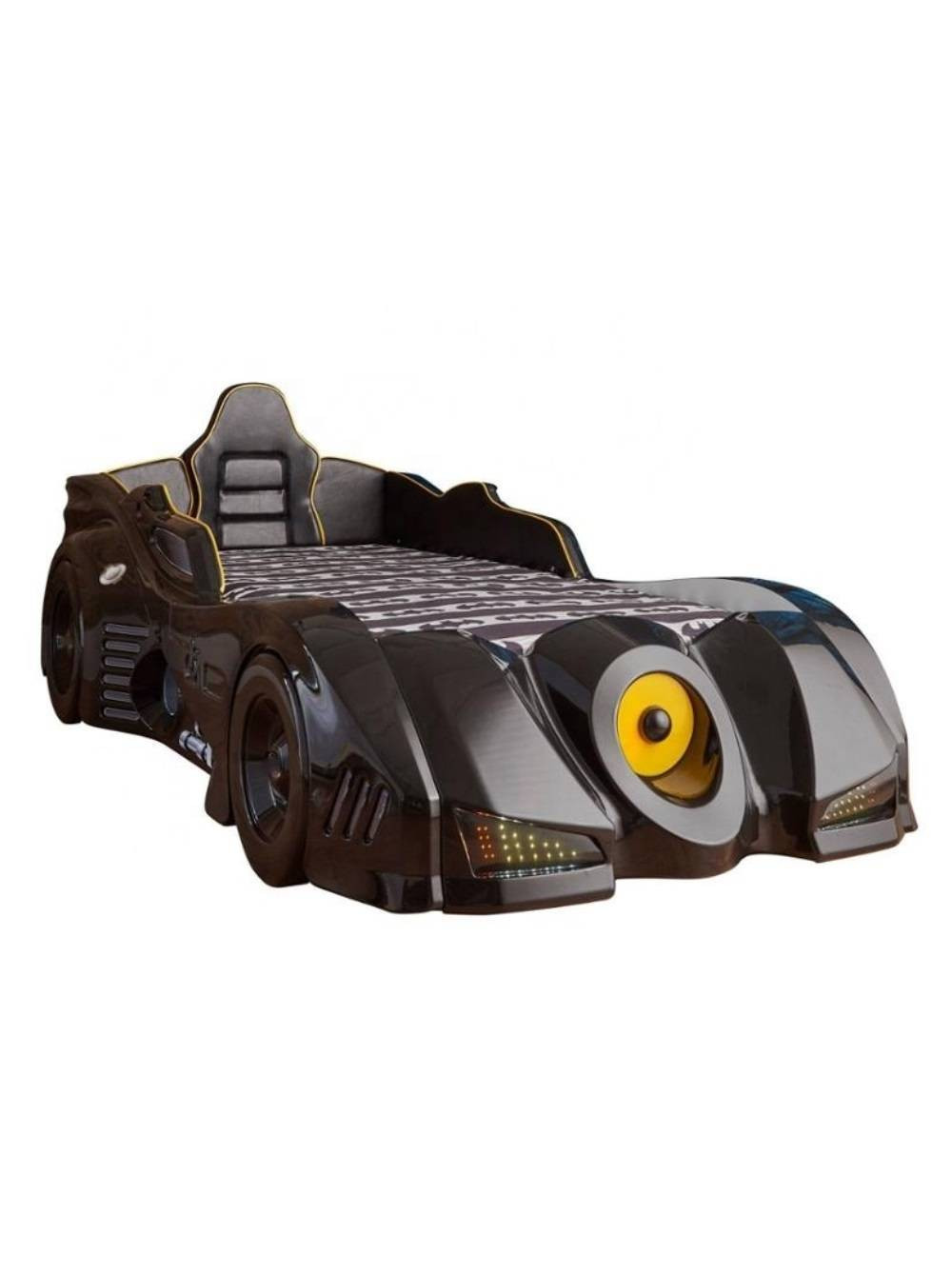 Ліжко-машина Автомобіль Бетмена - абсолютно нова модель на світовому ринку! Реалістичний дизайн, Повна комплектація з підсвічуванням фар, коліс, днища і різними гоночними звуками і мелодіями. Спинка і боки ліжка з шкіряною оббивкою. Модель класу Люкс.