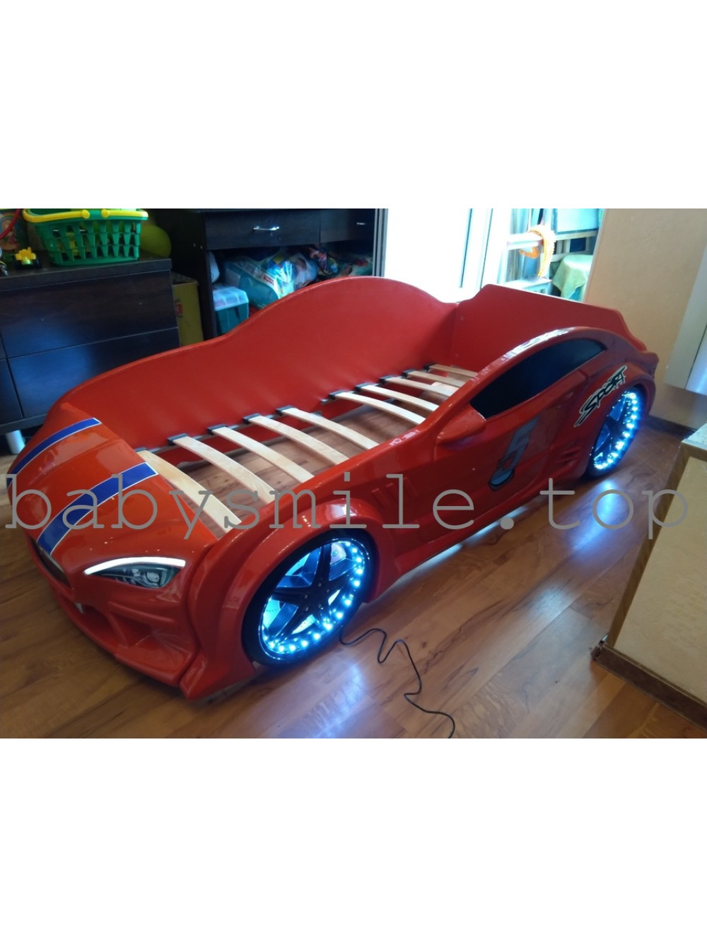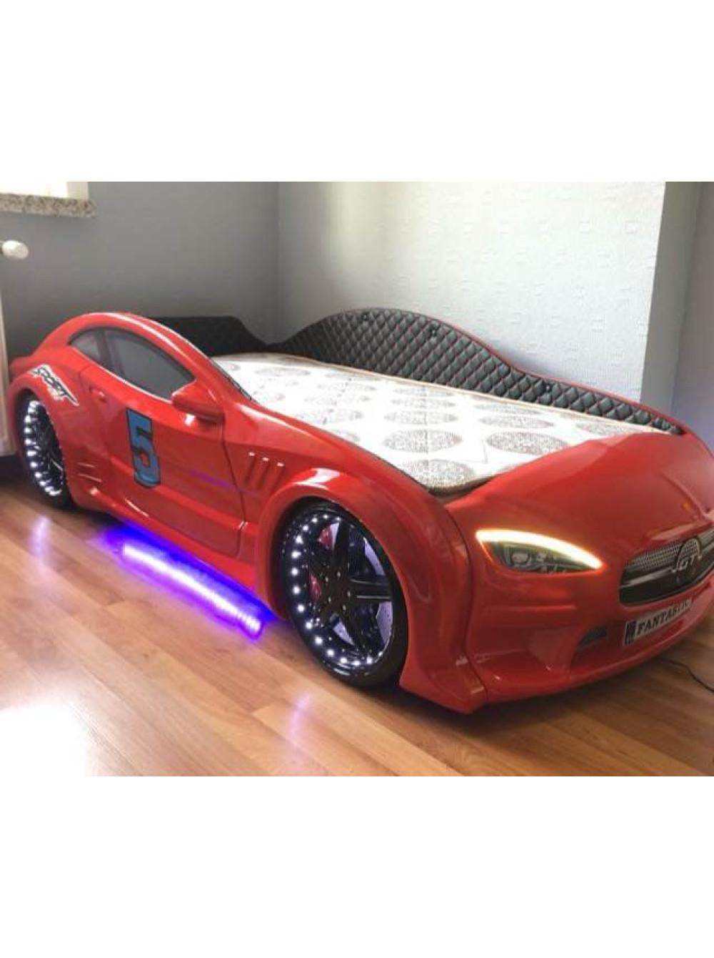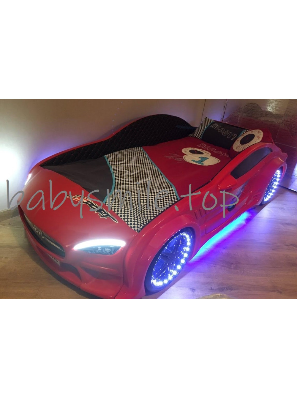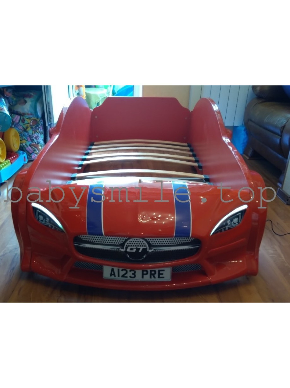 Ліжко машина Mersedes GT 80х160 червона - нова модель ліжка авто з маленьким спальним місцем. Ідеальне рішення для маленьких діток і невеликих дитячих кімнат. Виконана в яскравому червоному кольорі з медичного пластика і ДСП, з низом кузова, що світиться, фарами, колесами і звуковими функціями (без ящика для зберігання).