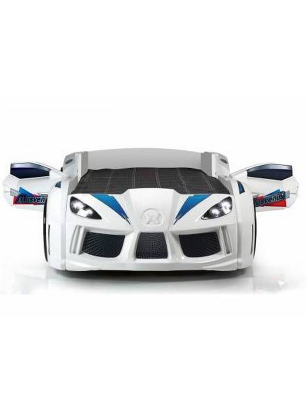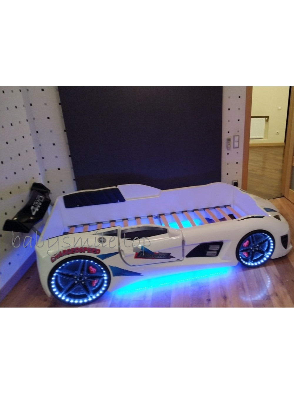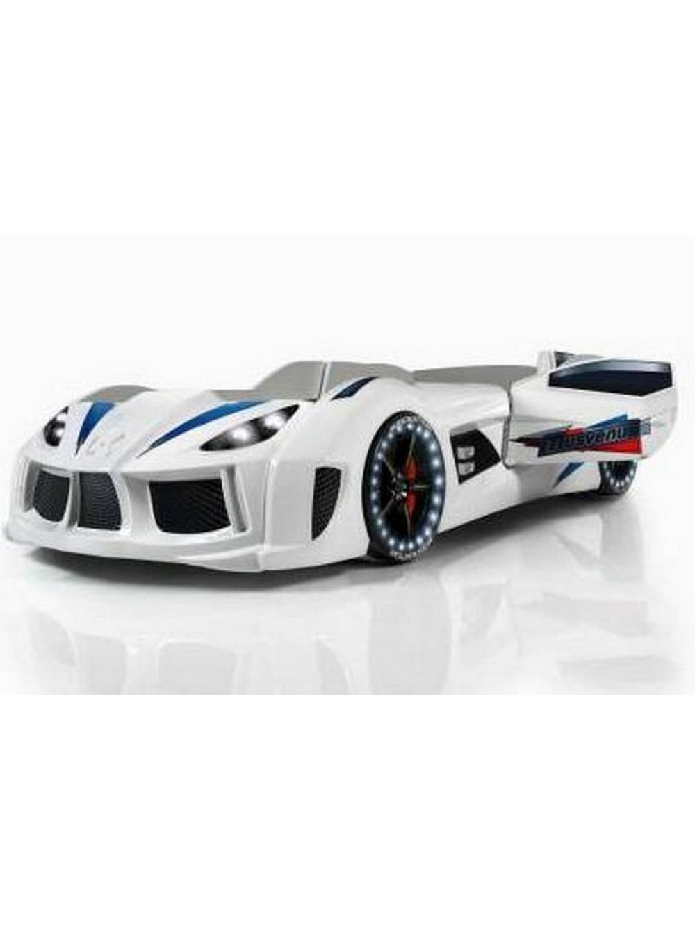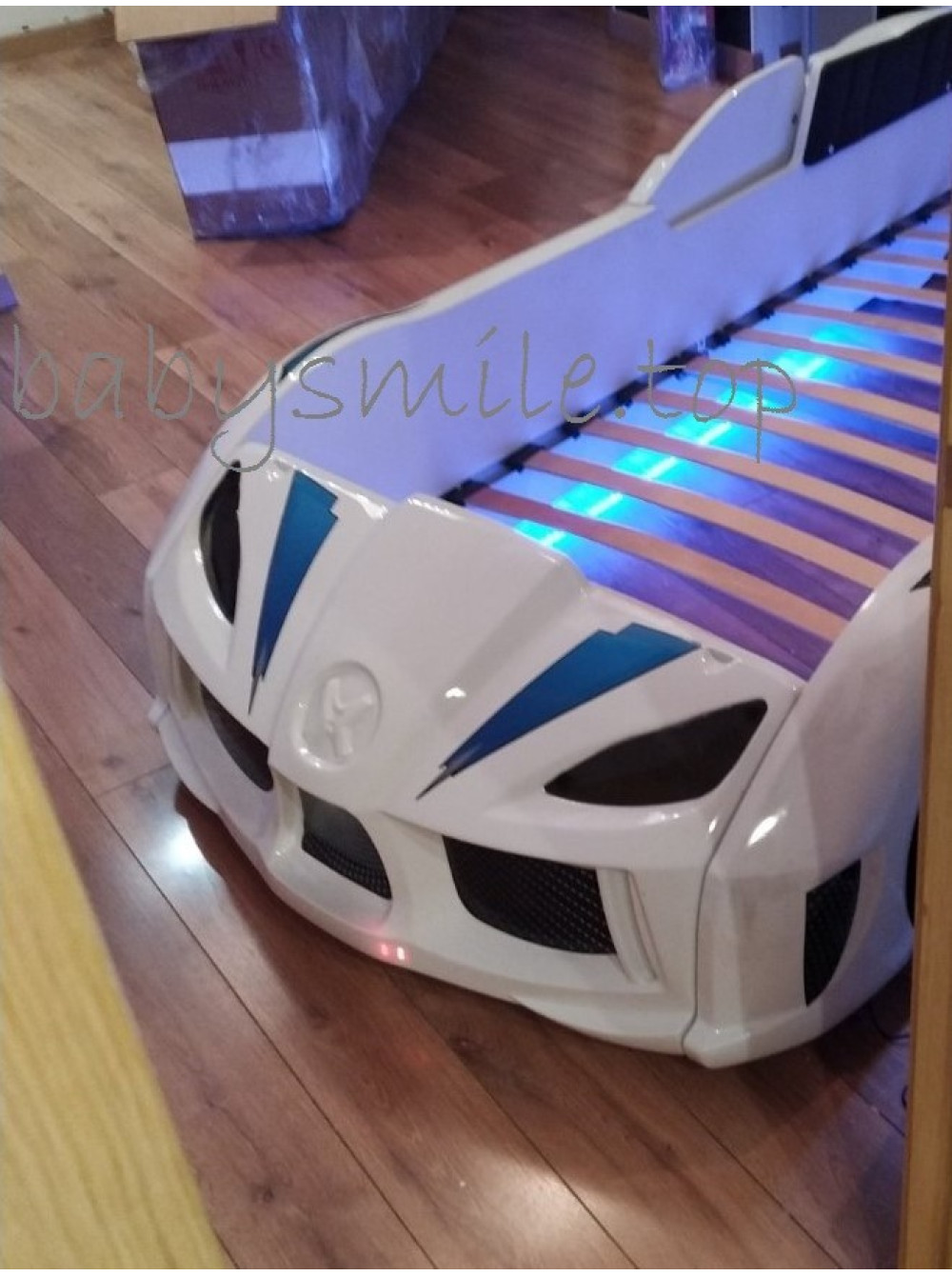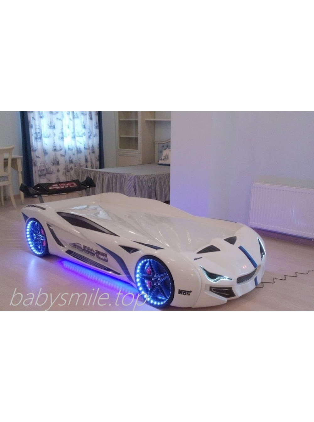 Найголовніше, що Ліжко машинка Ауді біла має досить реалістичний вигляд не тільки зовні. Вона може видавати цілком реальні звуки мотора, що заводиться, і машини, що їде, до того ж підсвічування фар, коліс і дна завершують образ сучасного автомобіля. Таке підсвічування можна використовувати замість нічника, якщо ваша дитина боїться спати в повній темряві.