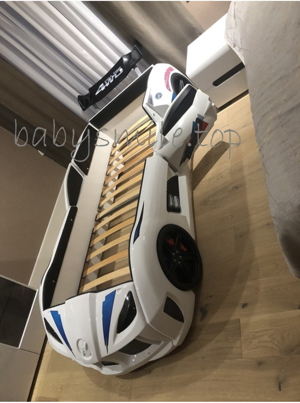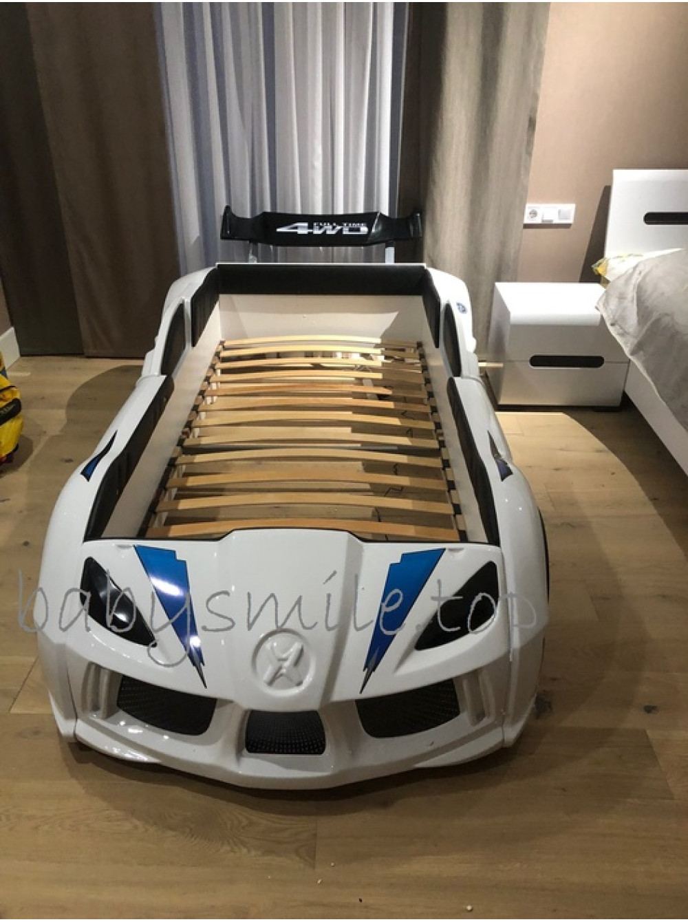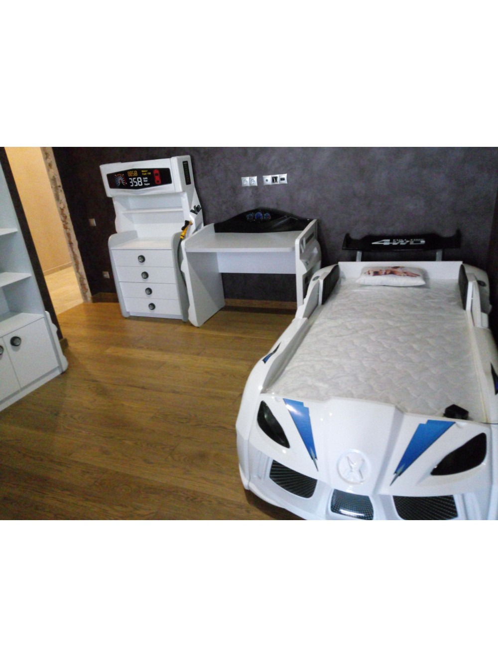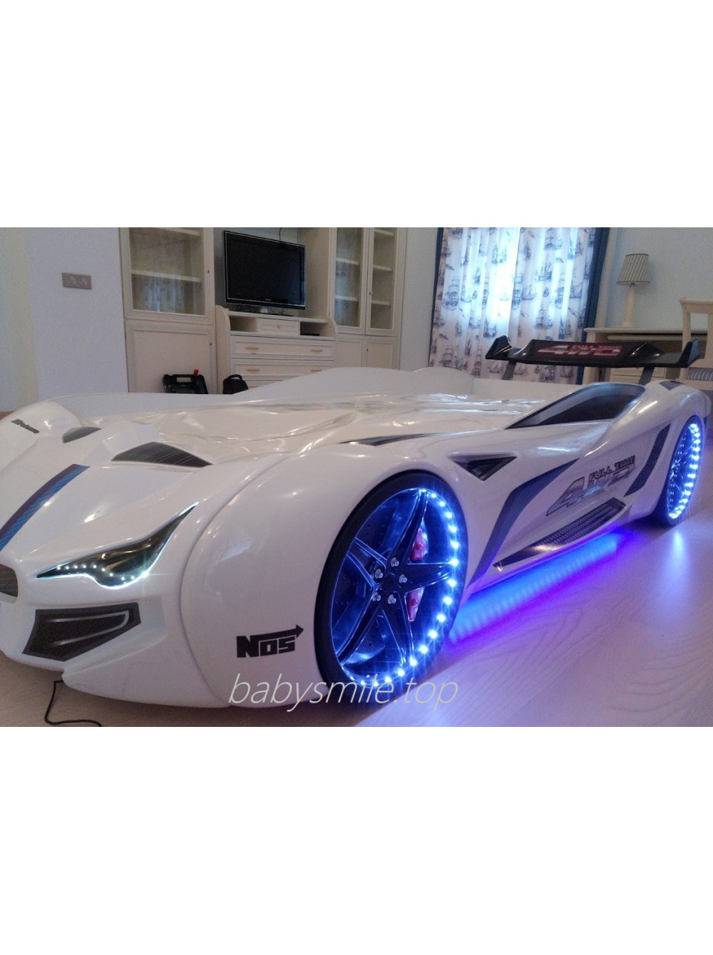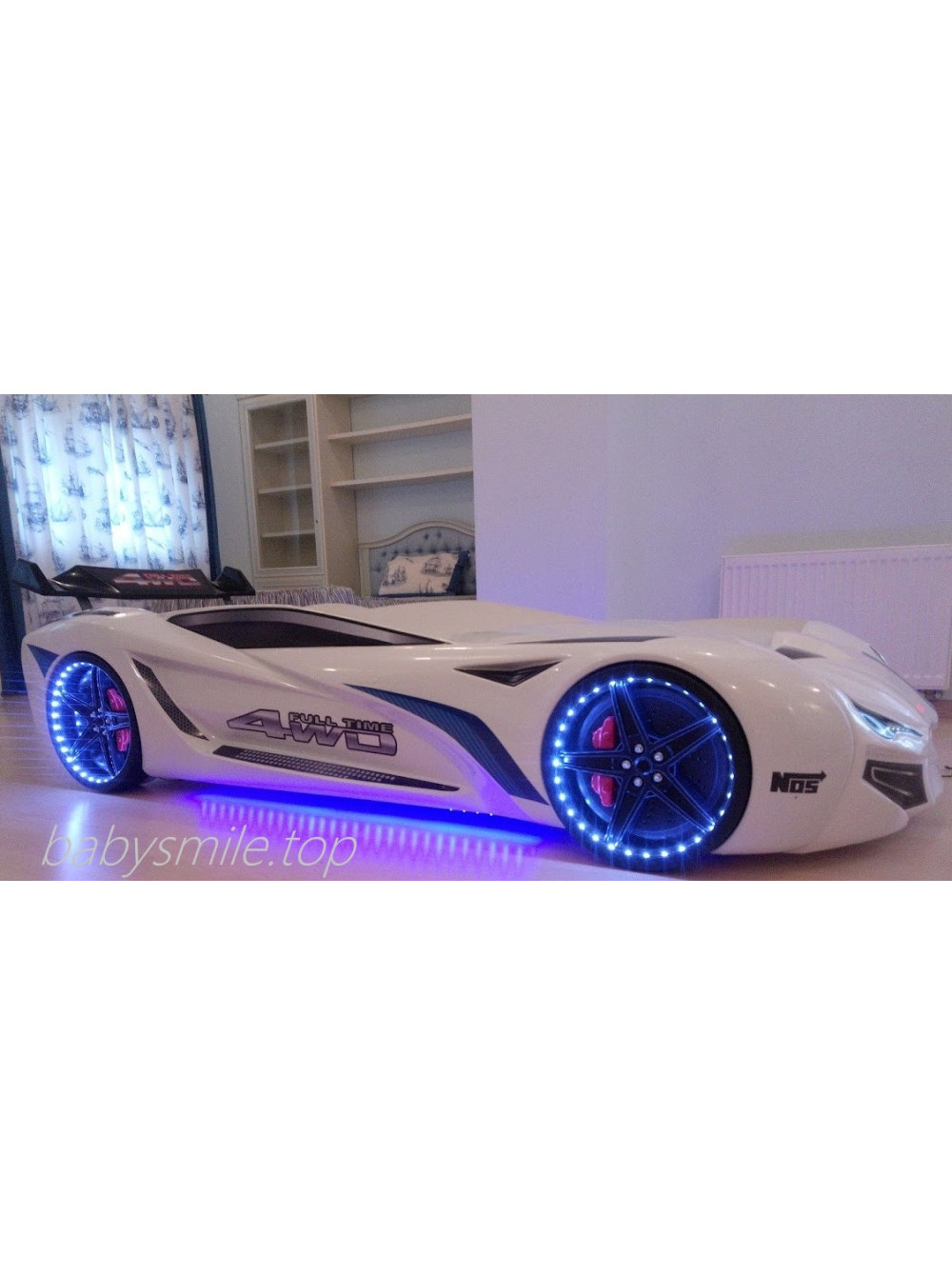 Найголовніше, що Ліжко машинка Ауді біла має досить реалістичний вигляд не тільки зовні. Вона може видавати цілком реальні звуки мотора, що заводиться, і машини, що їде, до того ж підсвічування фар, коліс і дна завершують образ сучасного автомобіля. Таке підсвічування можна використовувати замість нічника, якщо ваша дитина боїться спати в повній темряві.