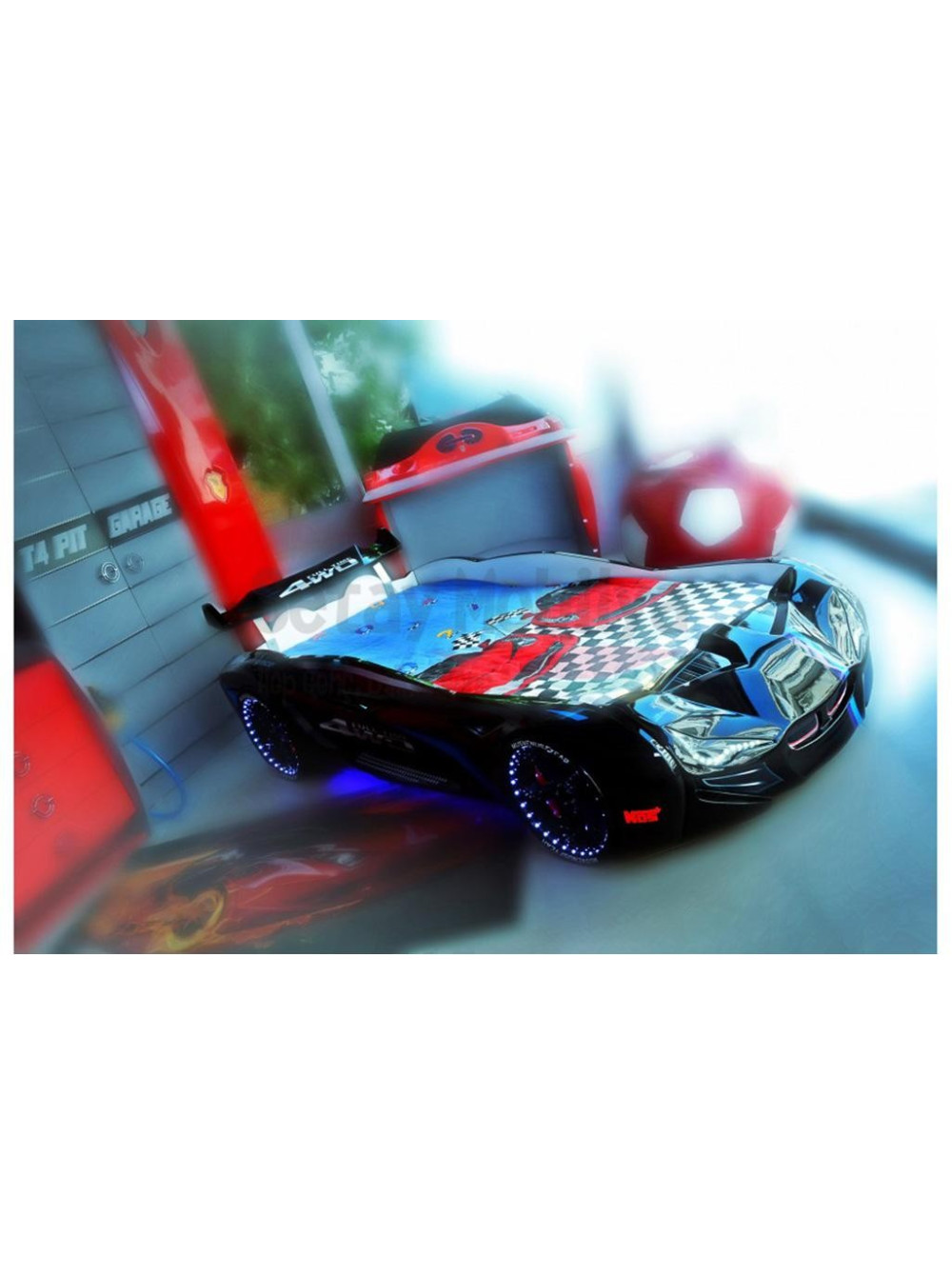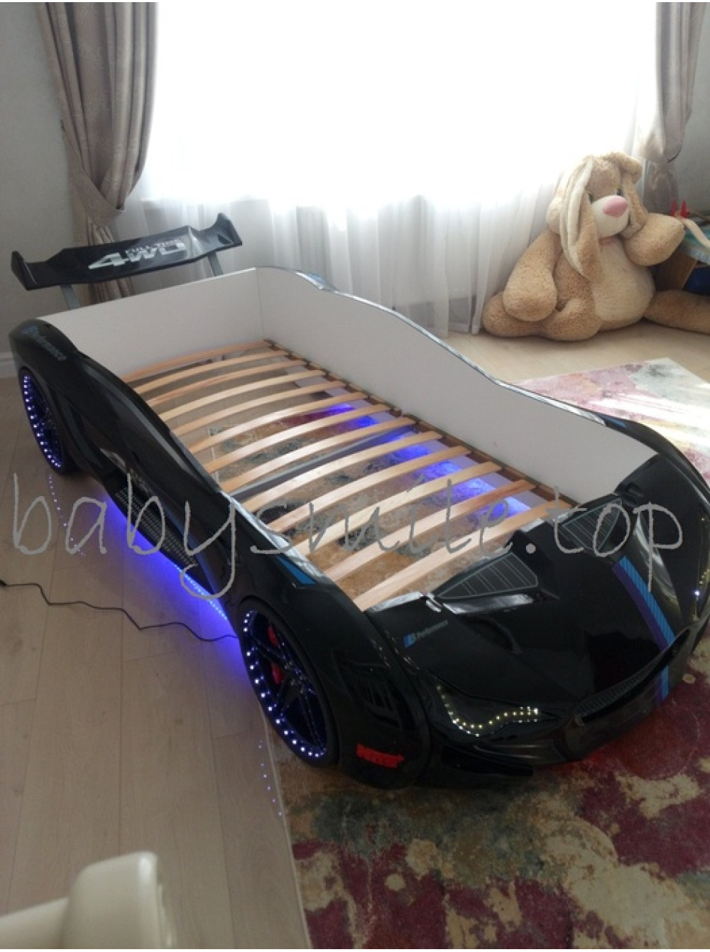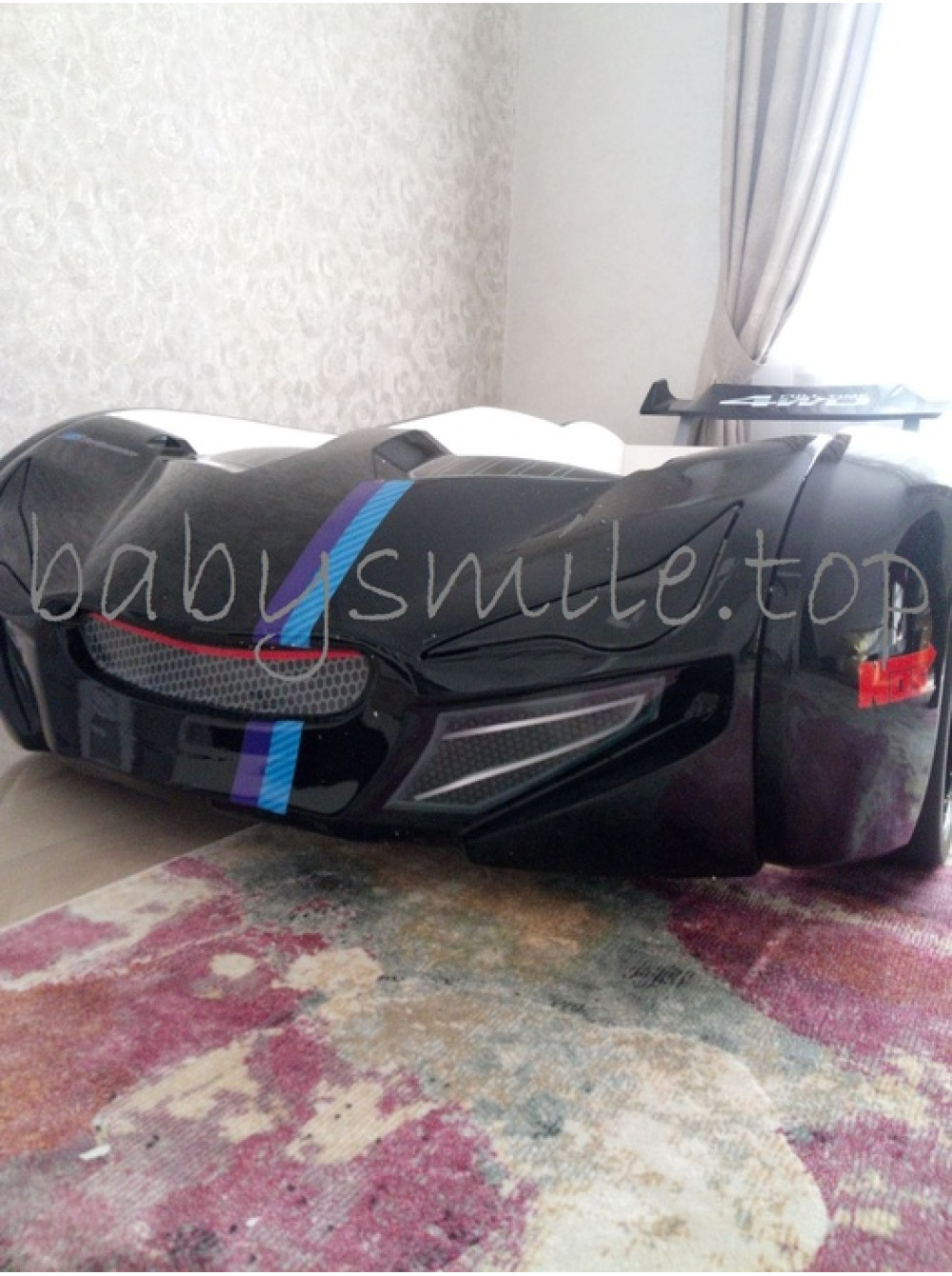 Найголовніше, що Ліжко машина BMW чорне виглядає реалістично не тільки зовні. Вона може видавати цілком реальні звуки мотора, що заводиться, і машини, що їде, до того ж підсвічування фар, коліс і дна завершують образ сучасного автомобіля. Таке підсвічування можна використовувати замість нічника, якщо ваша дитина боїться спати в повній темряві.