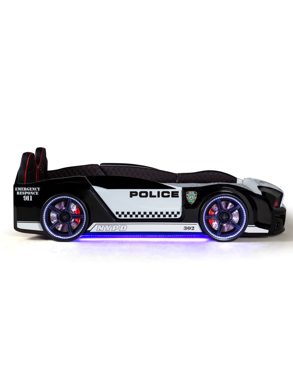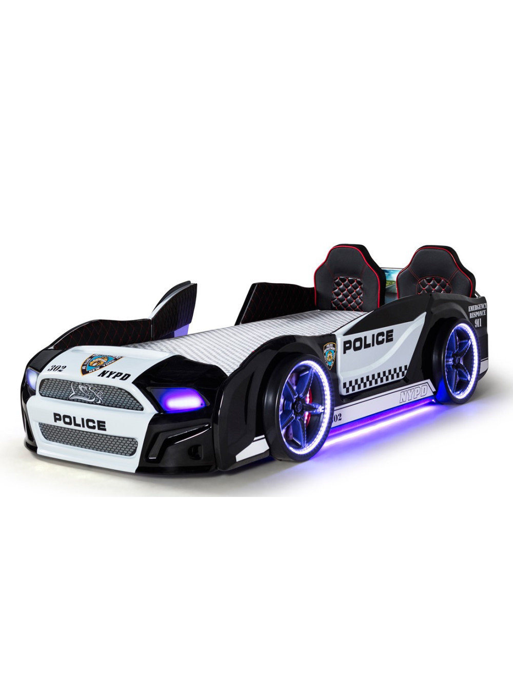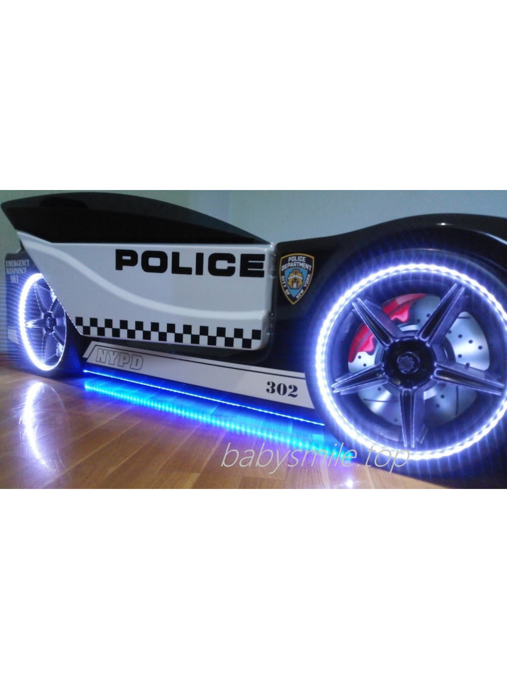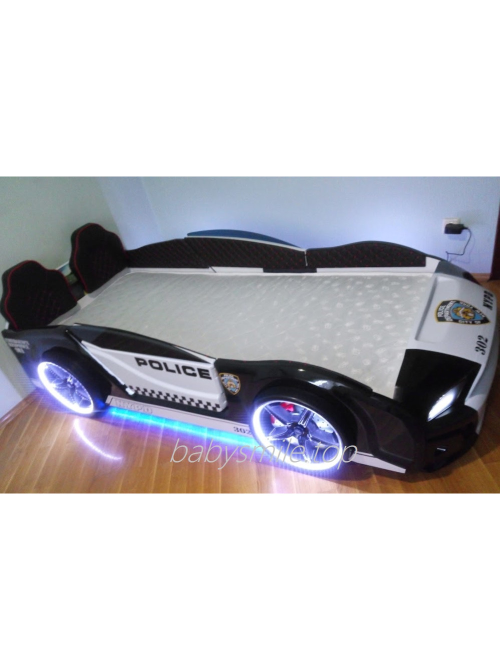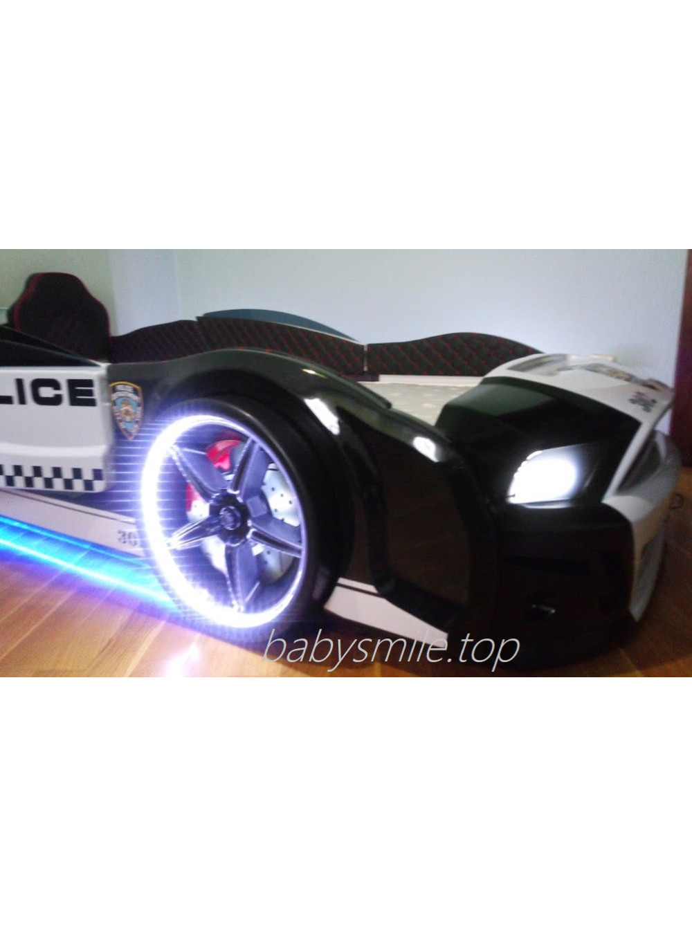 Ліжко Поліцейська машина з підсвічуванням і дверима, що відкриваються з шкіряними сидіннями - швидка, яскрава, барвиста і дуже крута з множиною анімаційних функцій. У цій моделі світяться фари, колеса і дно автомобіля. У комплекті пульт управління звуками і світлом.